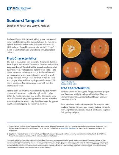 Sunburst (Figure 1) is the most widely grown commercial early Florida tangerine. It is a cross between the two citrus hybrids Robinson and Osceola. This cross was made in 1961 and was released for commercial use in 1979 by C. J. Hearn of the United States Department of Agriculture in Orlando.