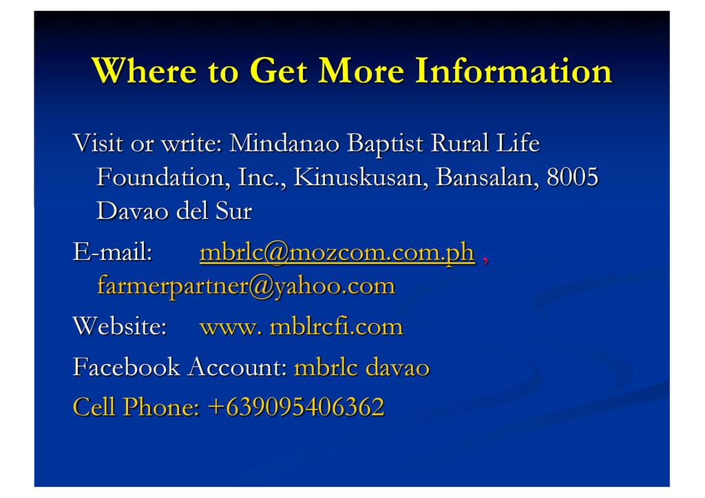 Understanding the situation and condition of communities as well as individual farmers is key in developing a program that fits their needs. Every farmer has unique passions and desires in life, although all farmers desire development. We will explore how the Mindanao Baptist Rural Life Center (MBRLC) extension program impacted communities in the southern Philippines. We will look at MBRLC experiences with agriculture extension programs and community development activities. The result will be knowing simple principles for addressing the current farmer’s development needs.