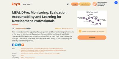 This course builds the capacity of development and humanitarian professionals in the area of Monitoring, Evaluation, Accountability and Learning (MEAL). Learners will increase their understanding of MEAL, test their new knowledge through case-based scenarios, and enhance their ability to track the progress and impact of their projects.