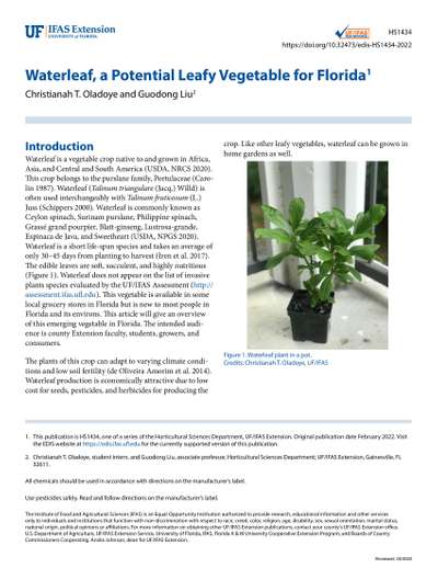 Waterleaf is a vegetable crop native to and grown in Africa, Asia, and Central and South America (USDA, NRCS 2020). This crop belongs to the purslane family, Portulaceae (Carolin 1987). Waterleaf (Talinum triangulare (Jacq.) Willd) is often used interchangeably with Talinum fruticosum (L.) Juss (Schippers 2000). Waterleaf is commonly known as Ceylon spinach, Surinam purslane, Philippine spinach, Grassé grand pourpier, Blatt-ginseng, Lustrosa-grande, Espinaca de Java, and Sweetheart (USDA, NPGS 2020). Waterleaf is a short life-span species and takes an average of only 30–45 days from planting to harvest (Iren et al. 2017). The edible leaves are soft, succulent, and highly nutritious (Figure 1). Waterleaf does not appear on the list of invasive plants species evaluated by the UF/IFAS Assessment (http:// assessment.ifas.ufl.edu). This vegetable is available in some local grocery stores in Florida but is new to most people in Florida and its environs. This article will give an overview of this emerging vegetable in Florida. The intended audience is county Extension faculty, students, growers, and consumers.