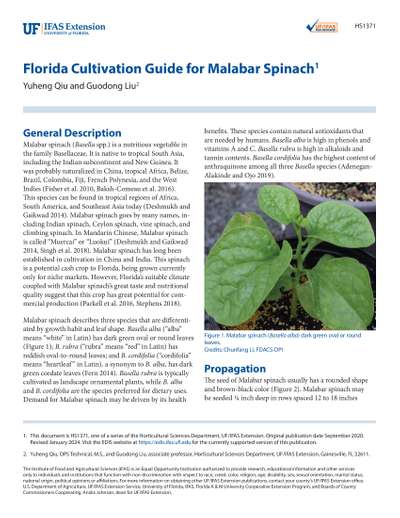 Malabar spinach (Basella spp.) is a nutritious vegetable in the family Basellaceae. It is native to tropical South Asia, including the Indian subcontinent and New Guinea. It was probably naturalized in China, tropical Africa, Belize, Brazil, Colombia, Fiji, French Polynesia, and the West Indies (Fisher et al. 2010, Baksh-Comeau et al. 2016). This species can be found in tropical regions of Africa, South America, and Southeast Asia today (Deshmukh and Gaikwad 2014). Malabar spinach goes by many names, including Indian spinach, Ceylon spinach, vine spinach, and climbing spinach. In Mandarin Chinese, Malabar spinach is called “Muercai” or “Luokui” (Deshmukh and Gaikwad 2014, Singh et al. 2018). Malabar spinach has long been established in cultivation in China and India. This spinach is a potential cash crop to Florida, being grown currently only for niche markets. However, Florida’s suitable climate coupled with Malabar spinach’s great taste and nutritional quality suggest that this crop has great potential for commercial production (Parkell et al. 2016, Stephens 2018).