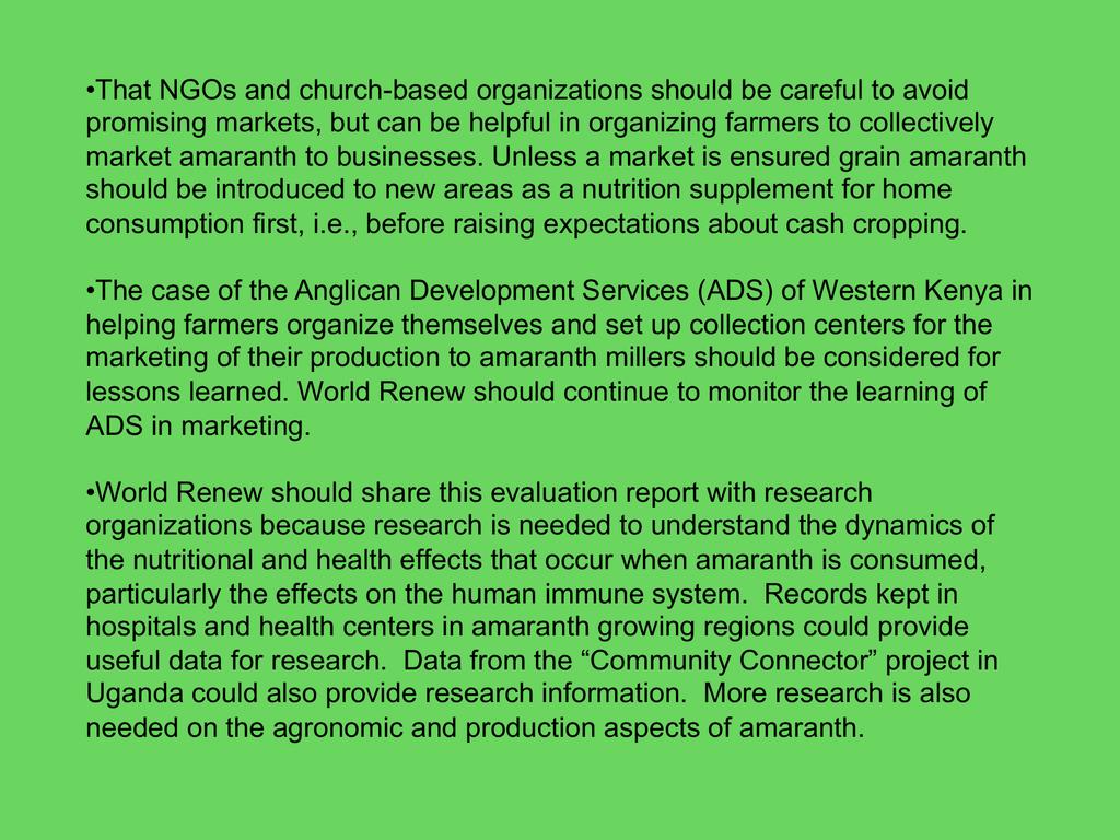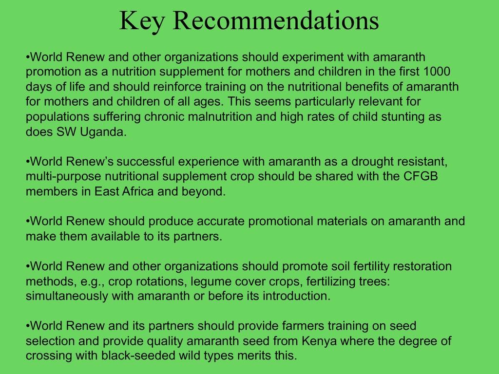 This workshop will give participants an opportunity to learn more from a evaluation done six years after finishing a 10-year promotion of amaranth initiative that World Renew spearheaded in East Africa through their partnerships, especially in Kenya and Uganda. It will go over the scope, purpose, methods used, findings, and recomendations for future amaranth promotion work in the region and worldwide.