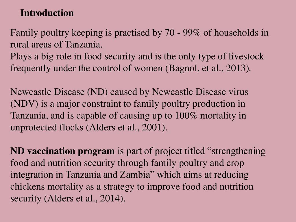 Biographical Information: Msafiri Kalloka, a researcher in Animal Science with a MBB, works in the Ministry of Livestock and Fisheries for the past 10 years with poultry as his main area of interest. Robyn Alders is a DVM and founder of KYEEMA, an organization promoting rural family poultry in developing countries. Ikunda Stanley, a master’s student works with rural poultry impacts in the Tanzania situation.