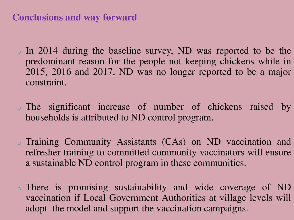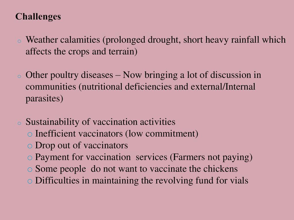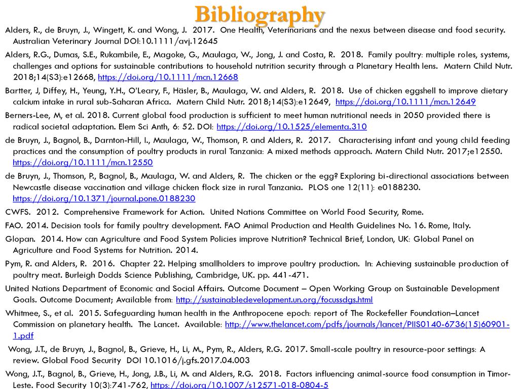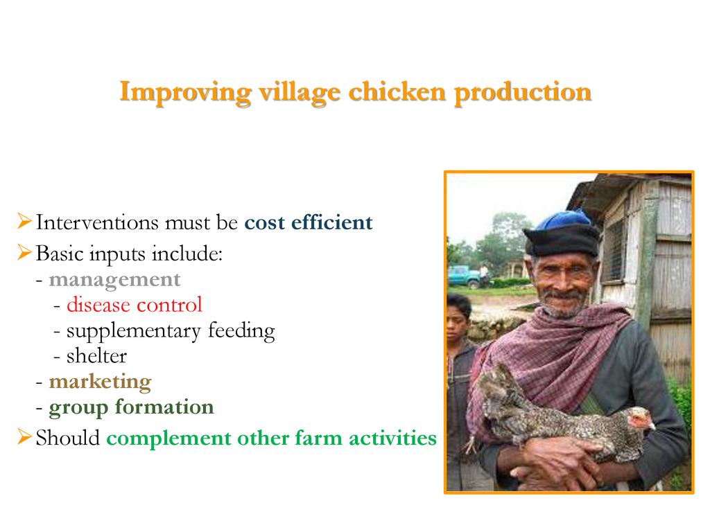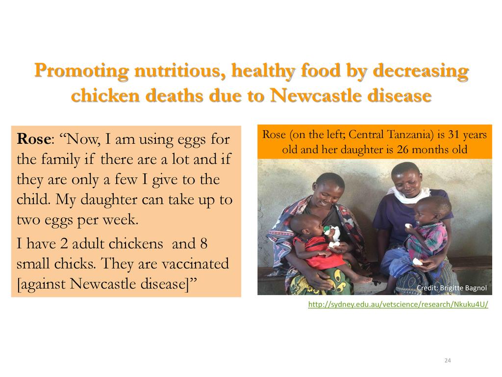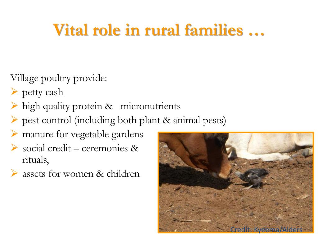 Session:  This presentation will be co-presented through a combination of video and discussion. Village chickens play a vital role in the lives of rural poor, providing meat, eggs, and income from sales which meet family needs. They are generally owned by women and children and provide food security greater than large animals. The major constraint to production is Newcastle Disease which regularly causes flock mortality of up to 100%. The development of a thermo-tolerant ND vaccine and its adoption in rural areas has made a widespread impact when promoted by community vaccinators with support of government and NGOs.