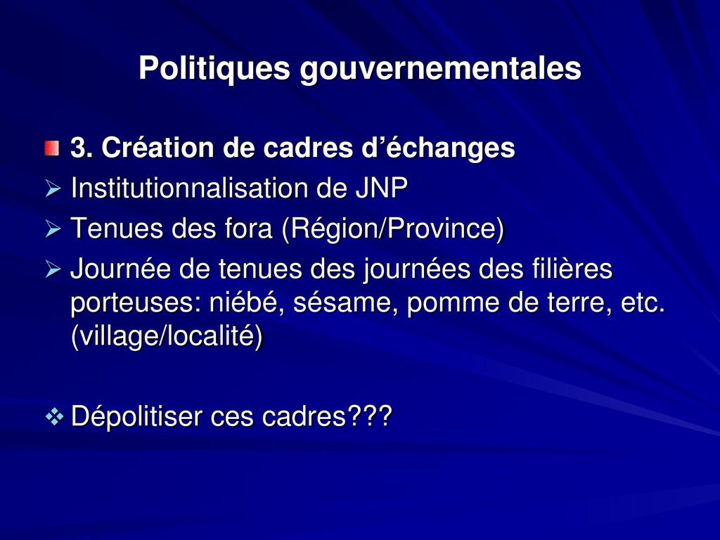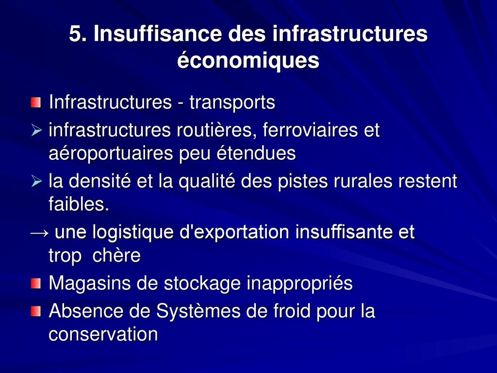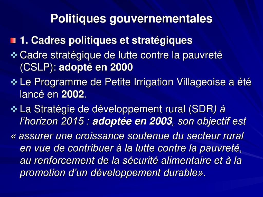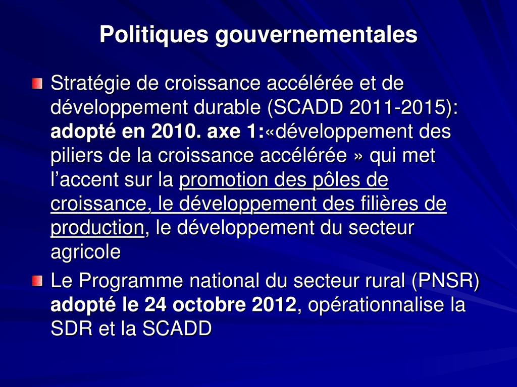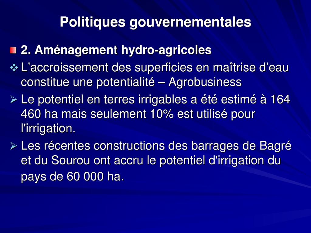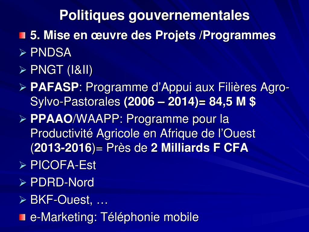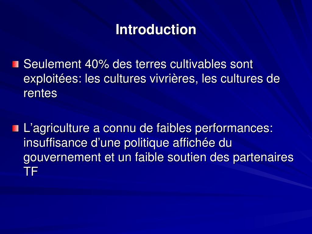- L’agriculture a connu de faibles performances: insuffisance d’une politique affichée du gouvernement et un faible soutien des partenaires TF