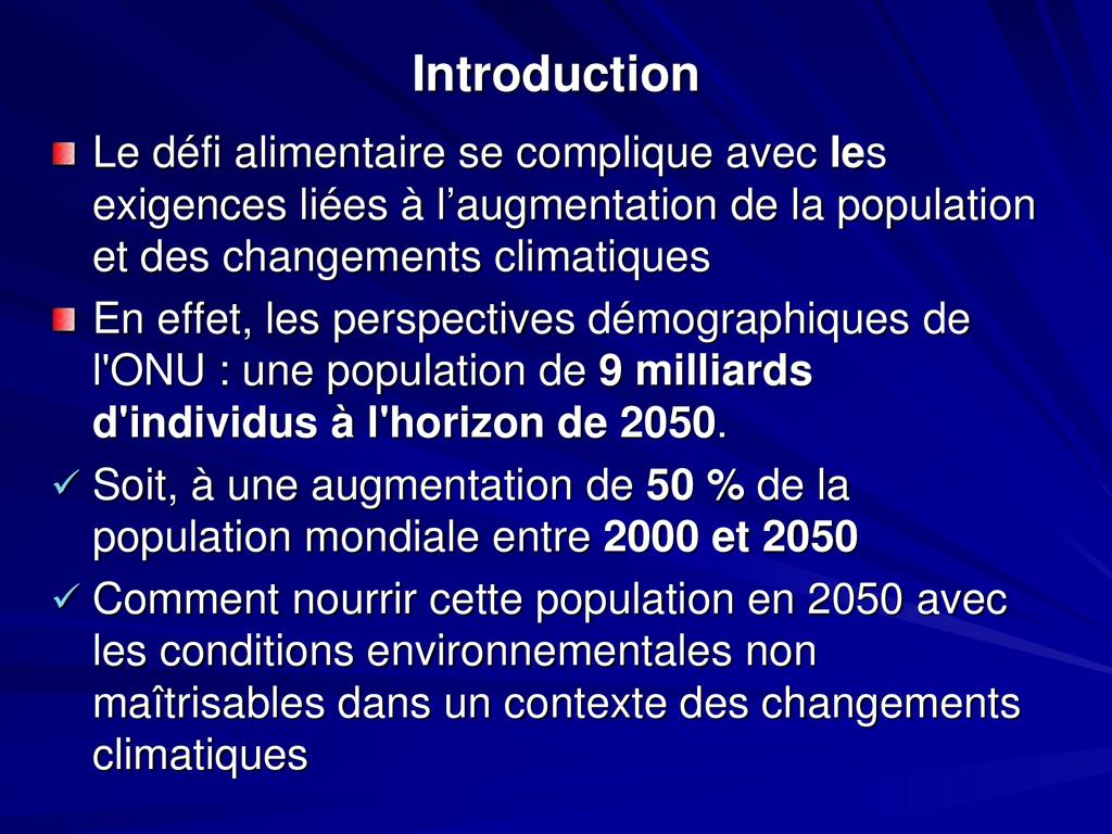 • Comment nourrir cette population en 2050 avec les conditions environnementales non maîtrisables dans un contexte des changements climatiques