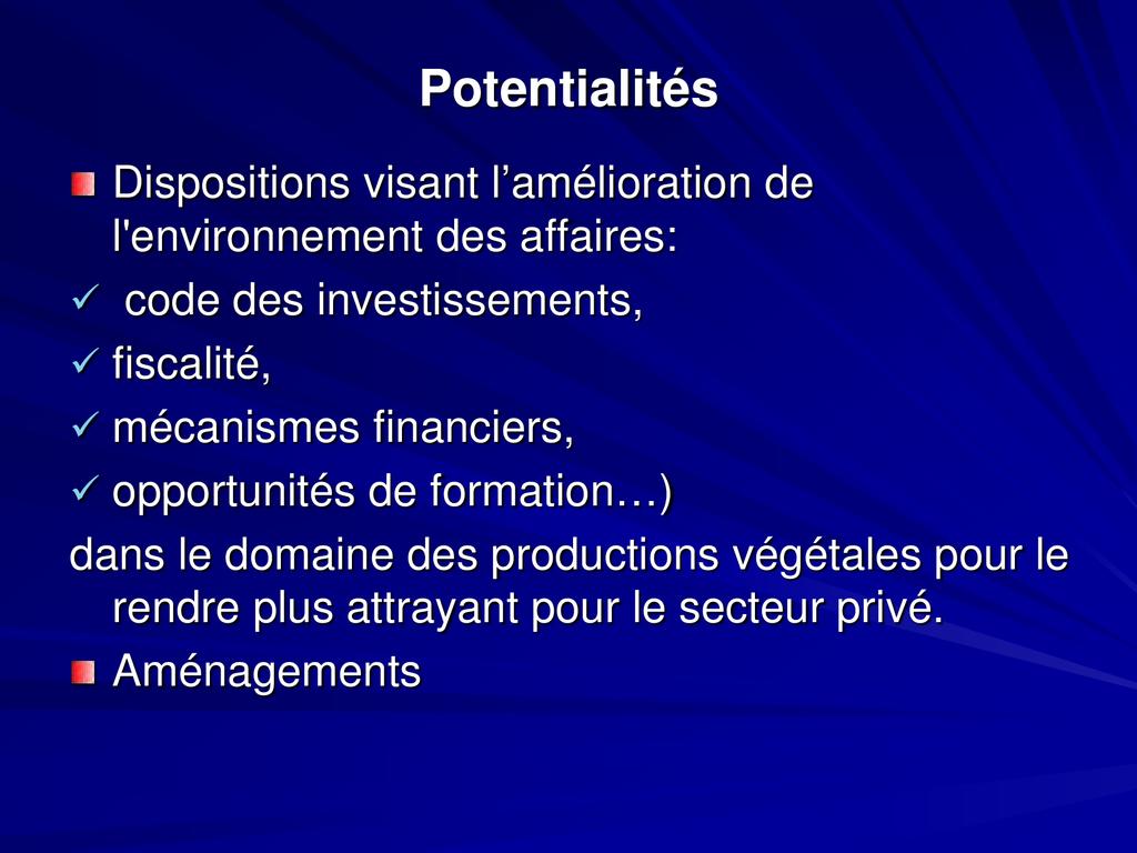 - Le secteur privé a un rôle déterminant à jouer dans le renouveau du secteur agricole et se trouve en face de plusieurs opportunités
