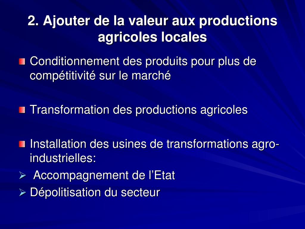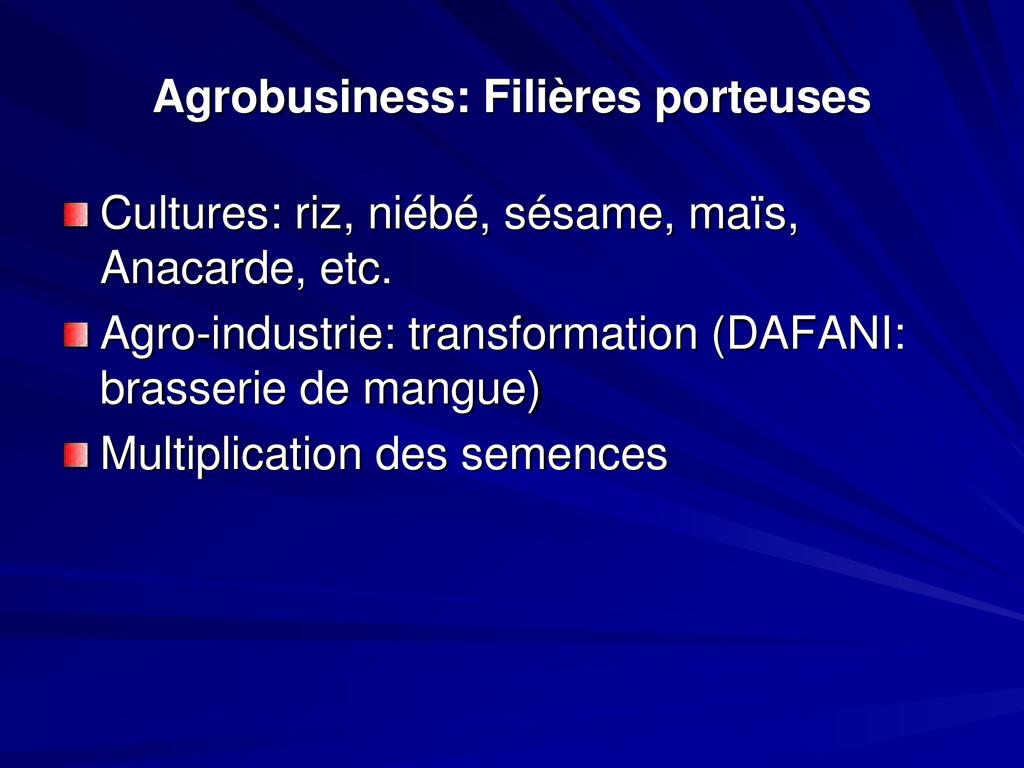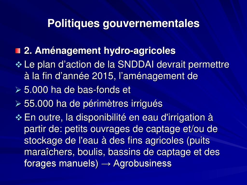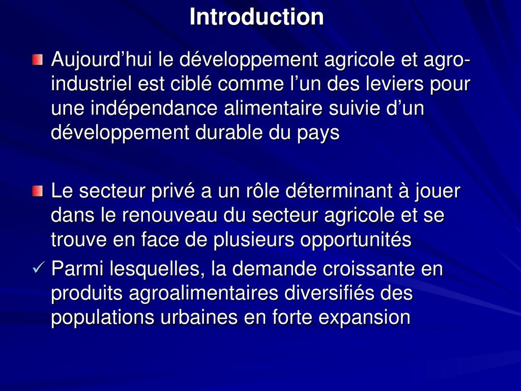 - Aujourd’hui le développement agricole et agroindustriel est ciblé comme l’un des leviers pour une indépendance alimentaire suivie d’un développement durable du pays
