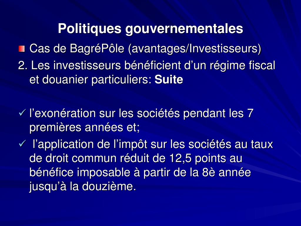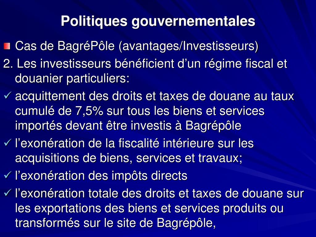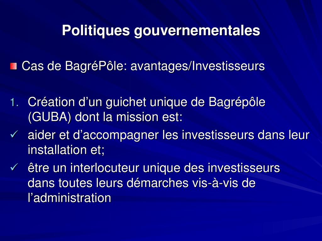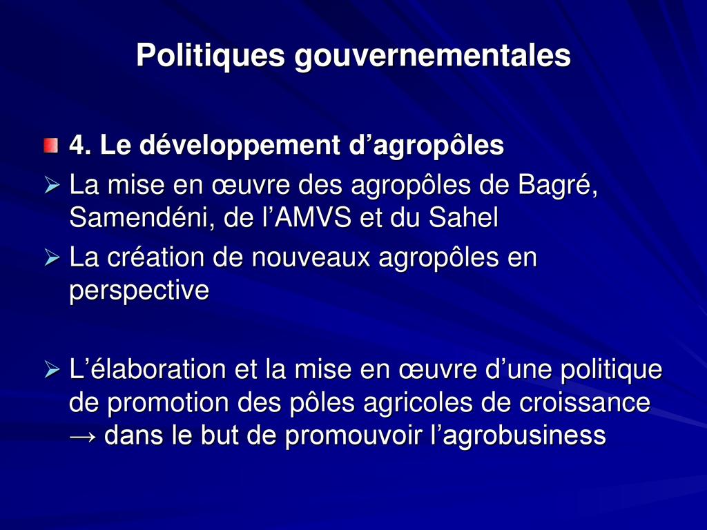 - Aujourd’hui le développement agricole et agroindustriel est ciblé comme l’un des leviers pour une indépendance alimentaire suivie d’un développement durable du pays