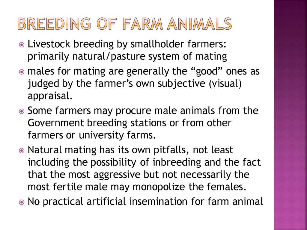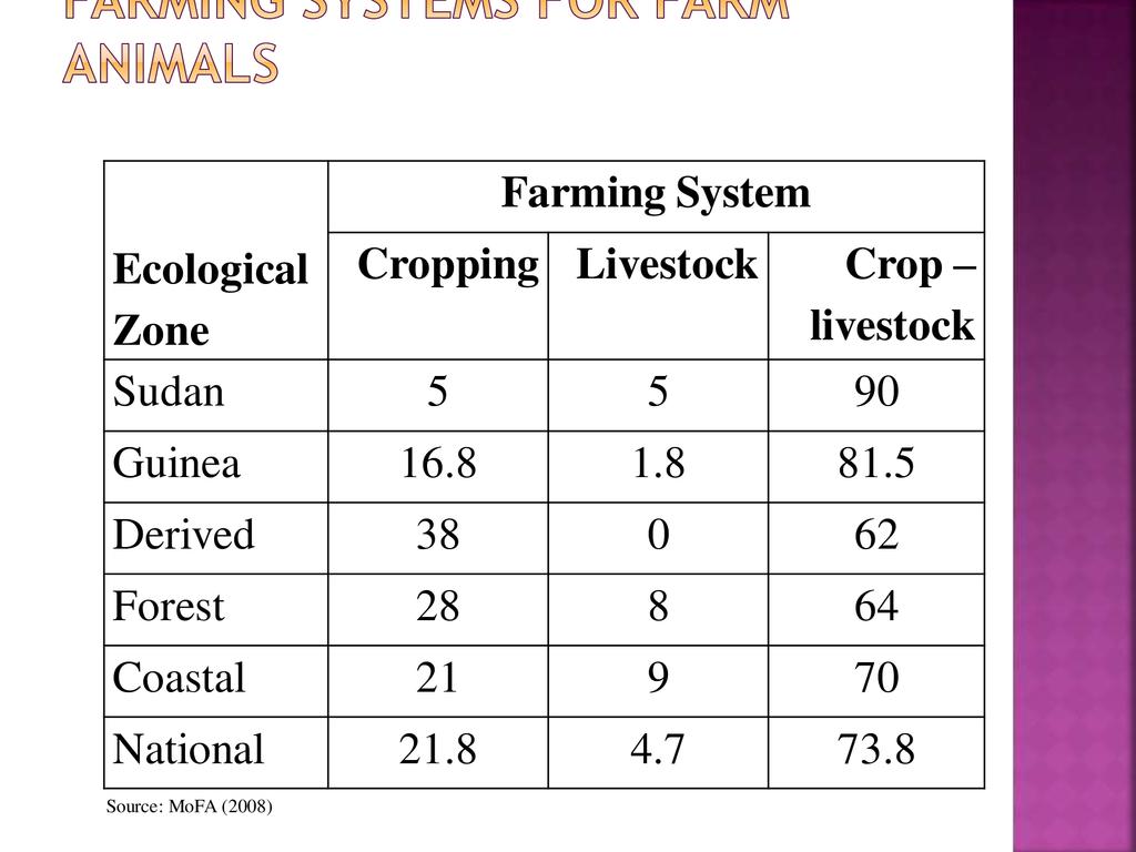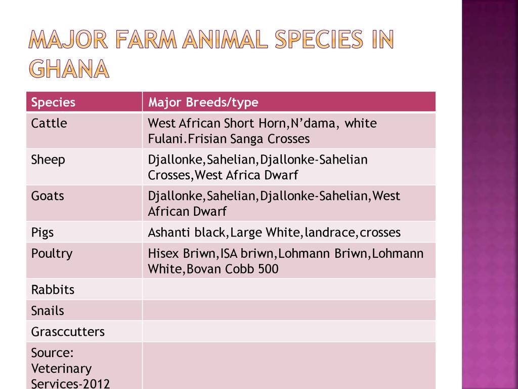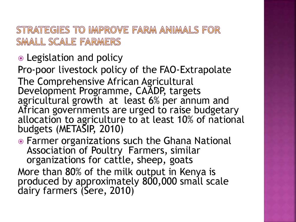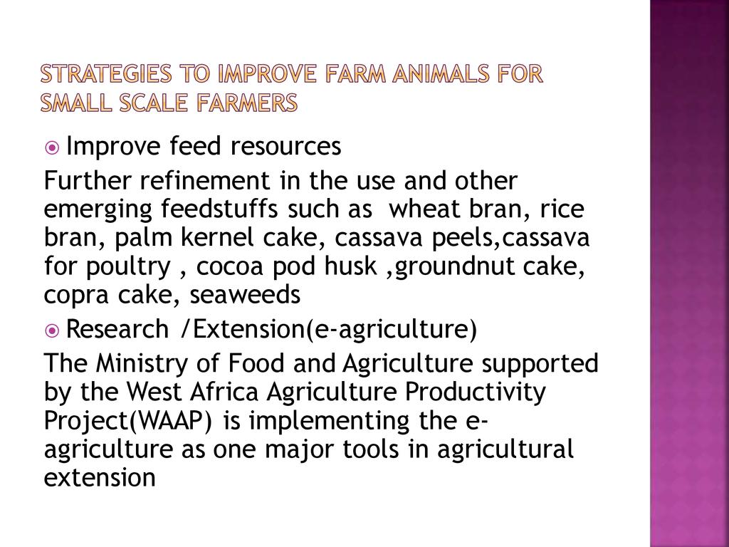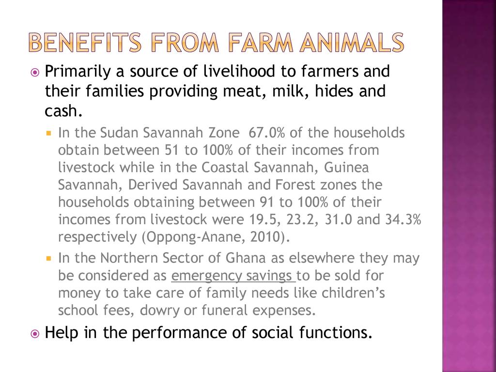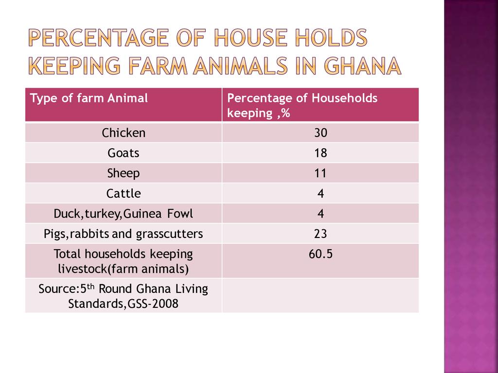 Farm animals such as large and small ruminants, monogastric and non-conventional animals provide economic stream of family income as well as livelihoods in the social and cultural domain to majority of farmers in the country. Small scale farmers form about 80% of producers of livestock and livestock products for human consumption.