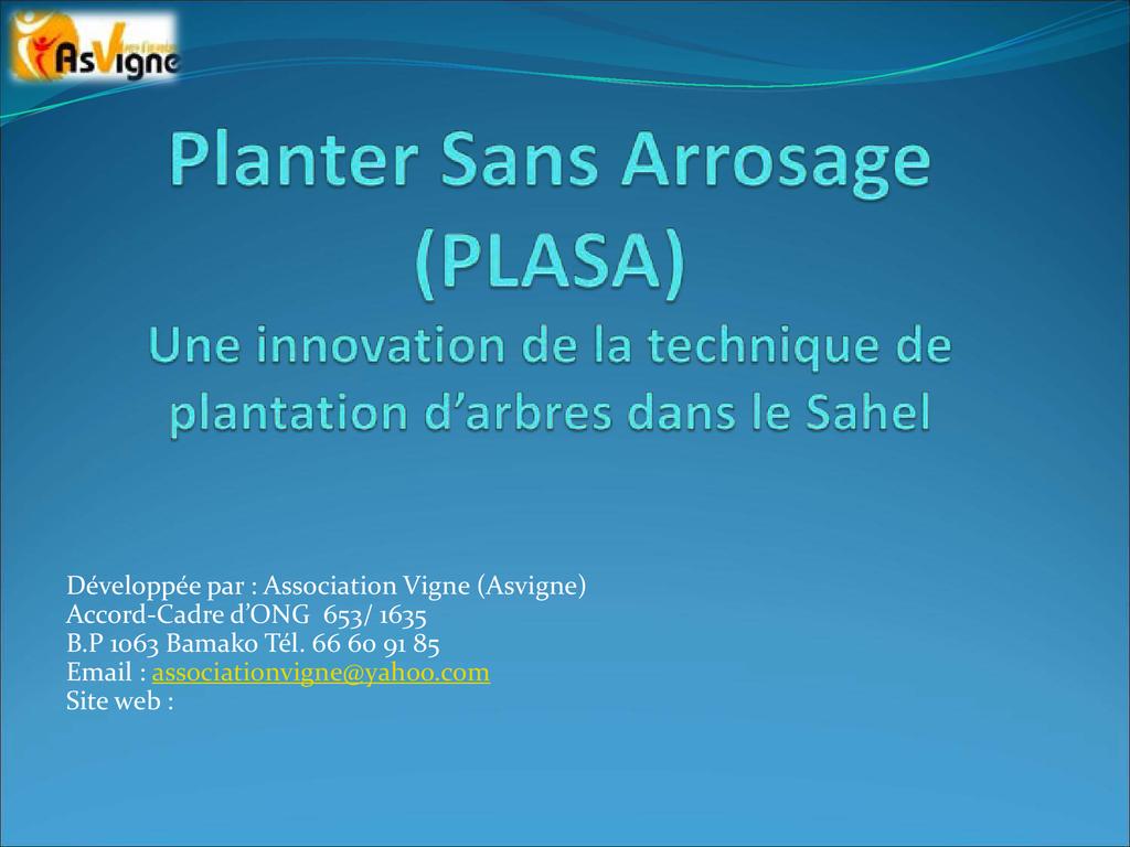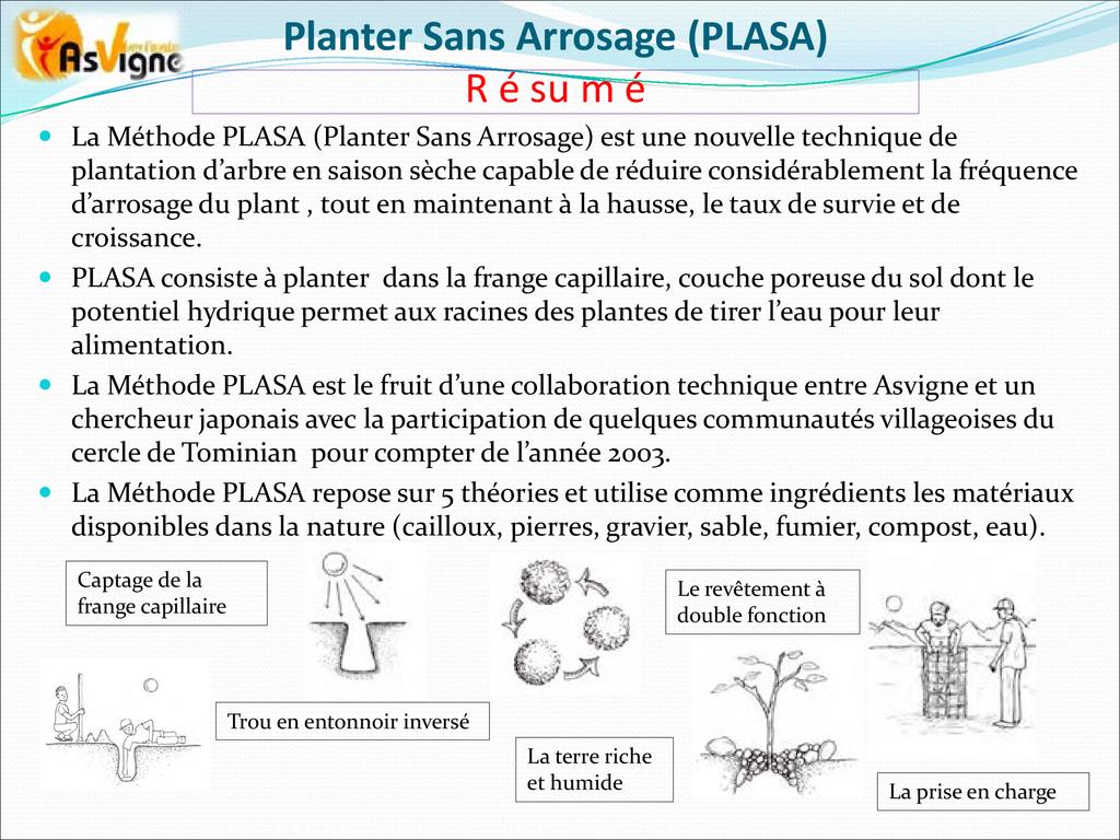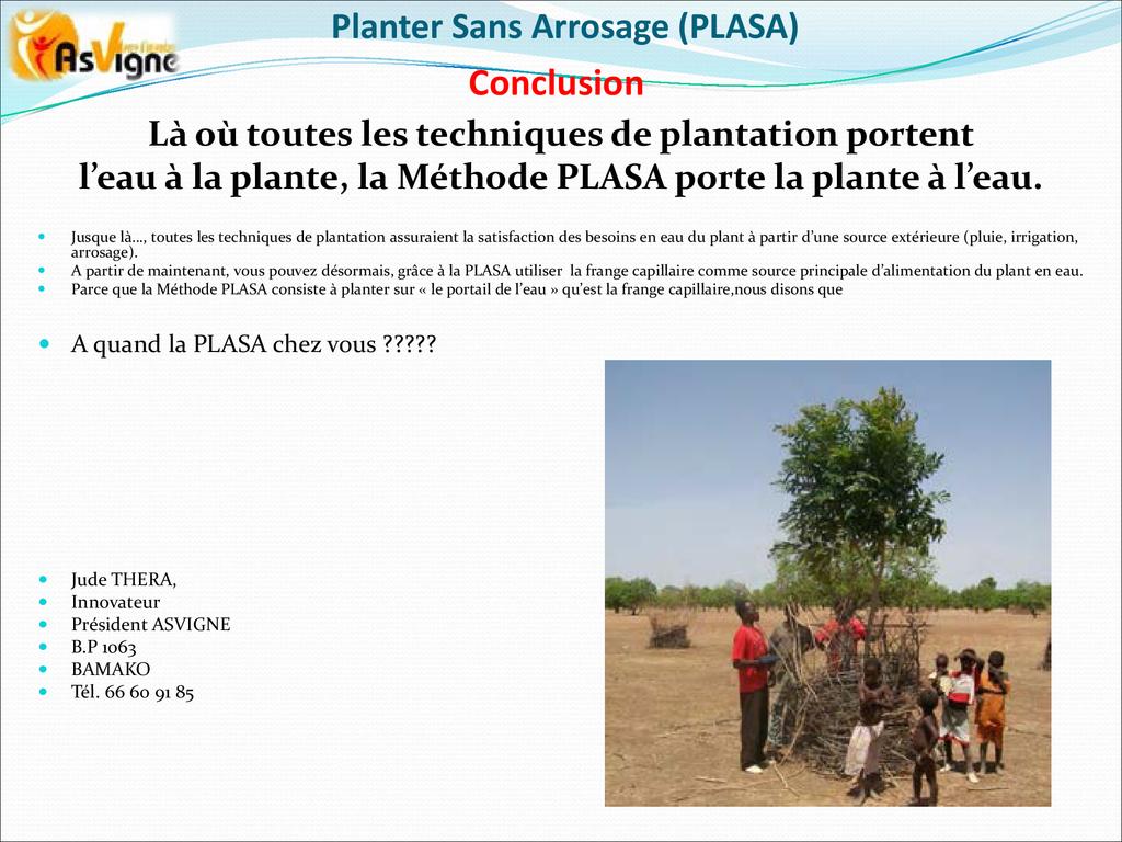 La Méthode PLASA est le fruit d’une collaboration technique entre Asvigne et un chercheur japonais avec la participation de quelques communautés villageoises du cercle de Tominian pour compter de l’année 2003.