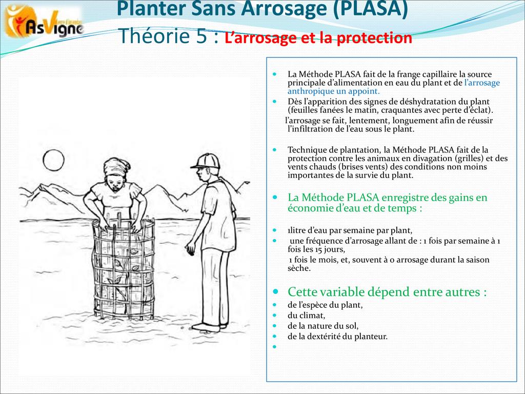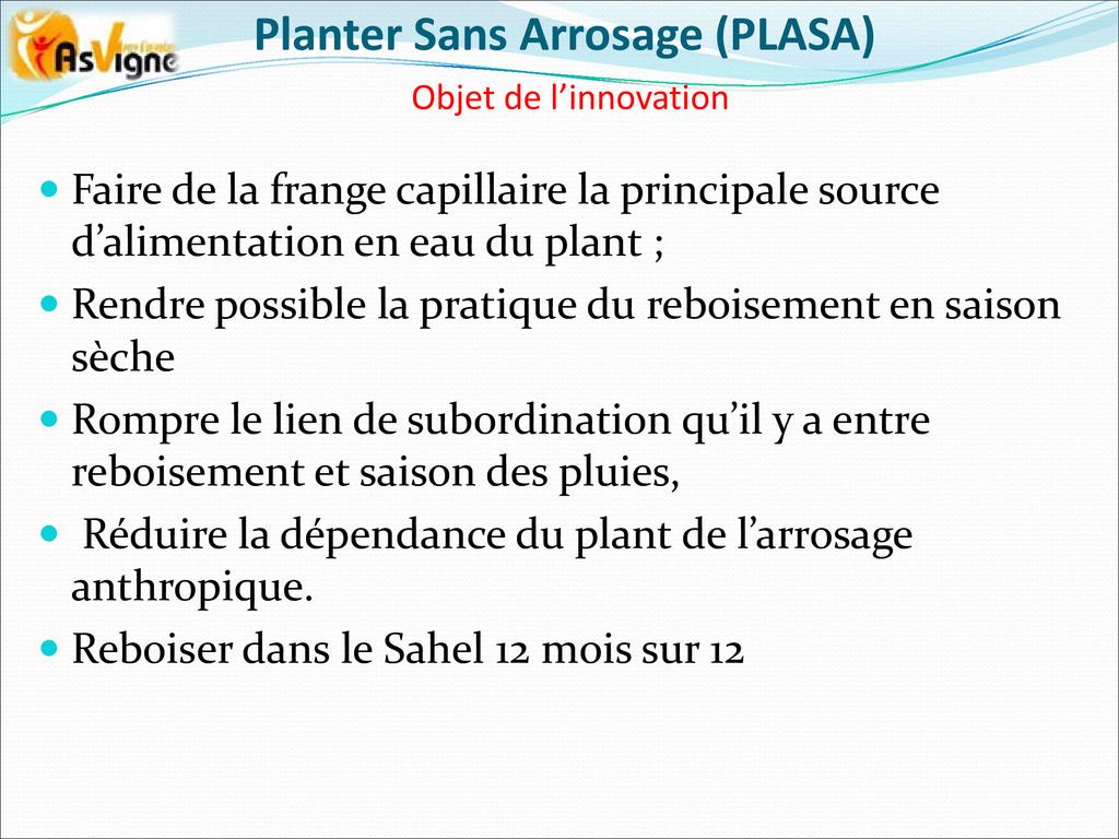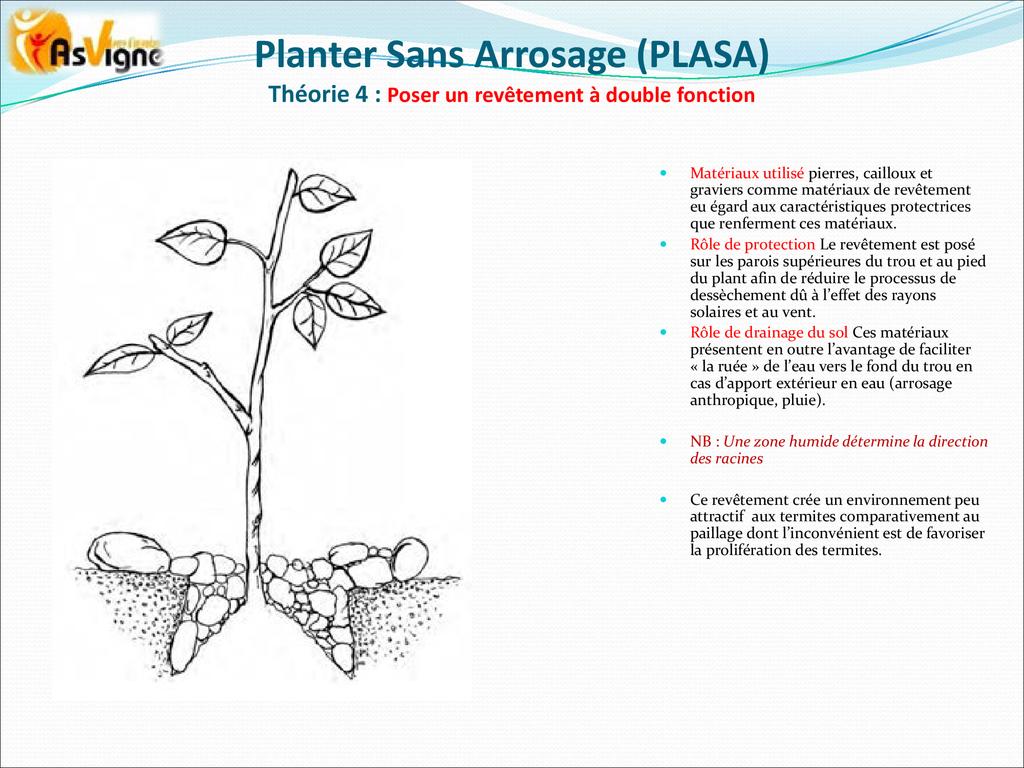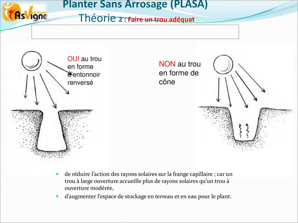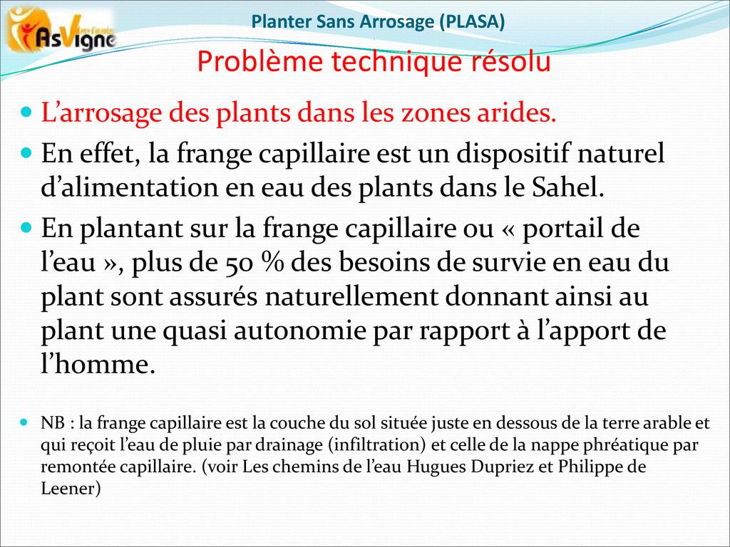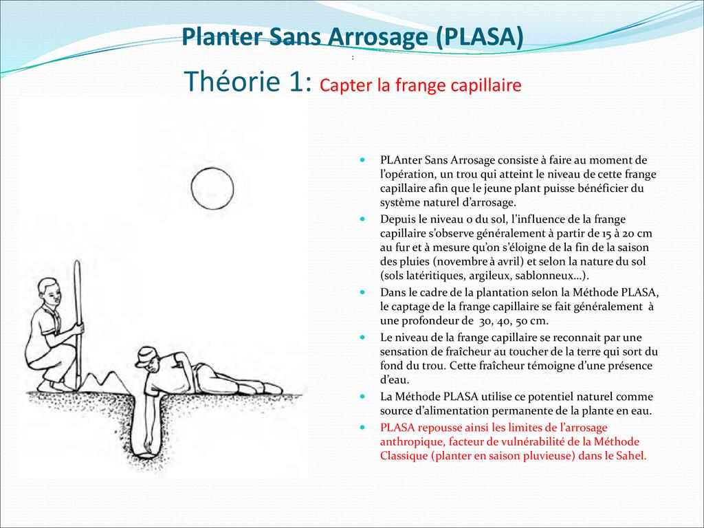 PLASA consiste à planter dans la frange capillaire, couche poreuse du sol dont le potentiel hydrique permet aux racines des plantes de tirer l’eau pour leur alimentation.