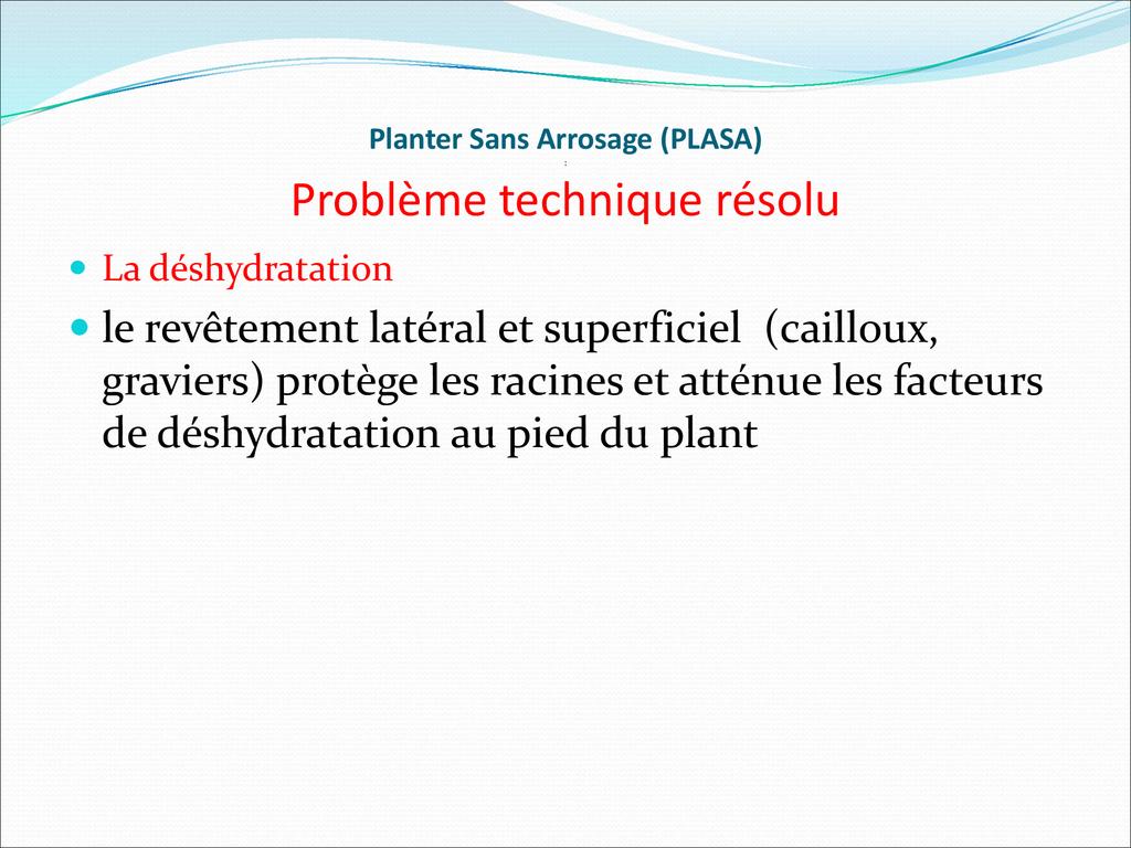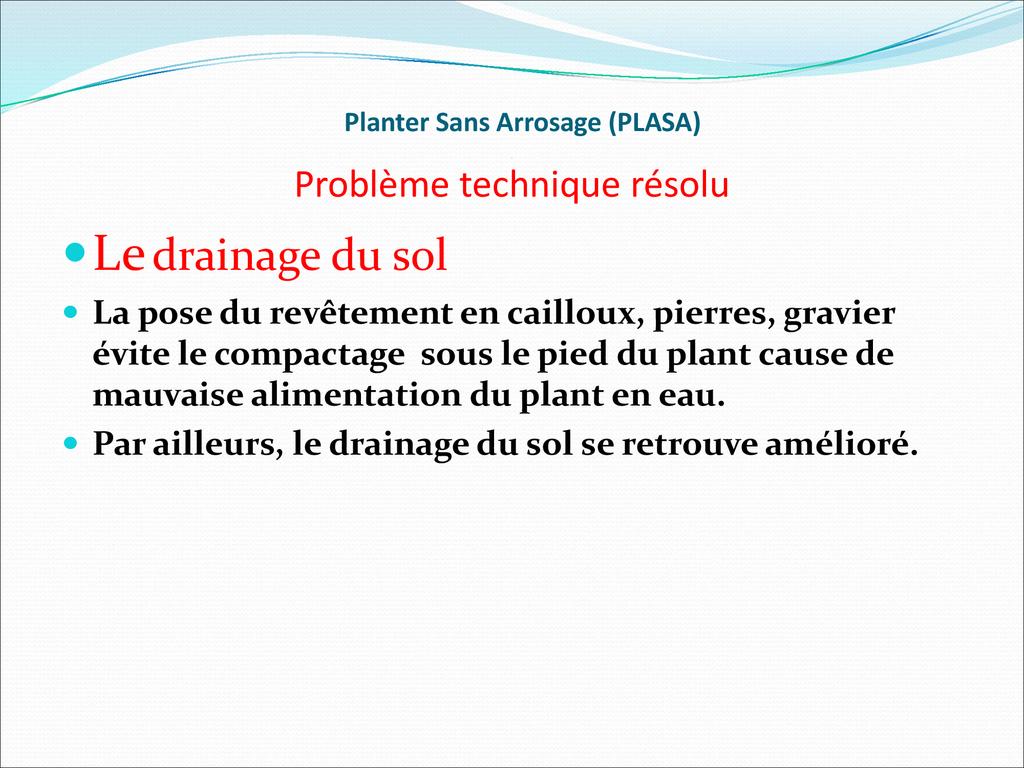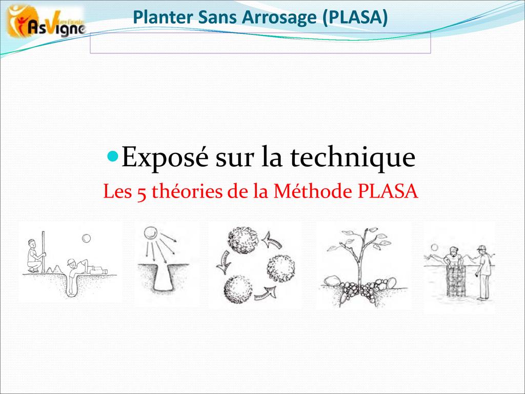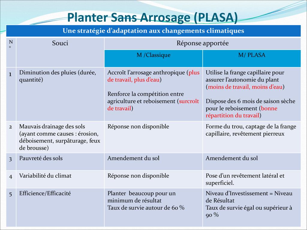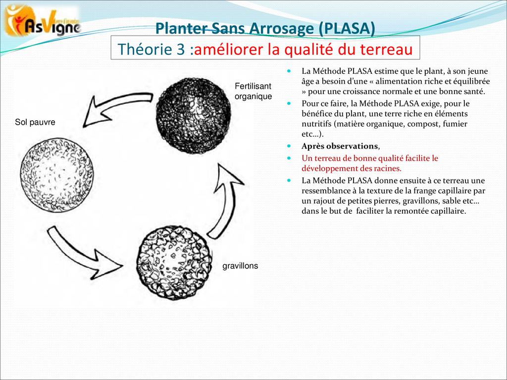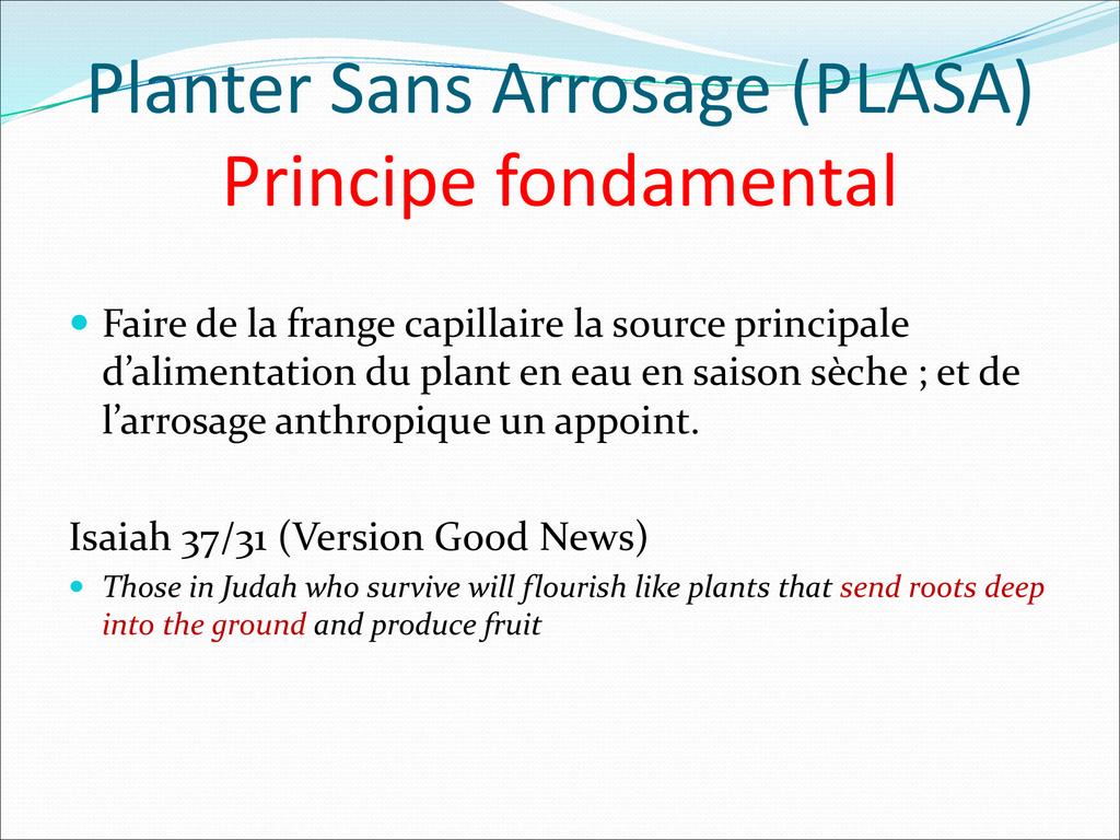 PLASA consiste à planter dans la frange capillaire, couche poreuse du sol dont le potentiel hydrique permet aux racines des plantes de tirer l’eau pour leur alimentation.