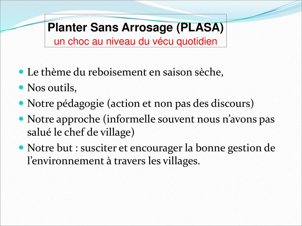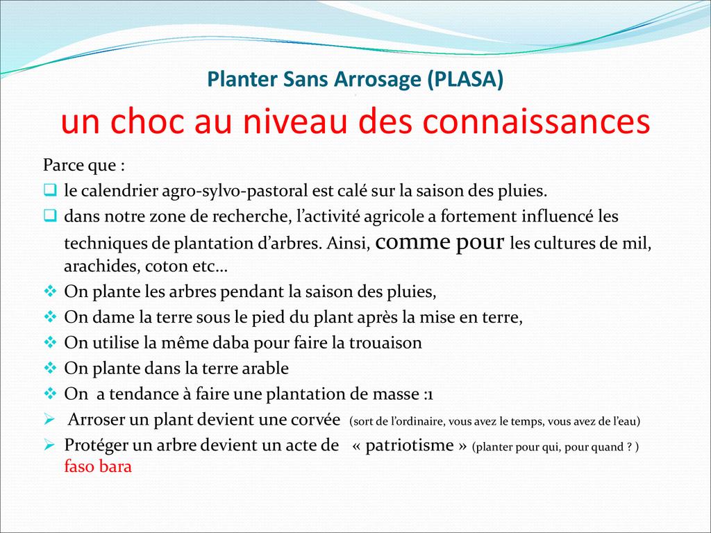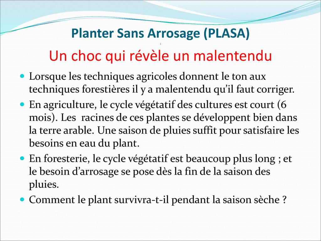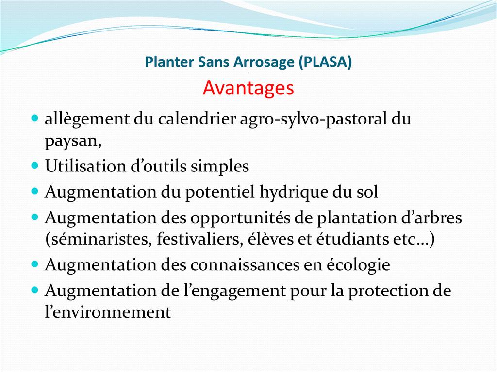 La Méthode PLASA (Planter Sans Arrosage) est une nouvelle technique de plantation d’arbre en saison sèche capable de réduire considérablement la fréquence d’arrosage du plant , tout en maintenant à la hausse, le taux de survie et de croissance.