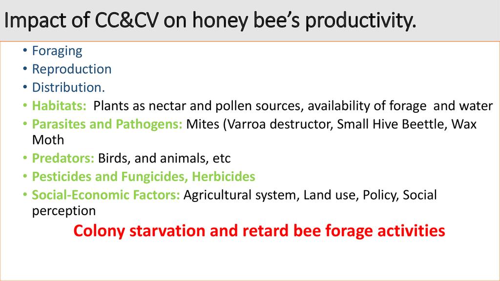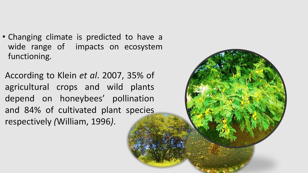 Session: Pollinators are a key component of global biodiversity, providing vital ecosystem services to crops and wild plants. There is clear evidence of recent declines in both wild and domesticated pollinators, and parallel declines in the plants that rely upon them. Here we describe the nature and extent of reported declines, and review the potential drivers of pollinator loss, including habitat loss and fragmentation, agrochemicals, pathogens, alien species, climate change and the interactions between them. Pollinator declines can result in loss of pollination services which have important negative ecological and economic impacts that could significantly affect the maintenance of wild plant diversity, wider ecosystem stability, crop production, food security and human welfare. Food security can therefore be attained through improved crop pollination and generation of extra household income from sales of bee products in most developing countries.