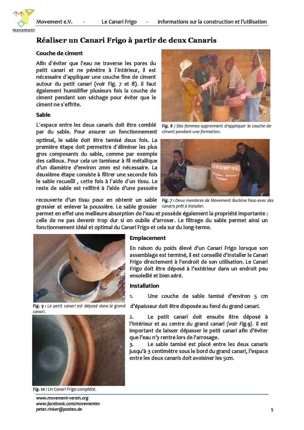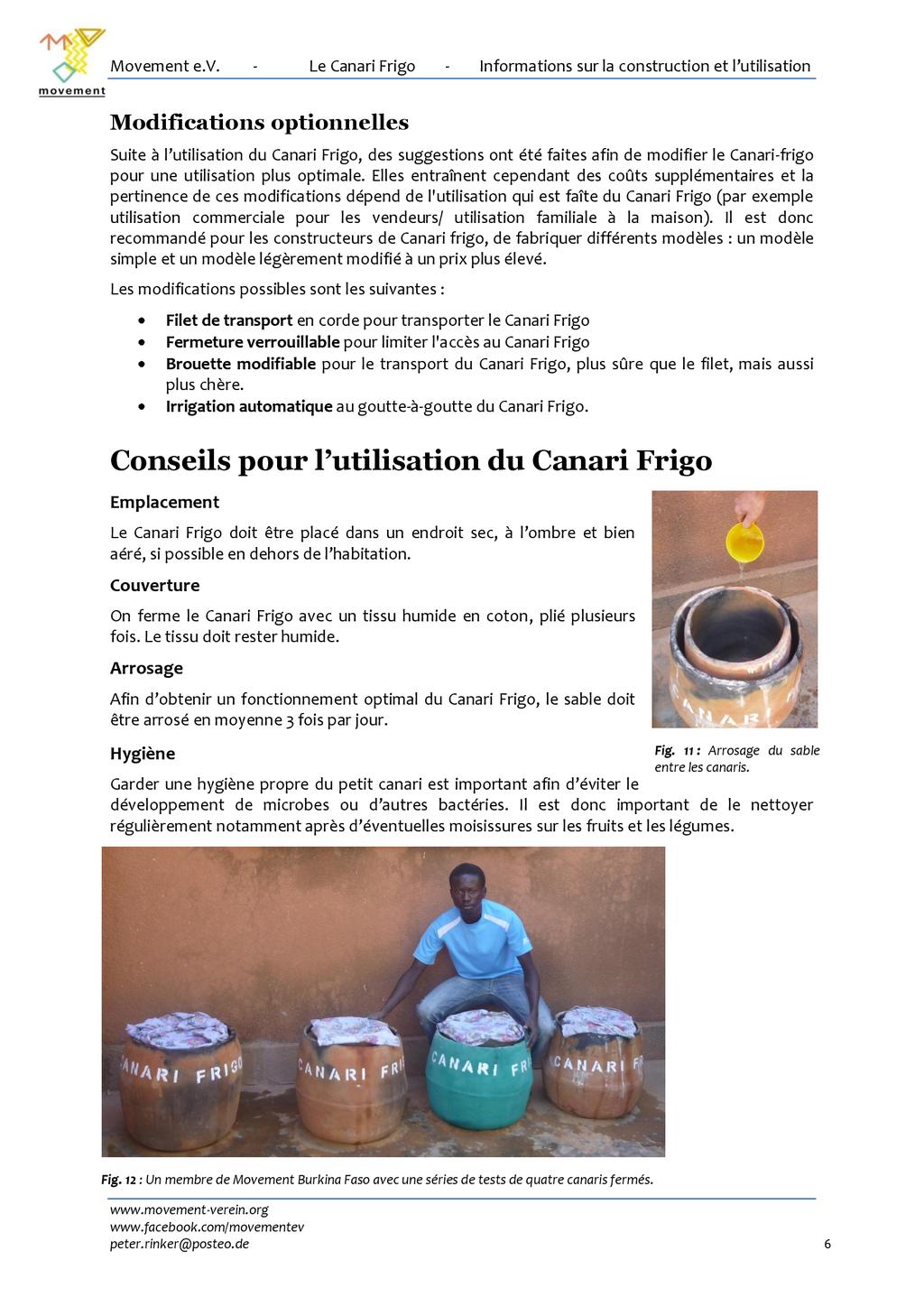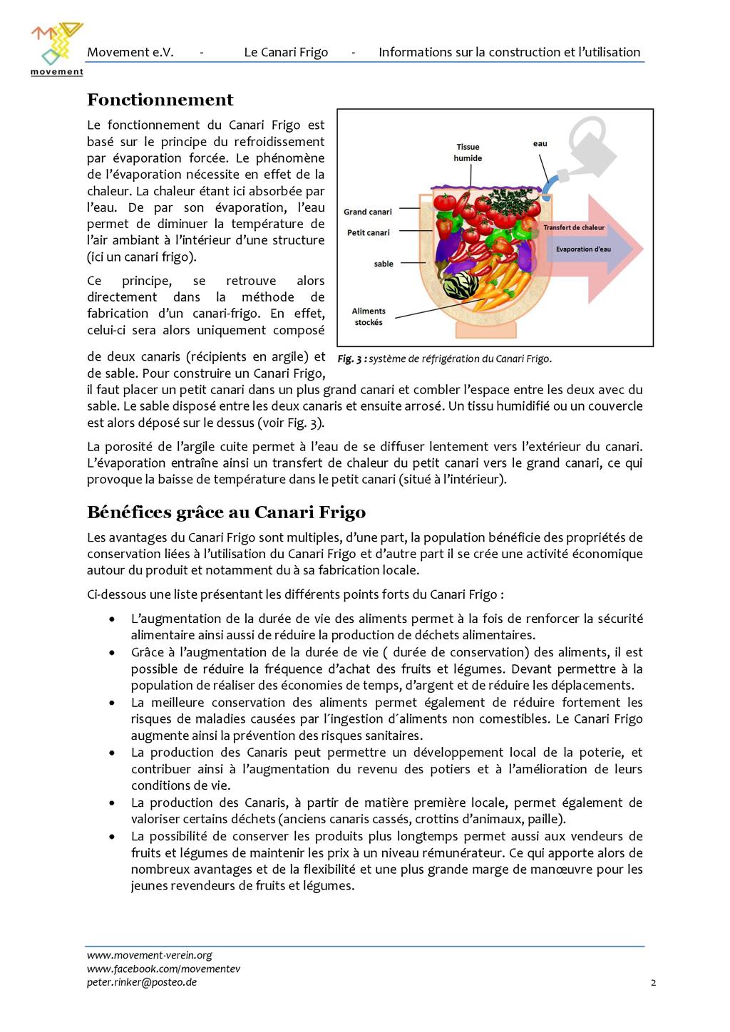 Le Canari Frigo est un moyen simple permettant de rafraichir les aliments (notamment fruits et légumes), et ne demandant que très peu de moyens financiers. La fonction de rafraichissement est basée sur le principe de l’évaporation et ne nécessite pas d’électricité. Avec ce système, il est possible d’obtenir une température allant jusque 13 à 22°C, alors que la température extérieure peut avoisiner les 40°C. Ce mode de rafraichissement représente donc un système très intéressant pour les pays dont le climat est chaud et sec. Ces conditions climatiques sont par exemple réunies dans les zones de l’Est et de l’Ouest de l’Afrique. Dans cette partie du continent, les Hommes n’ont pour la plupart aucun autre moyen que le Canara Frigo pour rafraichir leurs aliments.