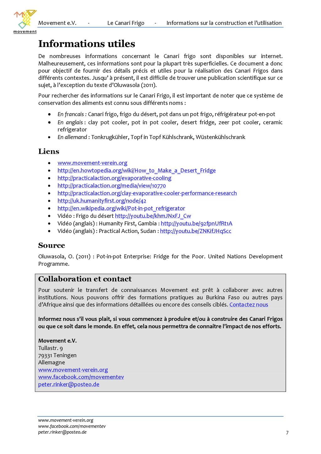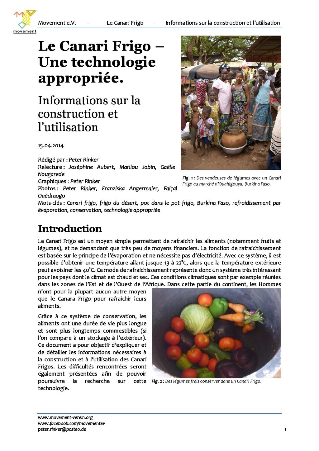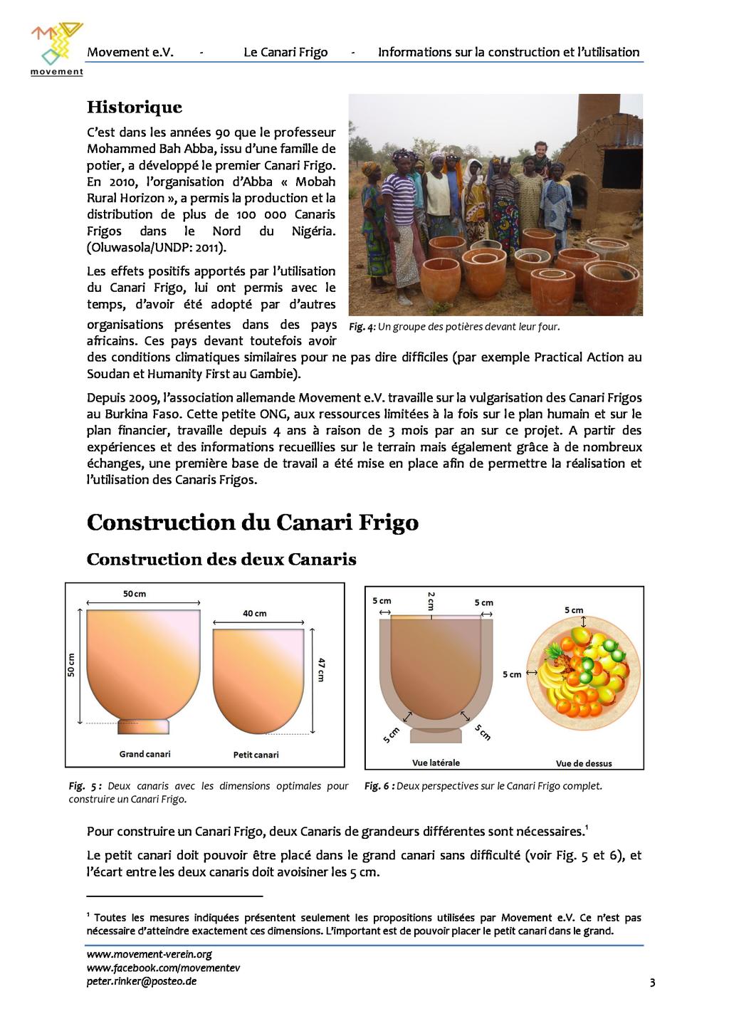 Le Canari Frigo est un moyen simple permettant de rafraichir les aliments (notamment fruits et légumes), et ne demandant que très peu de moyens financiers. La fonction de rafraichissement est basée sur le principe de l’évaporation et ne nécessite pas d’électricité. Avec ce système, il est possible d’obtenir une température allant jusque 13 à 22°C, alors que la température extérieure peut avoisiner les 40°C. Ce mode de rafraichissement représente donc un système très intéressant pour les pays dont le climat est chaud et sec. Ces conditions climatiques sont par exemple réunies dans les zones de l’Est et de l’Ouest de l’Afrique. Dans cette partie du continent, les Hommes n’ont pour la plupart aucun autre moyen que le Canara Frigo pour rafraichir leurs aliments.