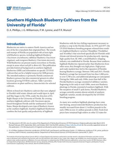 Blueberries are native to eastern North America and are one of the few crop plants that originated here. The woods and swamps of Florida are populated with at least eight wild blueberry species, including highbush blueberry (Vaccinium corymbosum), rabbiteye blueberry (Vaccinium virgatum), and evergreen blueberry (Vaccinium darrowii). Wild blueberries are present nearly everywhere in Florida, except in areas where soil pH is above 6.0. This publication provides historical background on southern highbush blueberries (SHB) and information on specific UF/IFAS cultivars that can be a helpful resource for SHB growers. The intended audience is primarily Florida commercial blueberry growers but also commercial growers in other locations growing UF/IFAS cultivars. Table 1 provides information on plant and berry characteristics for selected cultivars.