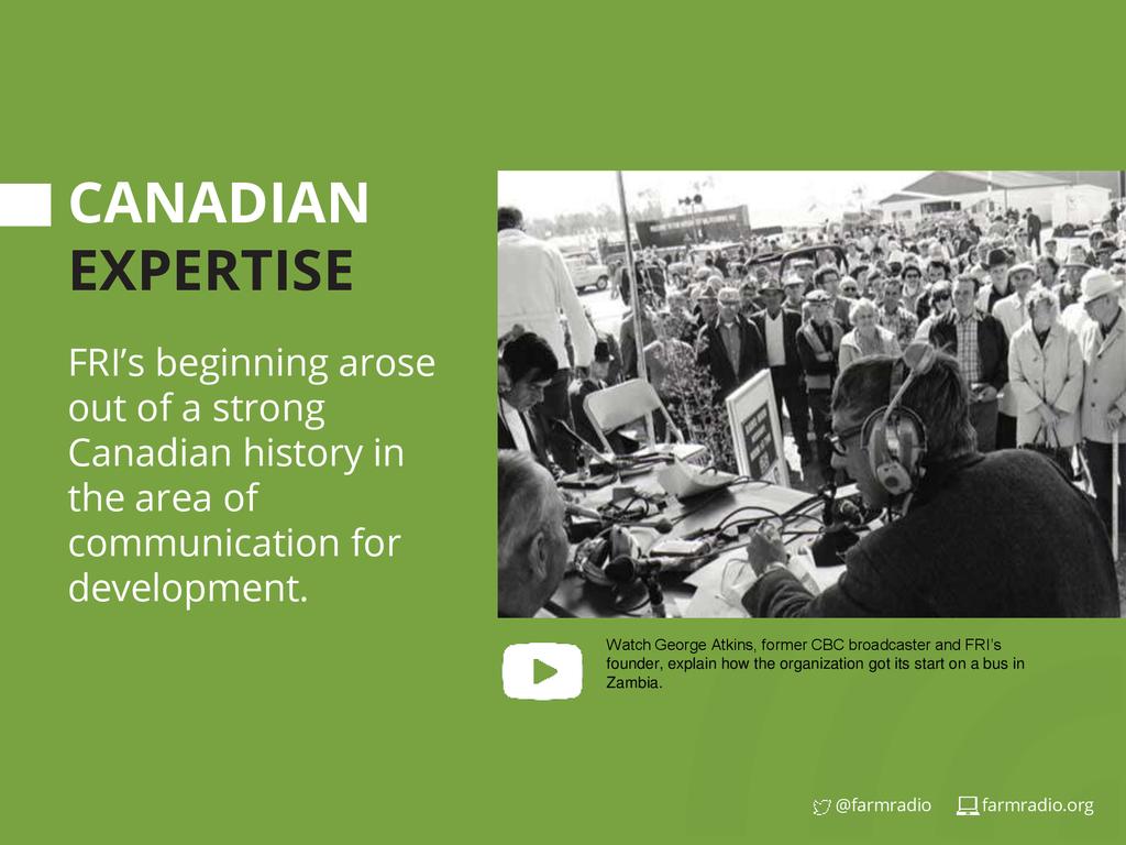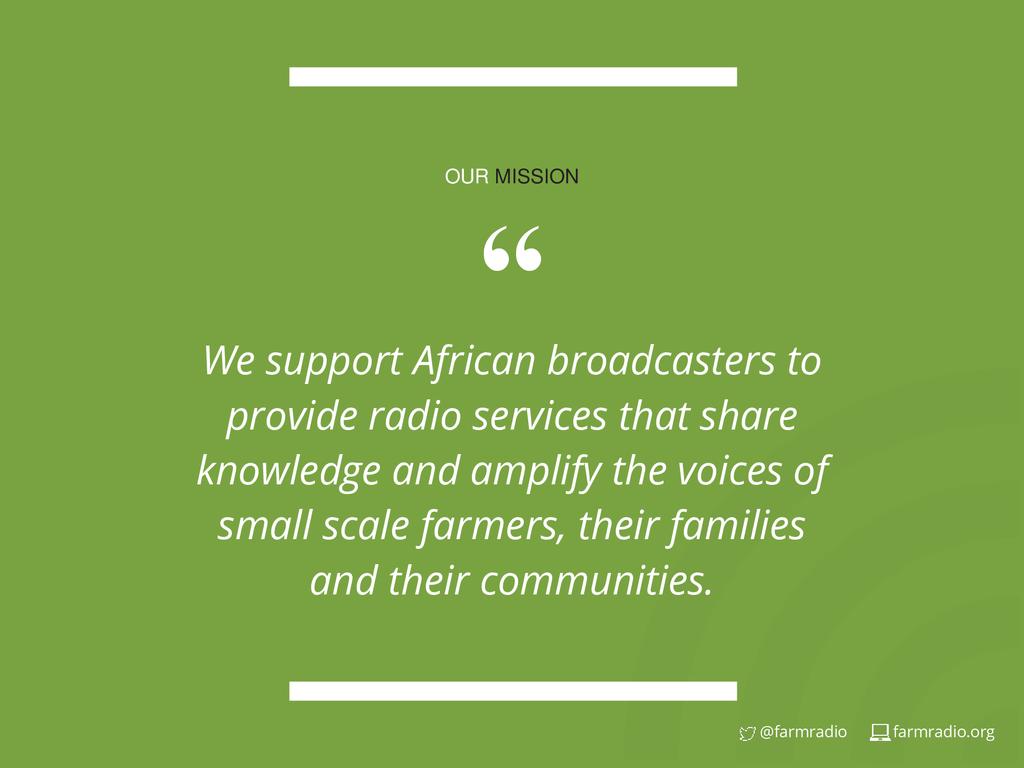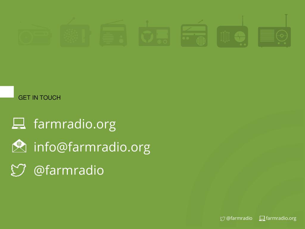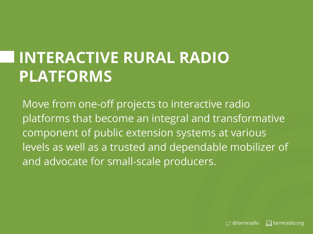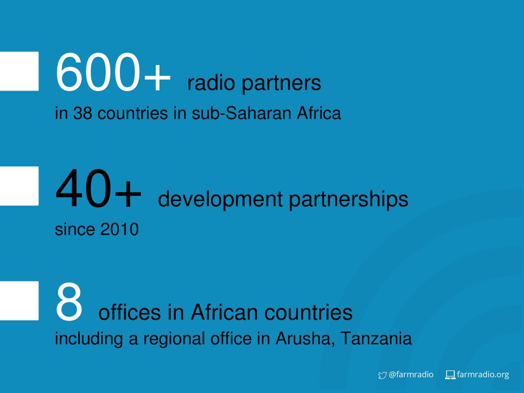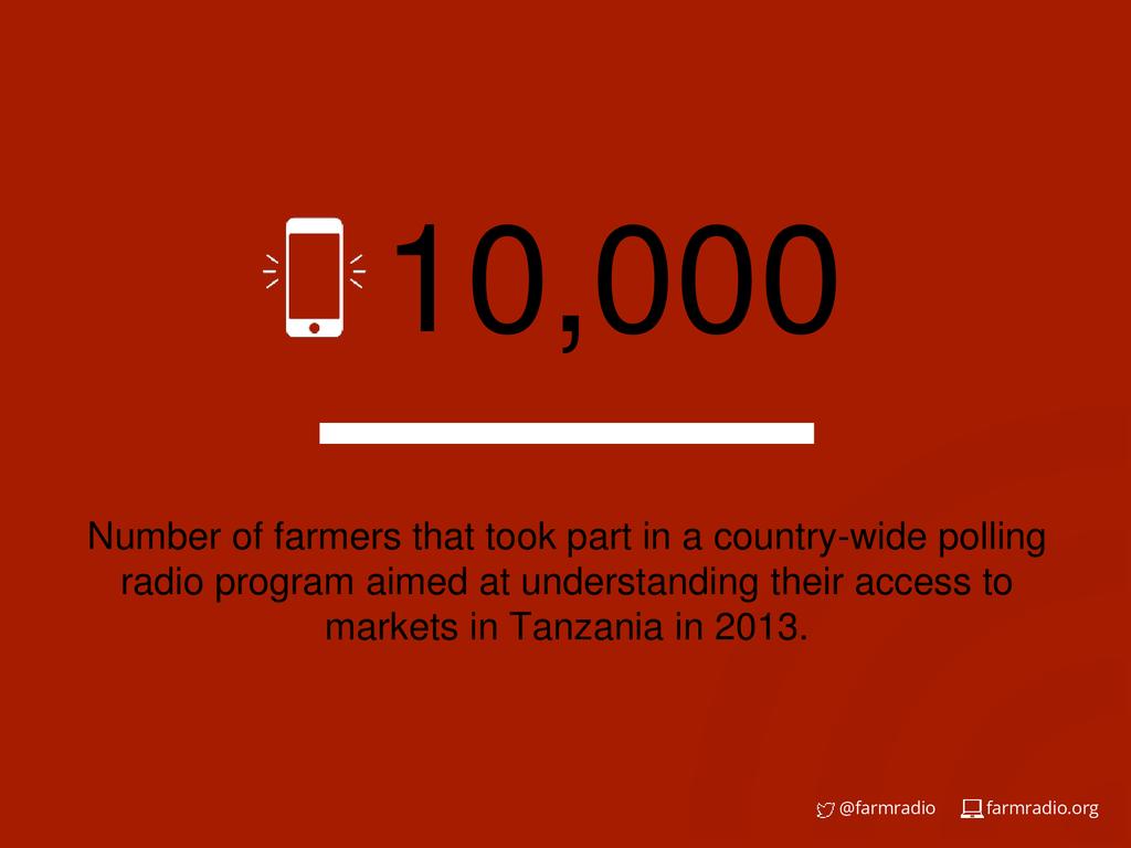Farm Radio International (FRI), is a Canadian not-for-profit organization at the forefront of using radio combined with other ICTs to increase reach, participation and to give African farming families a voice. We work with local radio stations to develop interactive programs which respond to the information needs of farmers, giving them chance to hear about, discuss and ask questions about improved agricultural techniques. We will present some results from projects in Tanzania, and you will get chance to experience our interactivity methods.