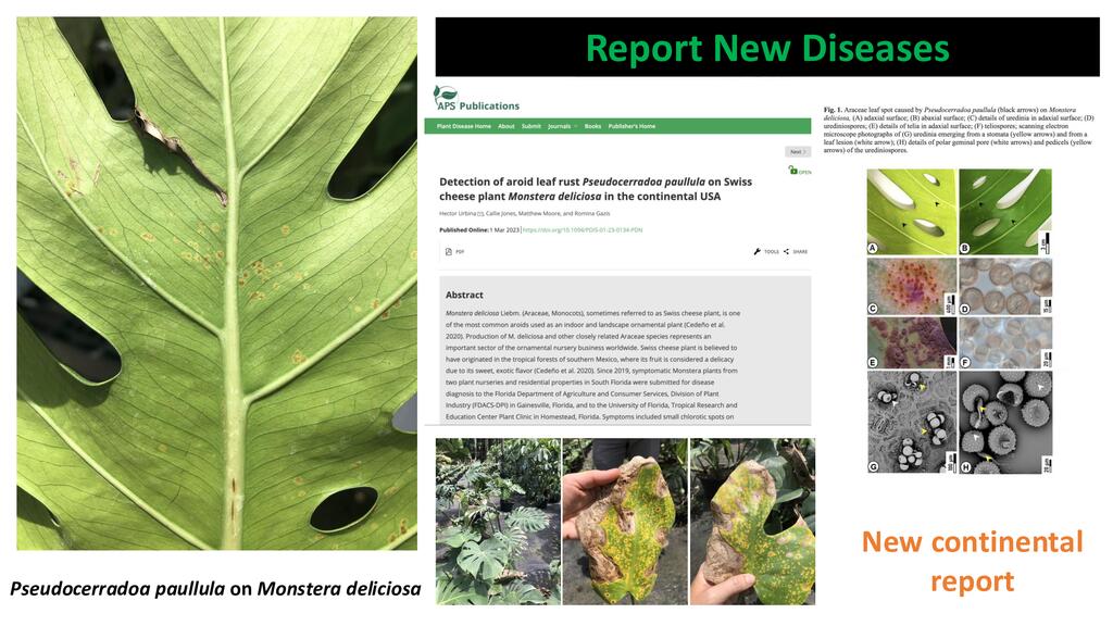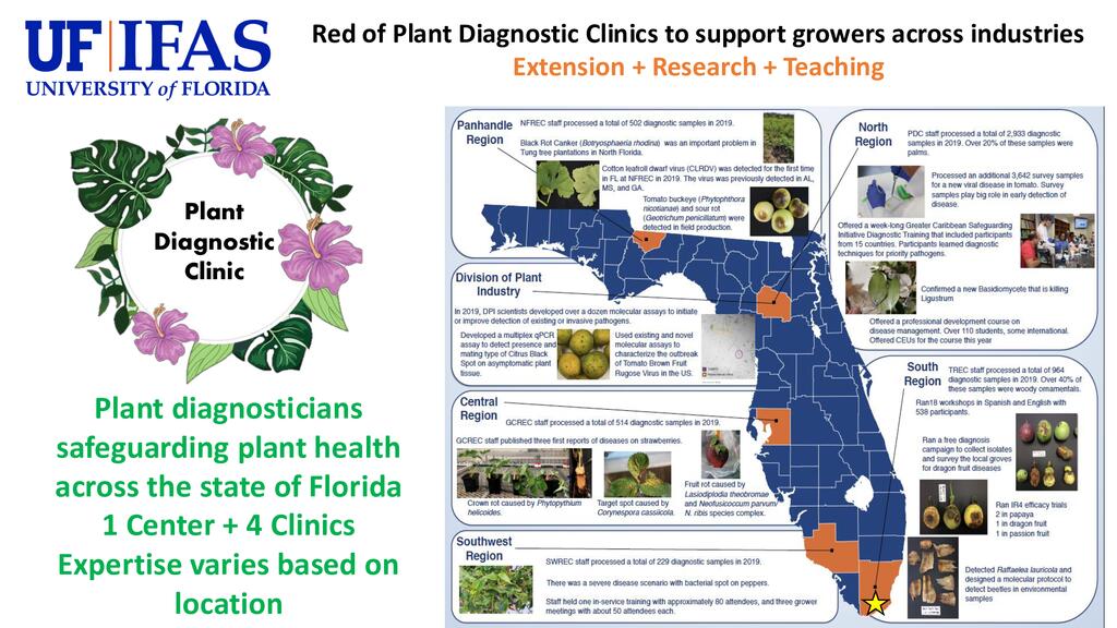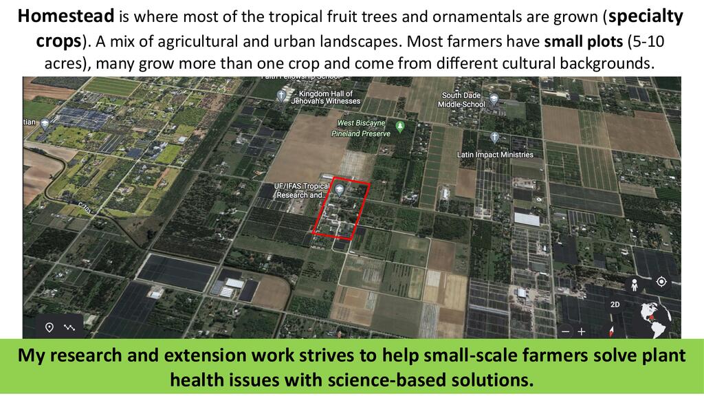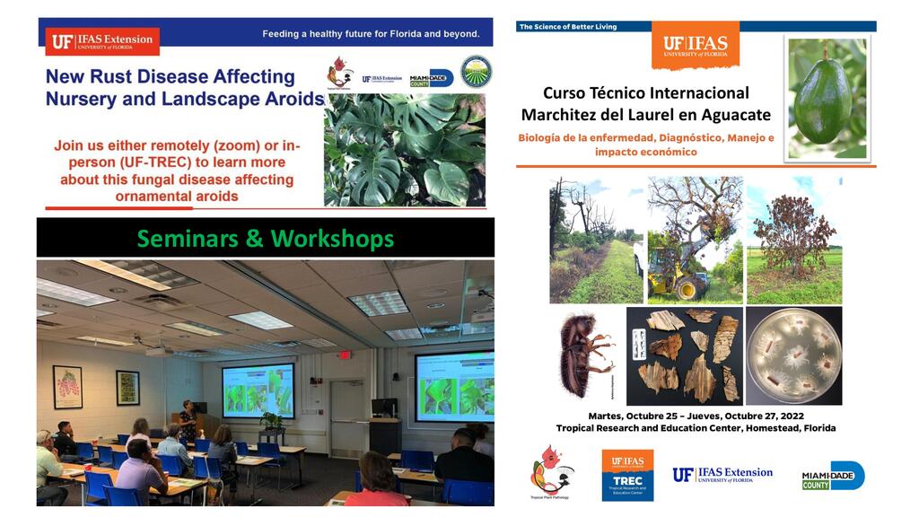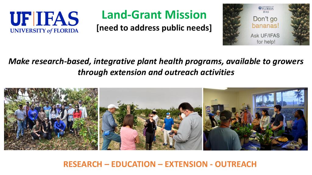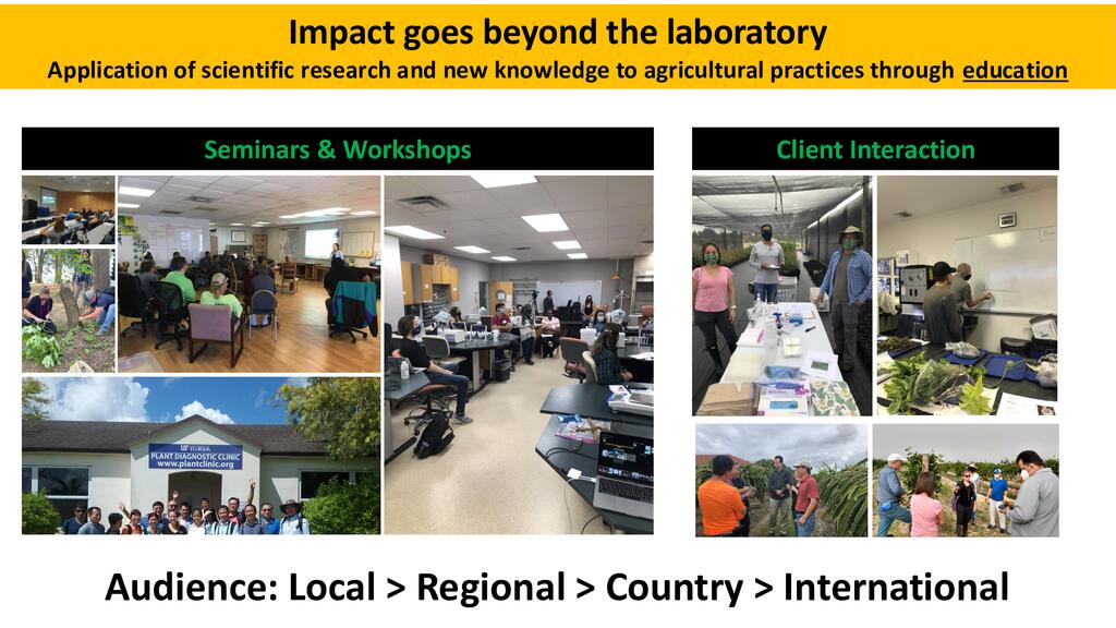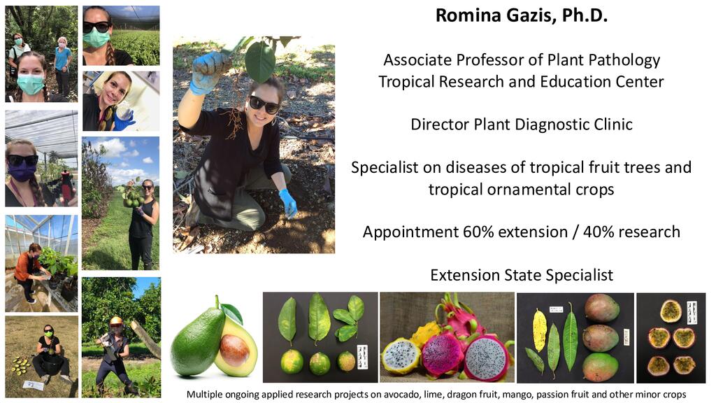 Romina is an Associate Professor in the Department of Plant Pathology at the Tropical Research and Education Center (TREC), University of Florida. Her long-term research goal is to understand the biology behind different plant diseases affecting local industries and natural landscapes and use this knowledge to develop efficient and long-term disease management strategies. She has a 60% extension and 40% research appointment and is the primary research plant pathologist for tropical and subtropical fruit and ornamental crops in south Florida and the Director of the Plant Diagnostic Clinic at UF-TREC. Her research and extension work are oriented towards the needs of stakeholders; more specifically, the development of a statewide research and extension program which manages diseases affecting the commercial production of local crops. This program emphasizes education and dissemination of science-based information about tropical crop production, disease and pest management, and best practices for pesticide use. Its development and implementation, guided by the needs of farmers, allied industry representatives and county extension agents, occurs in the following main areas: (1) improving disease management and therefore increasing the sustainability of tropical and subtropical fruit and ornamental crop production and (2) developing a statewide educational program to improve disease management of tropical and subtropical fruit and ornamental crops.