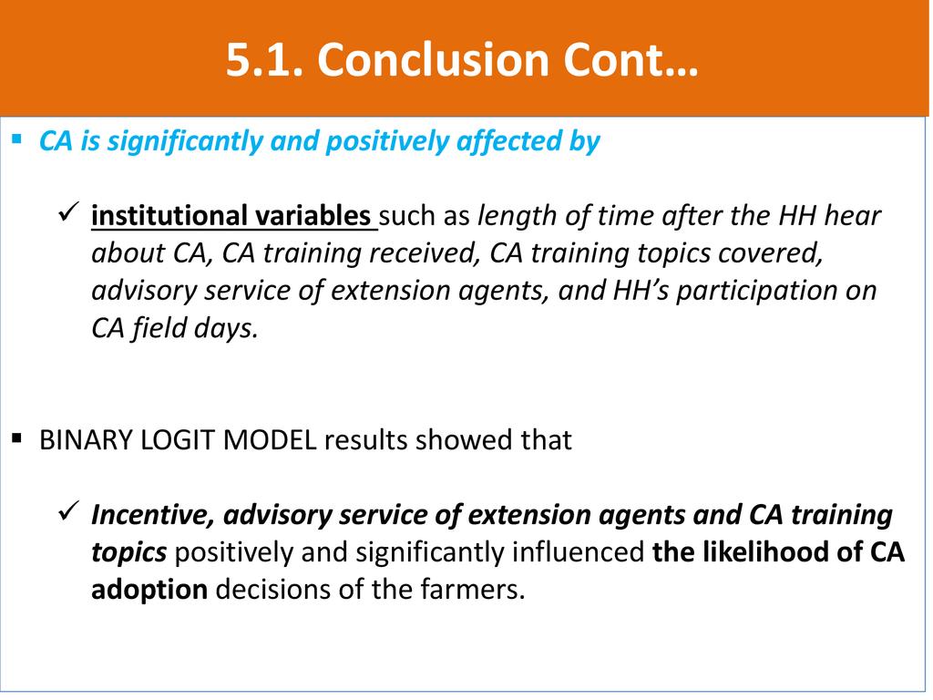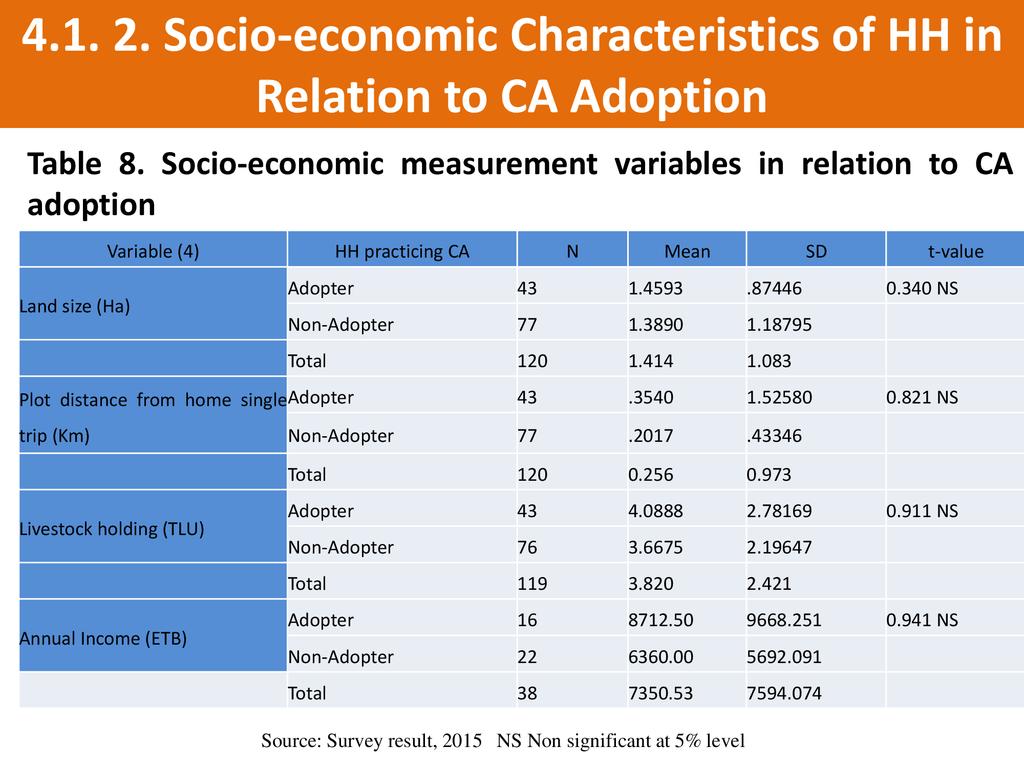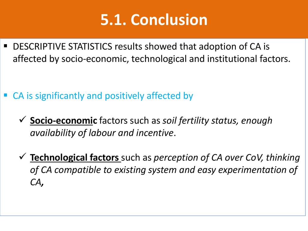 The study in Borichaworeda, Sidama Zone, Southern Ethiopia examines socio-economic, household related, technological and institutional factors affecting conservation agriculture in the study area. The overall finding of the study emphasizes the high importance of economic support in providing agricultural inputs as incentives in a sustainable system and institutional support in providing comprehensive trainings and consultancy services of extension agents so as to enhance adoption of conservation agriculture.