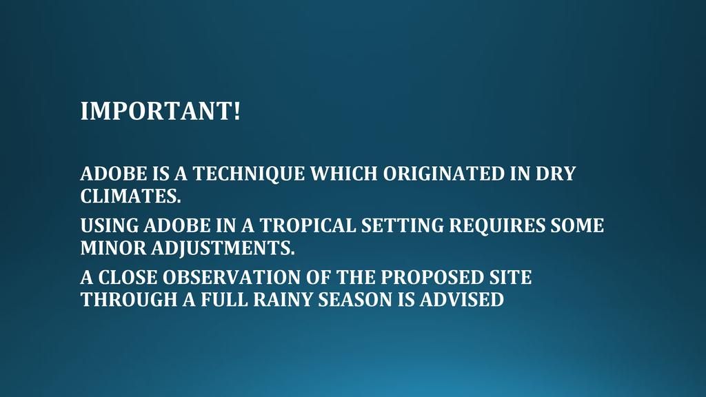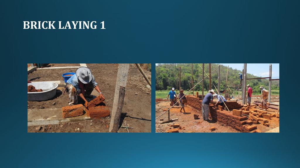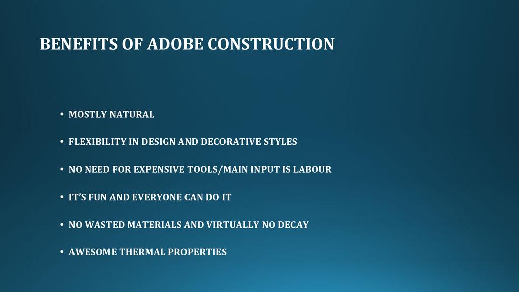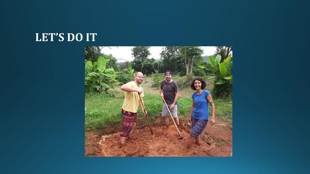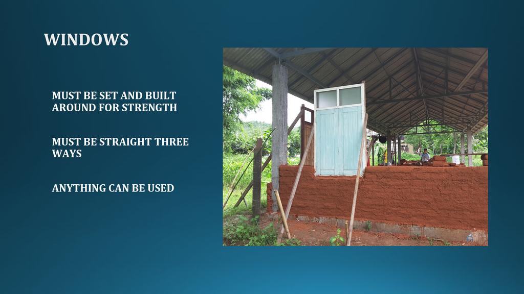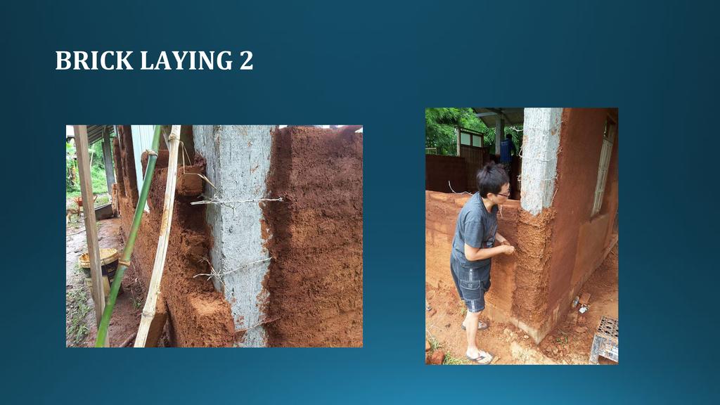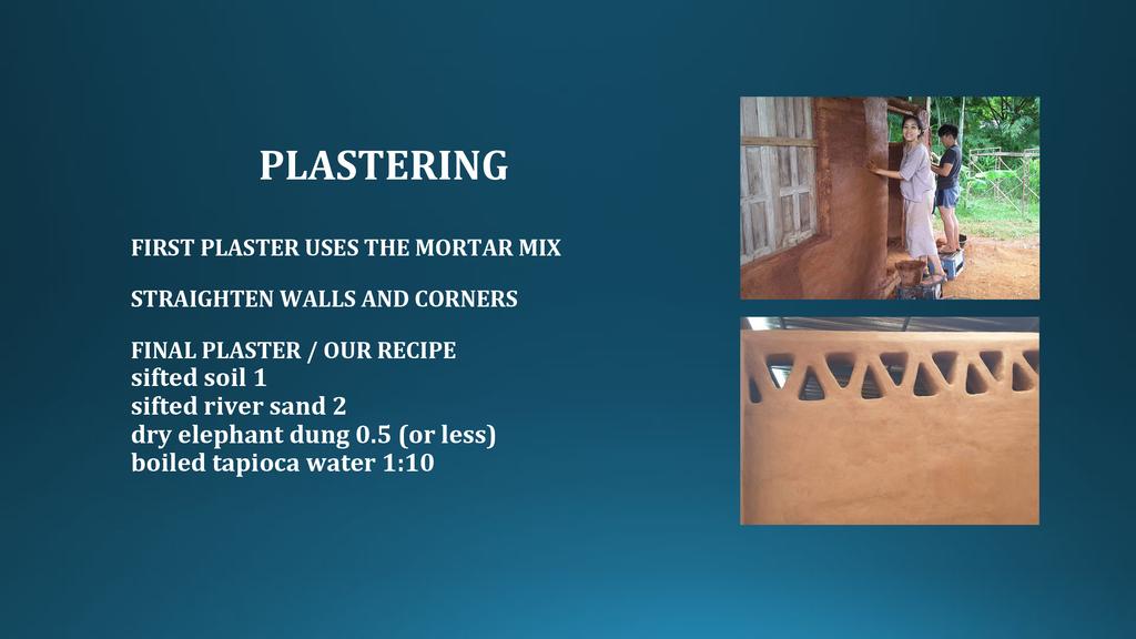 This presentation is a summary version of the information provided during the Mae Mut Garden workshops minus the practical aspect. We aim to show that natural building is a very easy technique to learn and requires no special skills, as well as having a number of environmental and financial benefits. The process starts with an understanding of the possibilities offered by the various techniques of earthen building and of the basic considerations when using adobe in a tropical climate. We offer a brief outline of the basic design principles of using adobe and go through a step-by-step analysis of the various aspects of construction, from budgeting and site planning up to plastering techniques and decorative detailing.