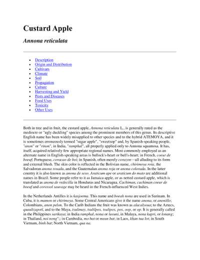 The custard apple tree is not especially attractive. It is erect, with a rounded or spreading crown and trunk 10 to 14 in (25-35 cm) thick. Height ranges from 15 to 35 ft (4.5- 10 m). The ill-smelling leaves are deciduous, alternate, oblong or narrow-lanceolate, 4 to 8 in (10-20 cm) long, 3/4 to 2 in (2 5 cm) wide, with conspicuous veins. Flowers, in drooping clusters, are fragrant, slender, with 3 outer fleshy, narrow petals 3/4 to 1 1/4 in (2 3 cm) long; light-green externally and pale-yellow with a dark-red or purple spot on the inside at the base. The flowers never fully open.