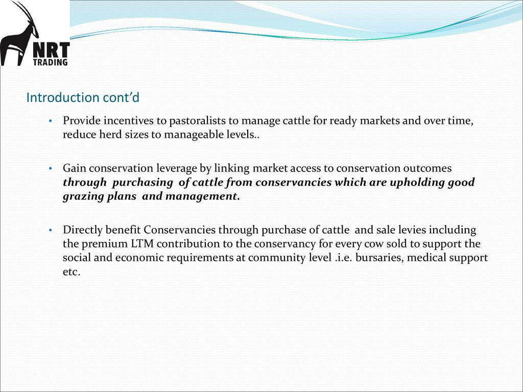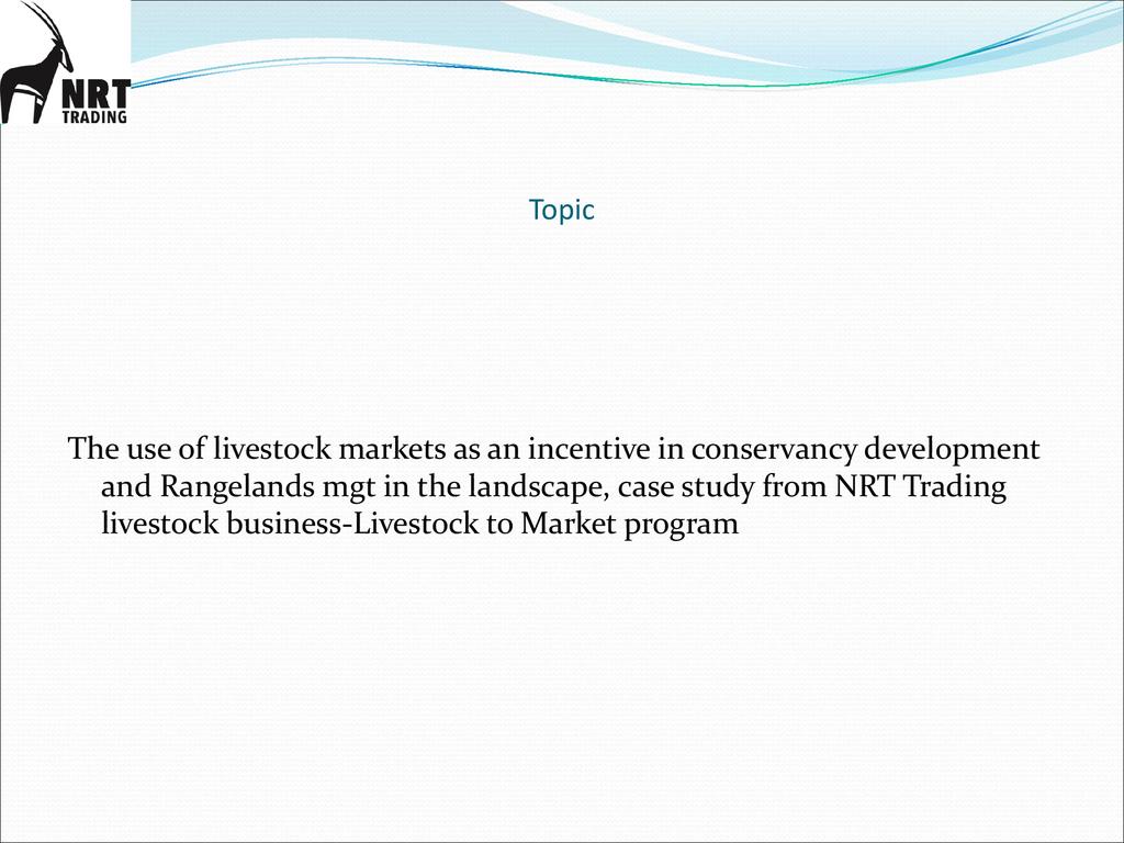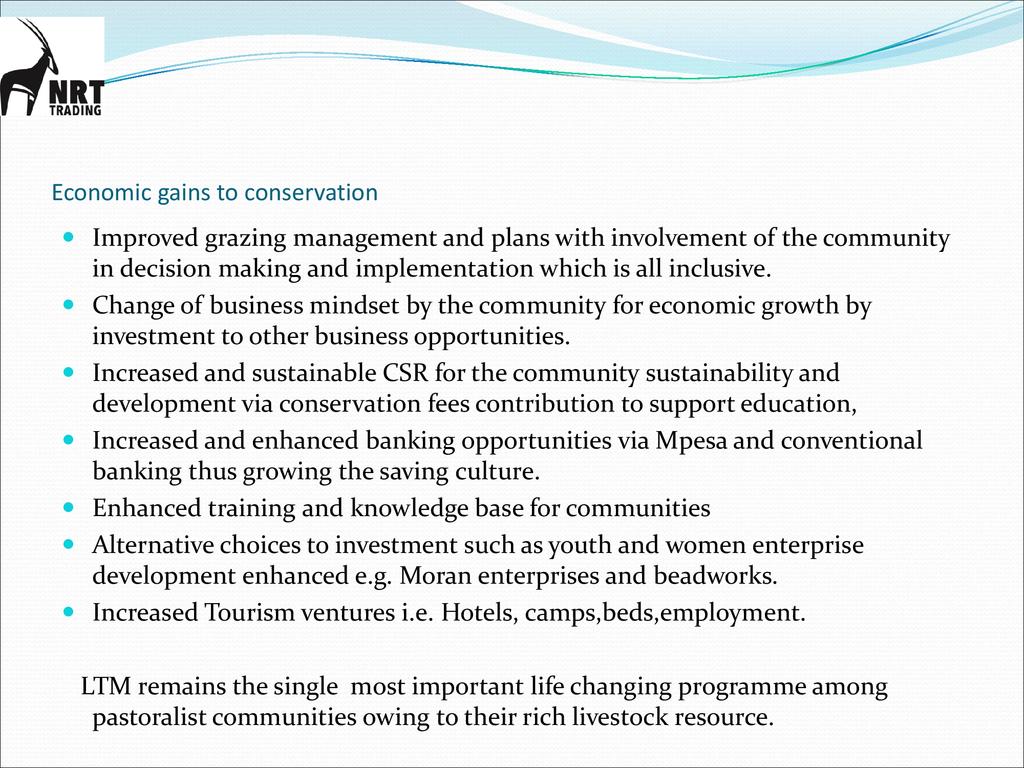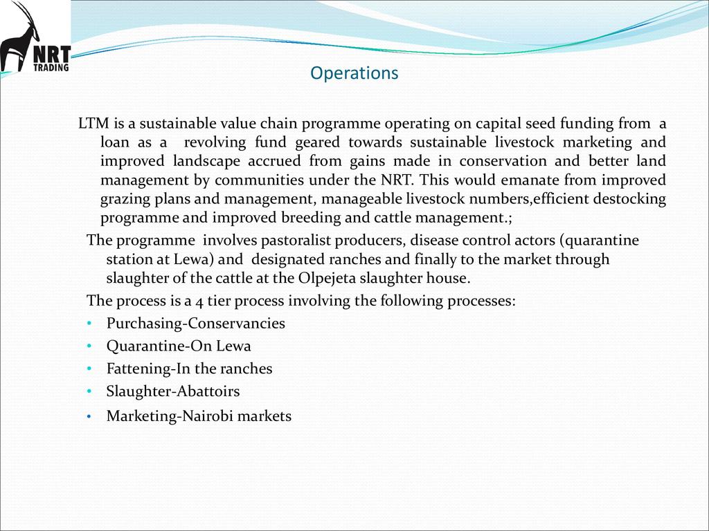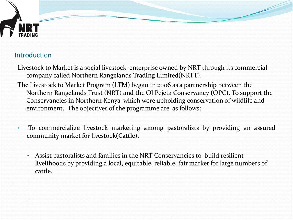 Session: The Livestock to Markets Program(LTM) is a social enterprise owned by NRT through its business company called -NRT Trading company. LTM aims to commercialize livestock marketing among pastoralists by providing an assured, equitable and reliable market for good quality cattle in order to build resilient livelihoods in the NRT conservancies.