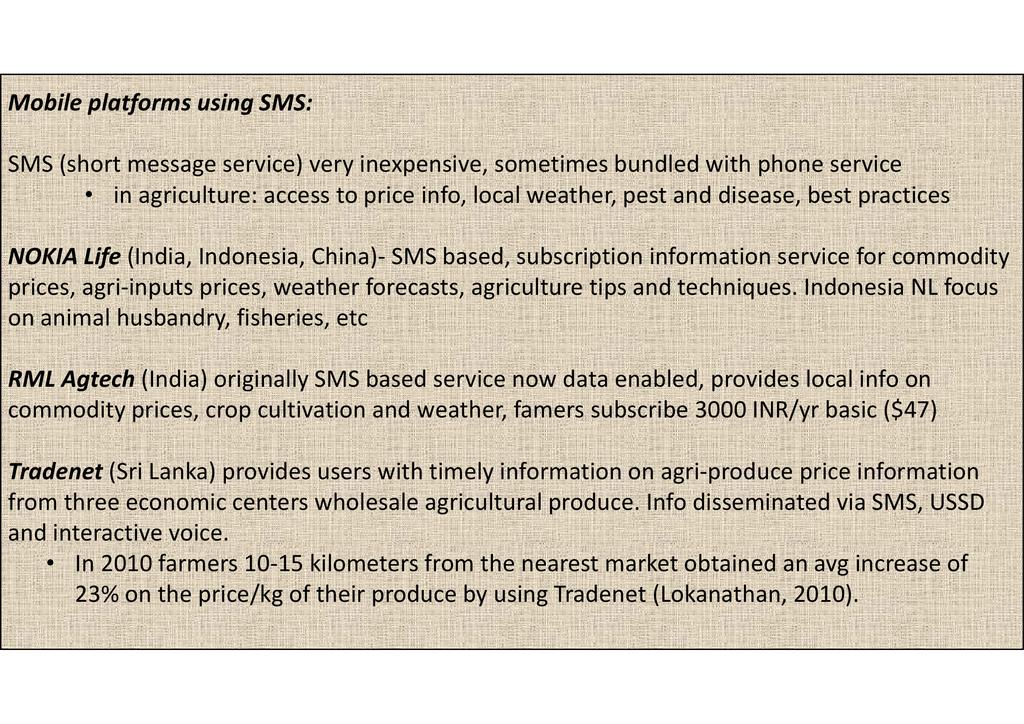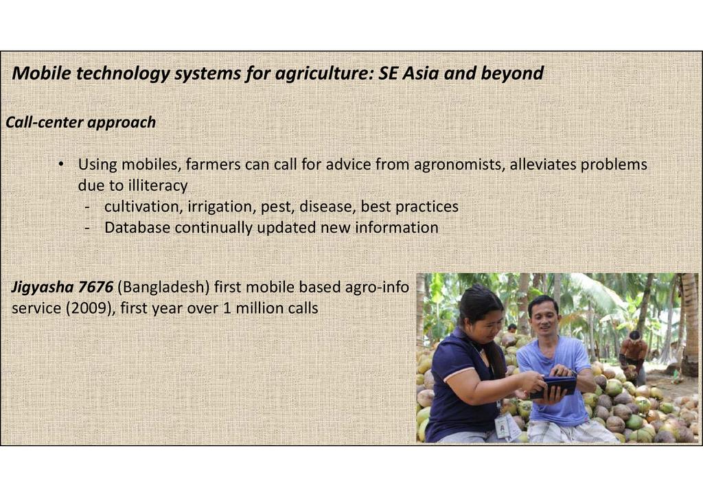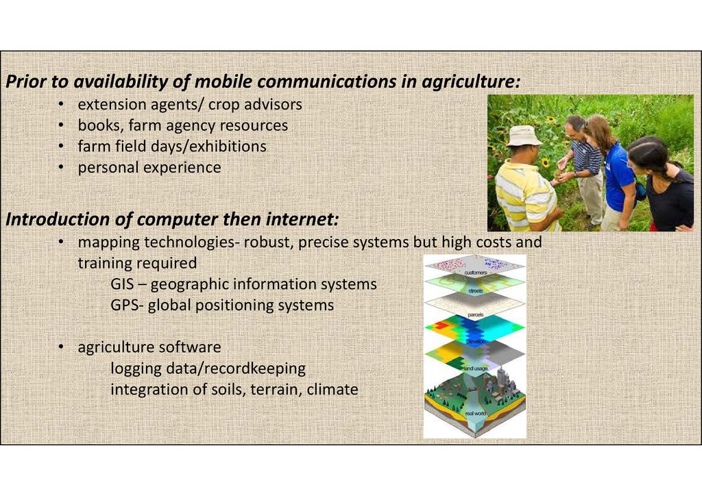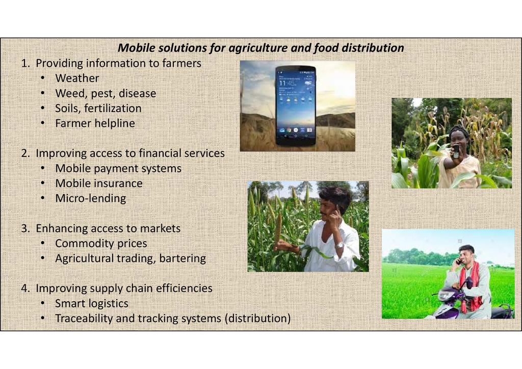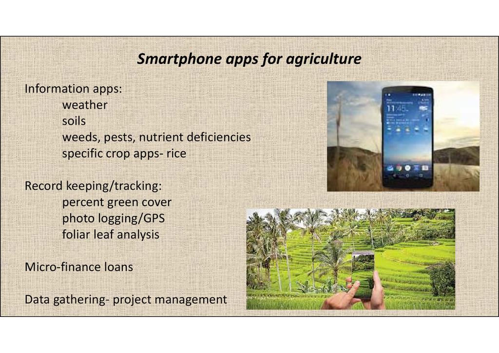 As mobile technologies improve and expand rapidly into rural areas, several types of applications have been developed to help farmers access up-to-date agricultural information, banking and lending platforms, and increase efficiencies in the agriculture supply chain. We will discuss a variety of proposed mobile systems for agriculture and look at several applications currently being adopted by farmers in Asia and Africa. Finally, we will investigate specific smartphone apps for Android and iOS that are designed to provide crop nutrient information, soil, weed, pest and disease ID, weather forecasts, photo logging, canopy cover analyses, and geolocation.