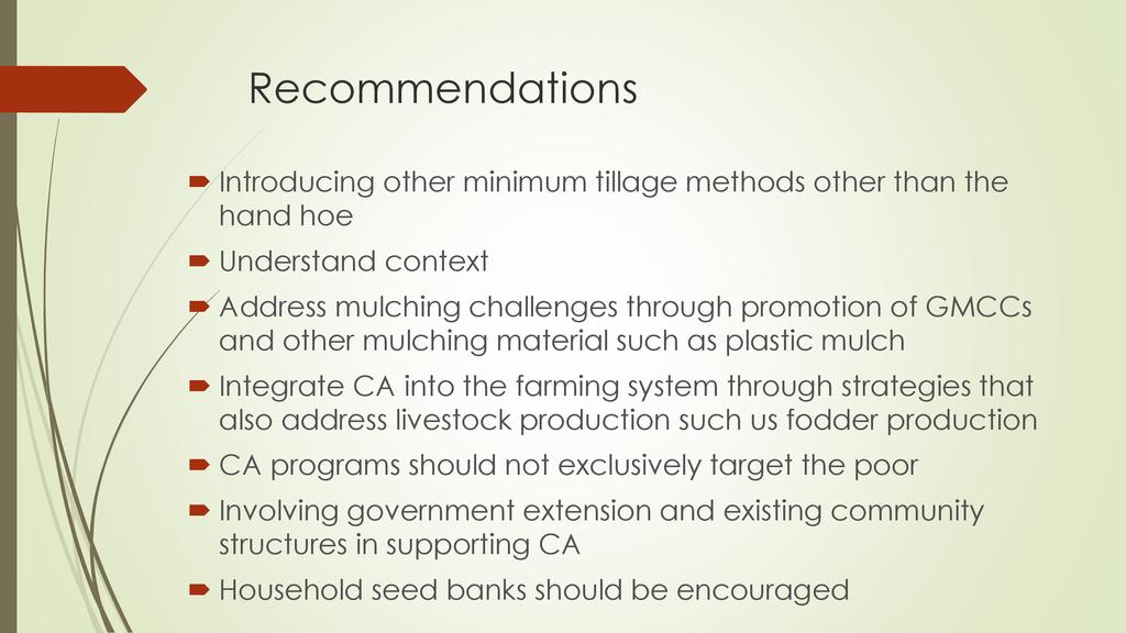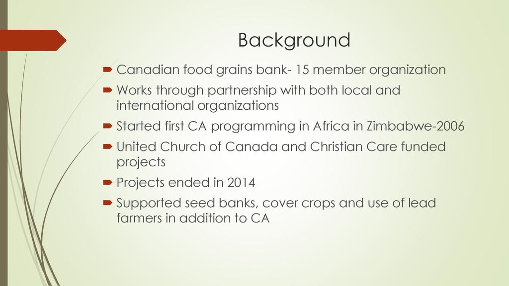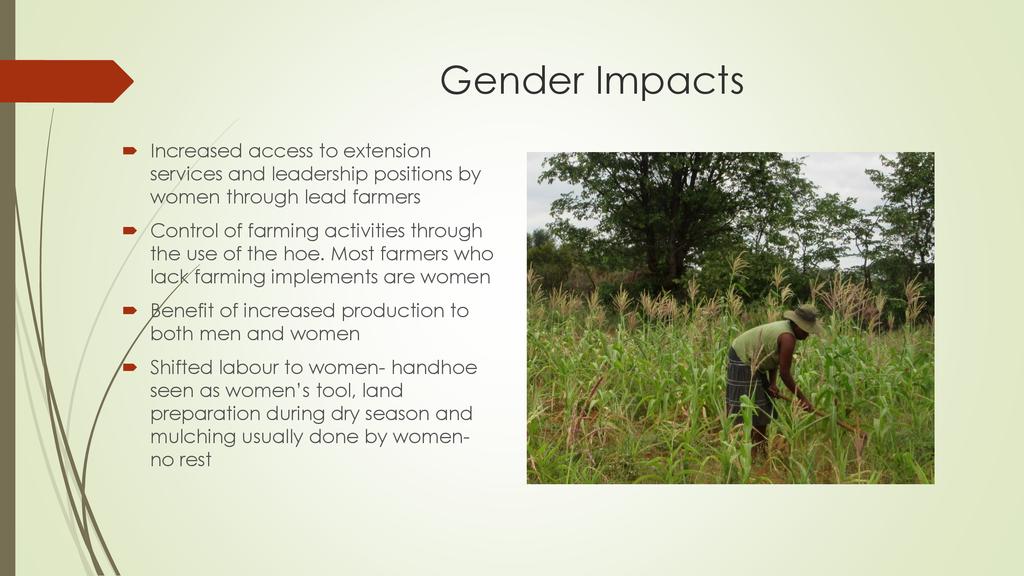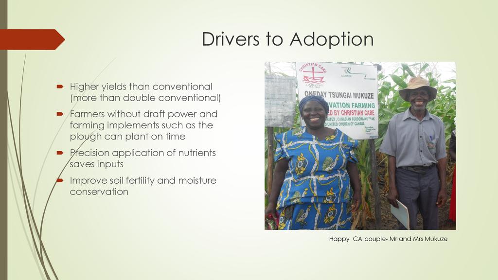 The presentation will be based on findings of an ex-post evaluation of 10 years of Christian Care’s Conservation Agriculture (CA) programming which started in 2006 and ended in 2014 in five districts of Zimbabwe with funding from the United Church of Canada and the Canadian Foodgrains Bank (CFGB). The main objectives of the ex-post evaluation is to evaluate the sustainability of CA interventions, the barriers and drivers of sustainable adoption, understand the contribution of CA to food security and the impact of CA on me and women (i.e. access, labor and decision making).