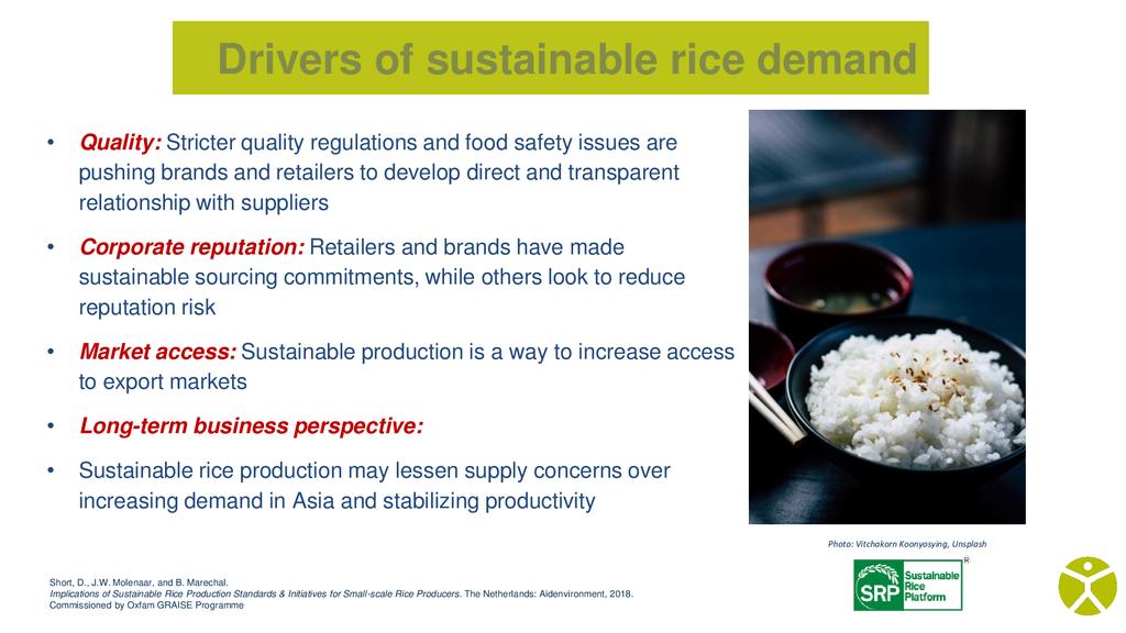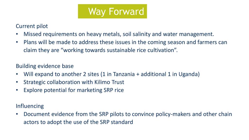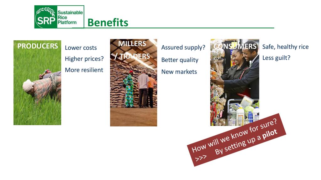 Session: Rice is the daily staple food of 3.5 billion people. One out of 5 people on our planet derives a livelihood from rice. In 2050, the world will face a big production shortfall estimated at 40%. How can we address this global challenge while protecting the environment, adapting to and mitigating climate change impacts, and uplifting smallholder’s livelihoods? And how can we guarantee that consumers have access to safe, healthy and sustainable rice? This session will introduce participants to the Sustainable Rice Platform tool which measures sustainability in rice production and explain progress so far in pilots around the world, including Uganda and Tanzania.