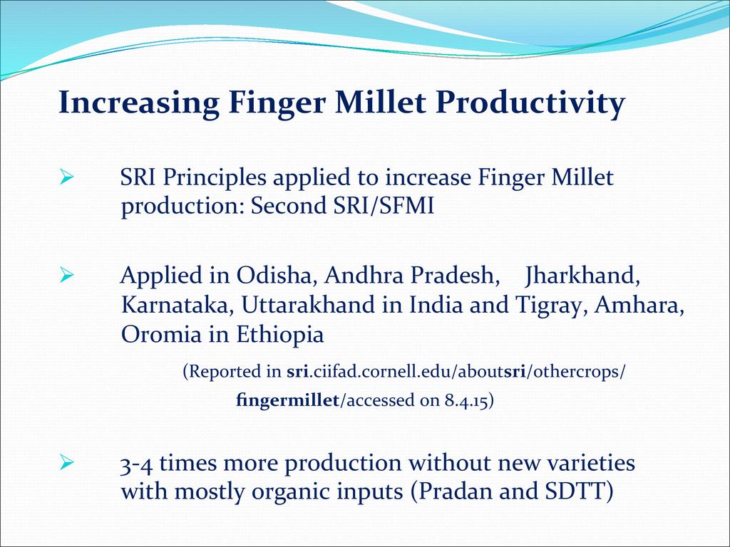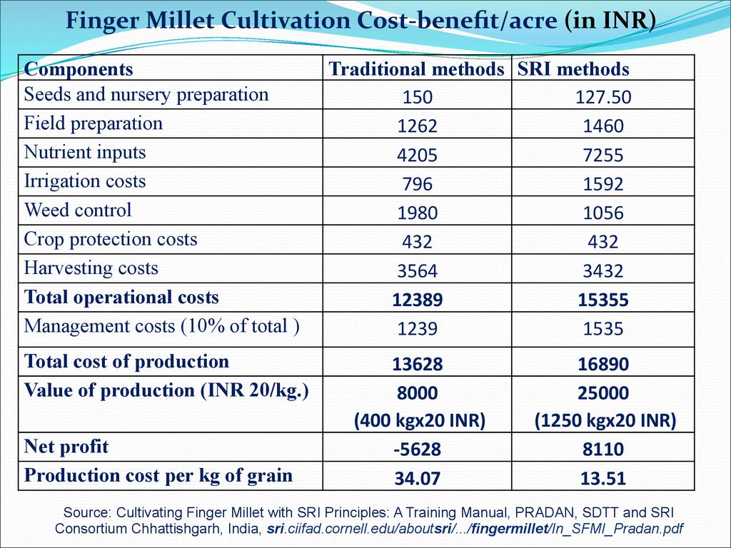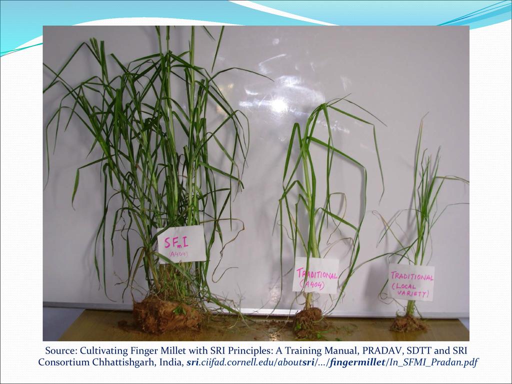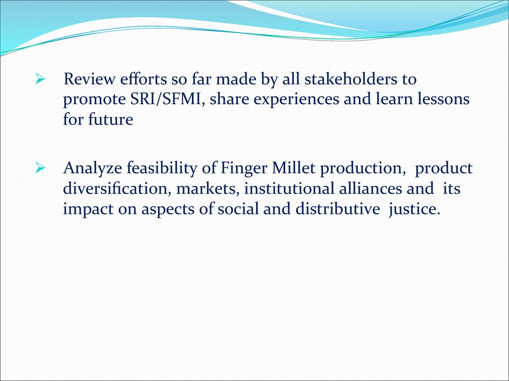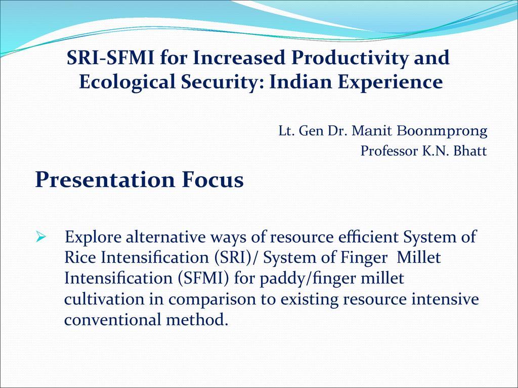 Explore alternative ways of resource efficient System of Rice Intensification (SRI)/ System of Finger  Millet Intensification (SFMI) for paddy/finger millet cultivation in comparison to existing resource intensive conventional method.