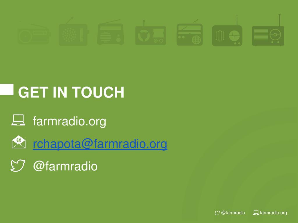Biographical information: Rex Chapota is the new Regional Program Manager for East & Southern Africa/Strategic Opportunities Advisor for Farm Radio International since 1st February 2018. Prior to joining FRI, he worked as the founding Executive Director of Farm Radio Trust since 2010 till January 2018. He was working as the FRIs’ National Research Coordinator for a groundbreaking action research project known as the African Farm Radio Research Initiative (AFRRI)-Malawi Office from 2007-2009. He has over 18 years experience in developing and managing rural development projects with a passion for a holistic and sustainable transformation for Africa’s’ small scale farmers through the use of radio in combination with other ICTs. He holds an MSc in Managing Rural Development from School of Oriental Arts and African Studies-University of London, a BSc and a Diploma in Agriculture from University of Malawi. He sits on a number of high-level platforms, such as the Board Chairperson of Civil Society Network in Agriculture (CISANET), Vice Chairperson of the Malawi Forum for Agricultural Advisory Services (MaFAAS), Board Member of a UK based charity known as Girl Effect and Advisory Board Member of Heifer International in Malawi.