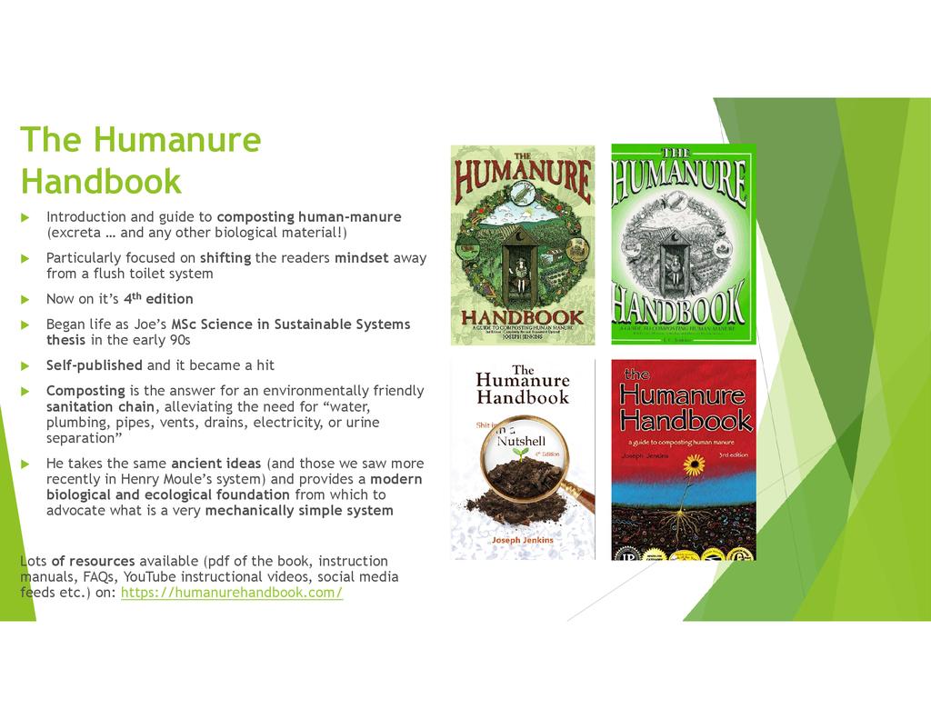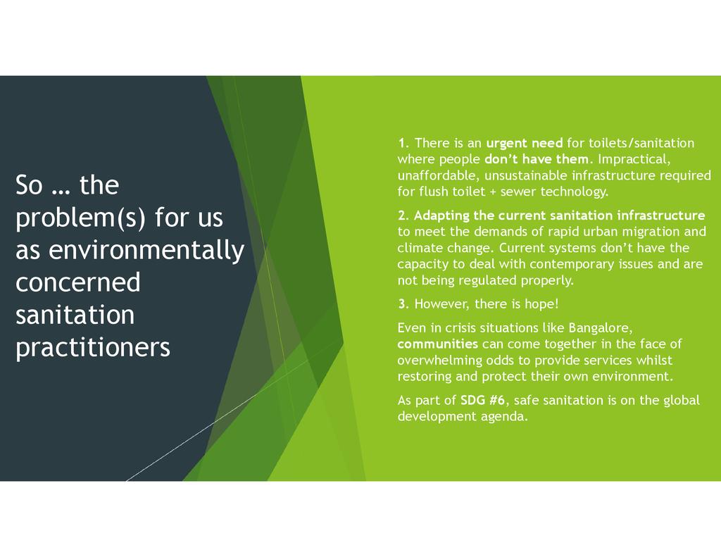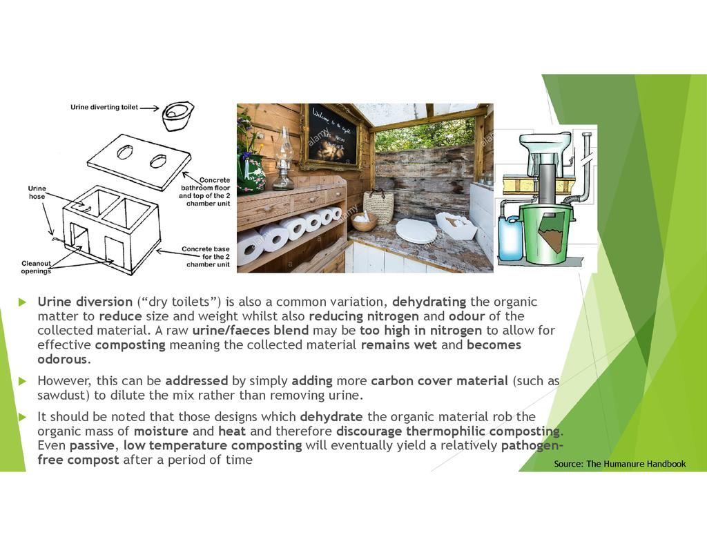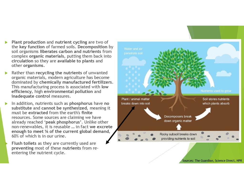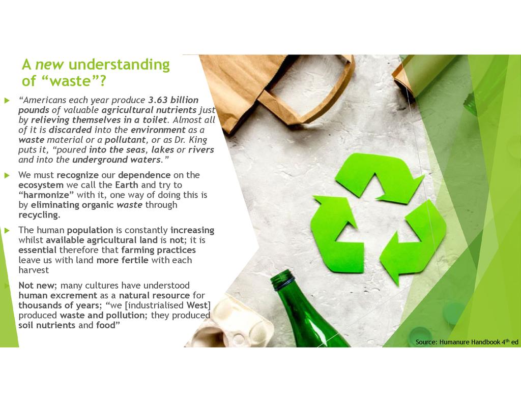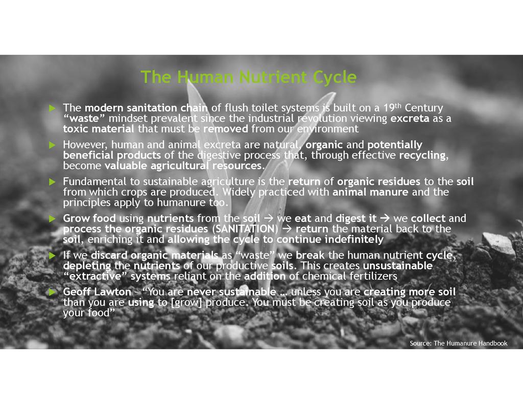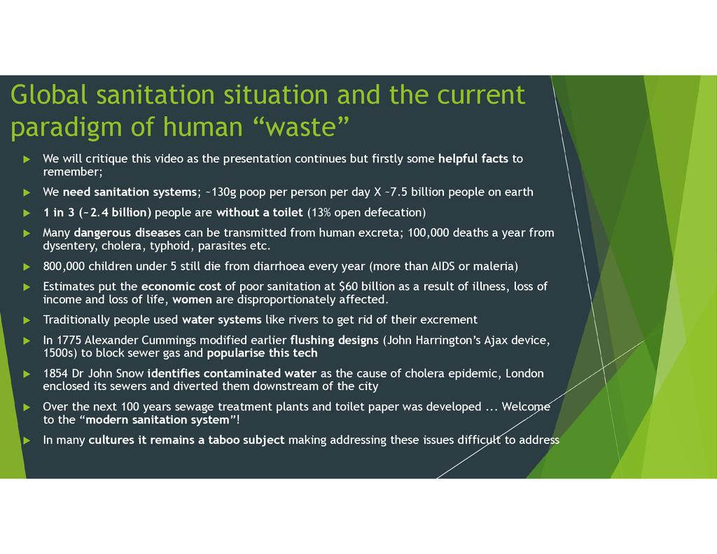 An exploration of the need for a shift in the current paradigm of human "waste" and the pleasingly simple science that offers a solution; we will look at the different sanitation situations around the world, how and why they may be problematic, discuss the most appropriate ecological solutions on offer exploring how they work and the benefits they can bring.