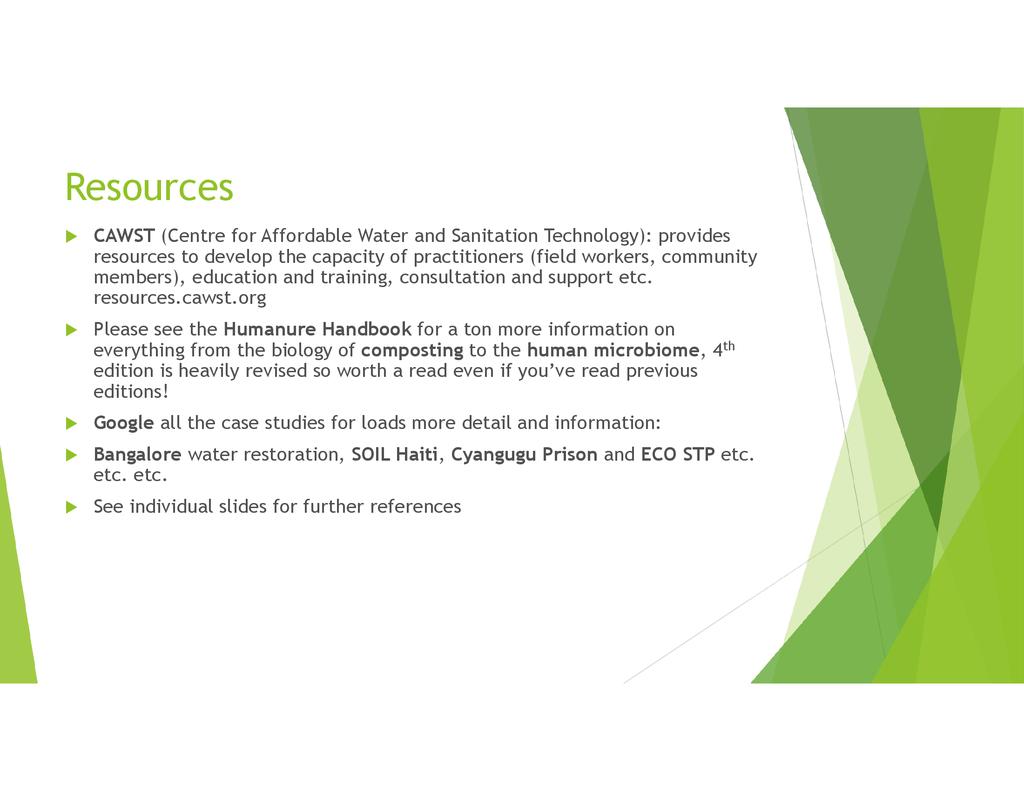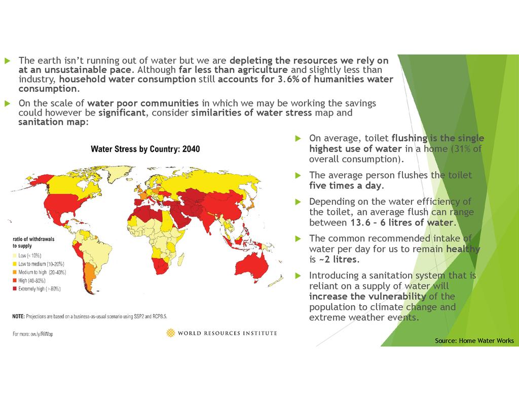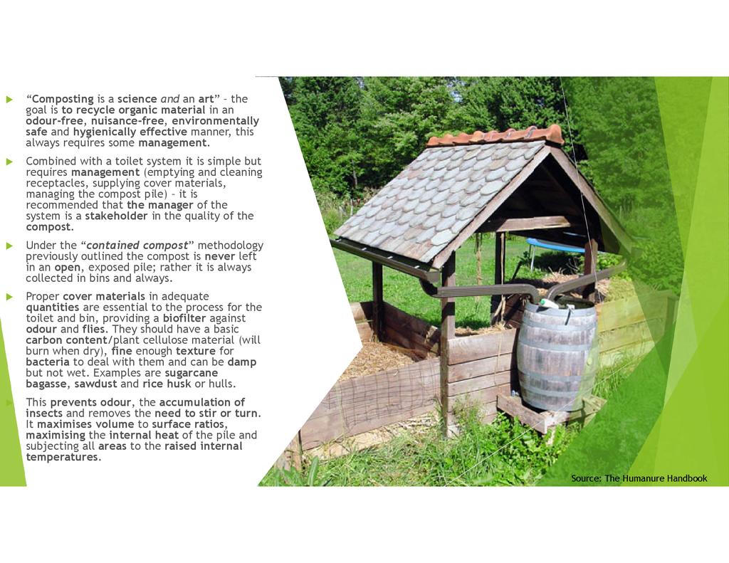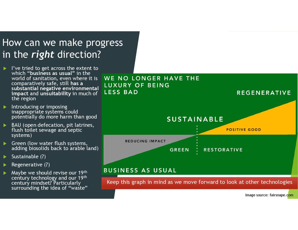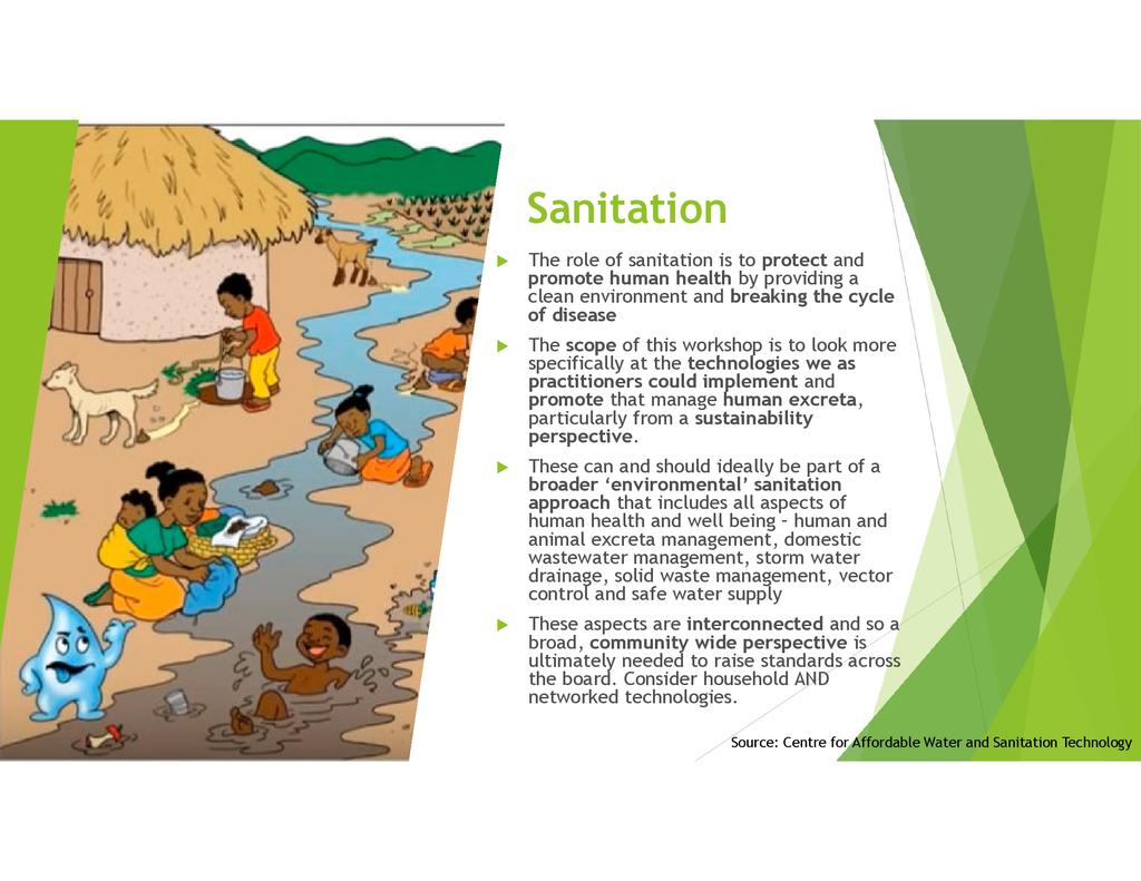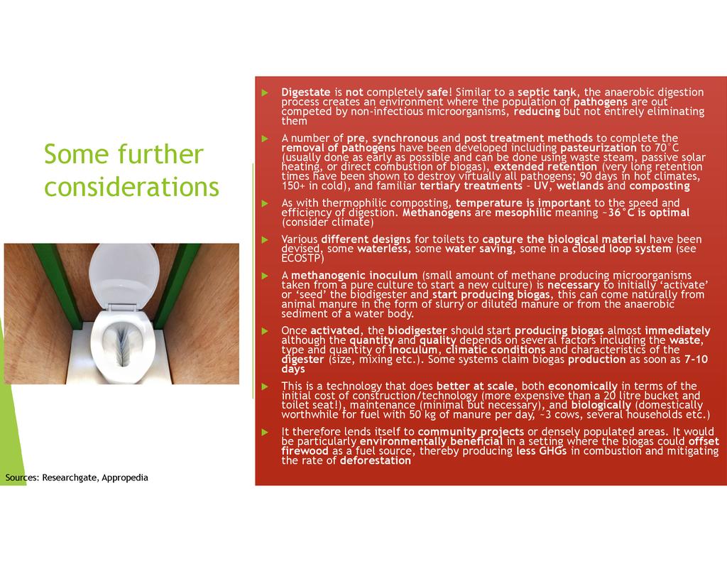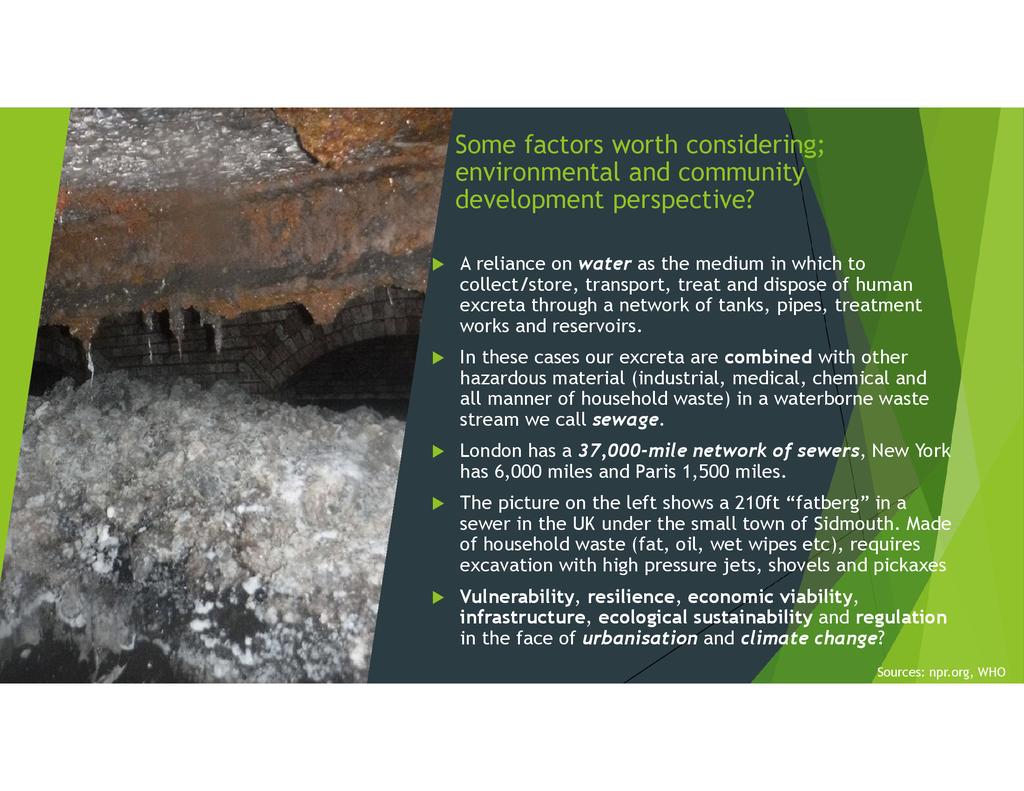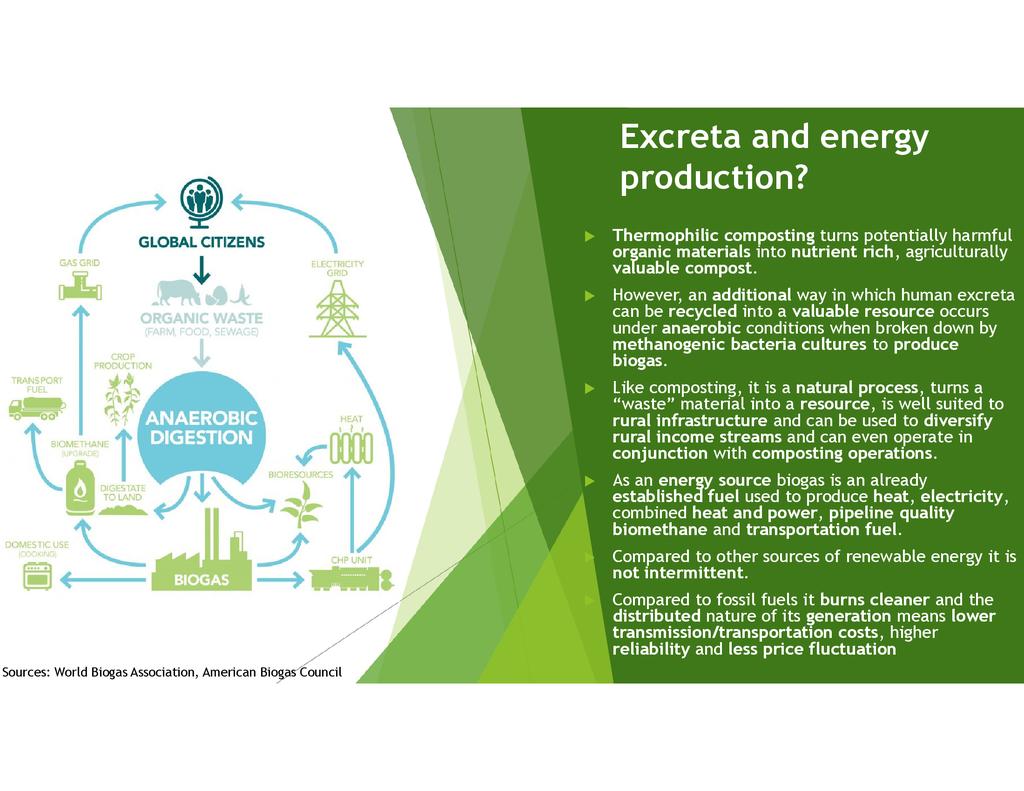 An exploration of the need for a shift in the current paradigm of human "waste" and the pleasingly simple science that offers a solution; we will look at the different sanitation situations around the world, how and why they may be problematic, discuss the most appropriate ecological solutions on offer exploring how they work and the benefits they can bring.