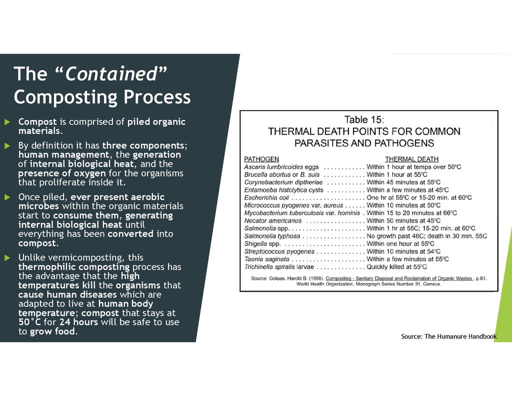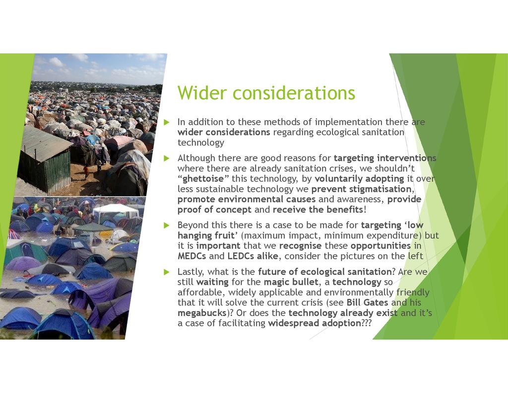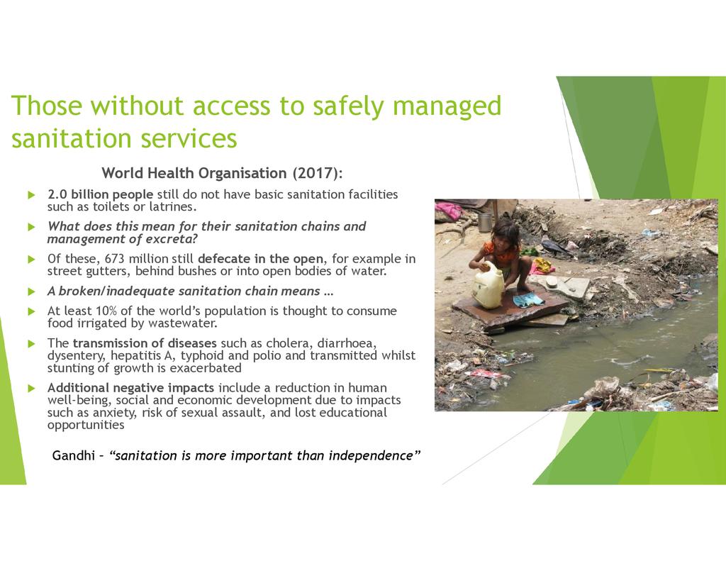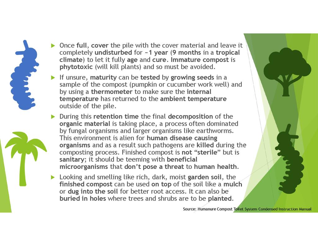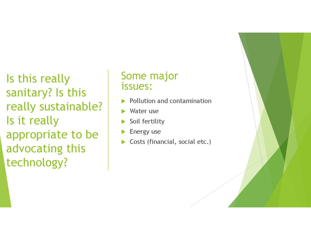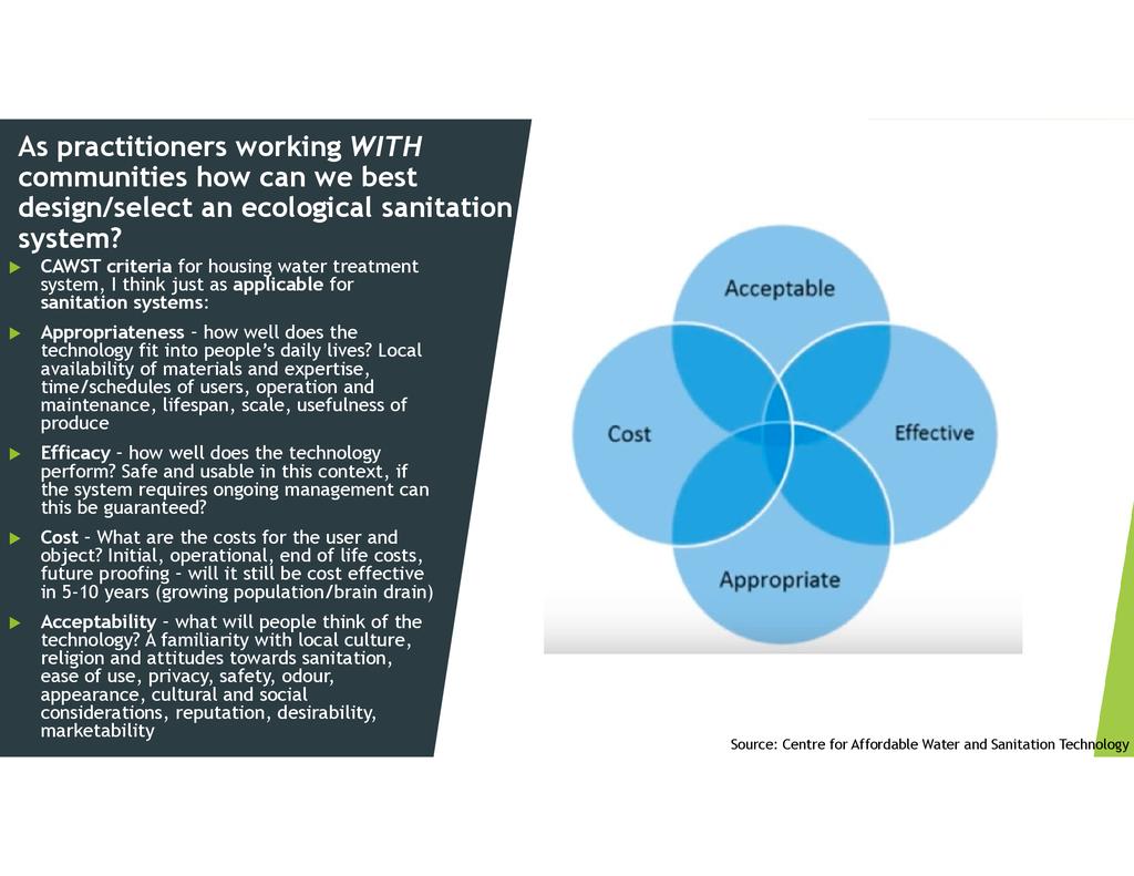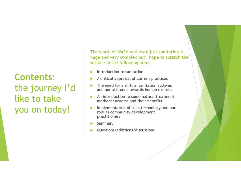 An exploration of the need for a shift in the current paradigm of human "waste" and the pleasingly simple science that offers a solution; we will look at the different sanitation situations around the world, how and why they may be problematic, discuss the most appropriate ecological solutions on offer exploring how they work and the benefits they can bring.