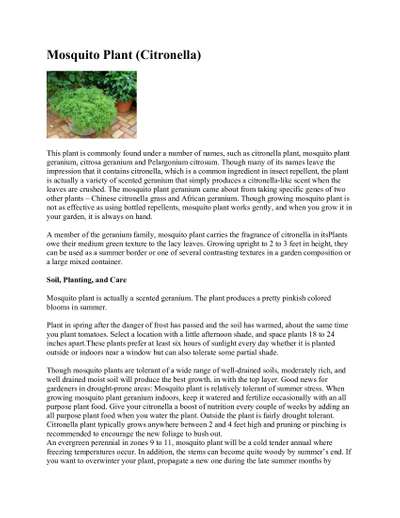 A member of the geranium family, mosquito plant carries the fragrance of citronella in itsPlants owe their medium green texture to the lacy leaves. Growing upright to 2 to 3 feet in height, they can be used as a summer border or one of several contrasting textures in a garden composition or a large mixed container.