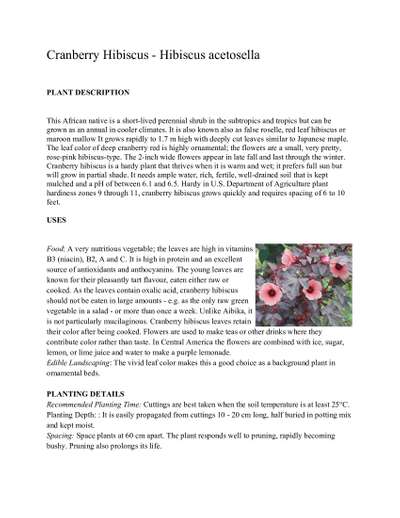 This African native is a short-lived perennial shrub in the subtropics and tropics but can be grown as an annual in cooler climates. It is also known also as false roselle, red leaf hibiscus or maroon mallow It grows rapidly to 1.7 m high with deeply cut leaves similar to Japanese maple. The leaf color of deep cranberry red is highly ornamental; the flowers are a small, very pretty, rose-pink hibiscus-type. The 2-inch wide flowers appear in late fall and last through the winter. Cranberry hibiscus is a hardy plant that thrives when it is warm and wet; it prefers full sun but will grow in partial shade. It needs ample water, rich, fertile, well-drained soil that is kept mulched and a pH of between 6.1 and 6.5. Hardy in U.S. Department of Agriculture plant hardiness zones 9 through 11, cranberry hibiscus grows quickly and requires spacing of 6 to 10 feet.