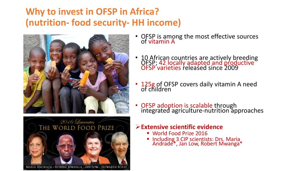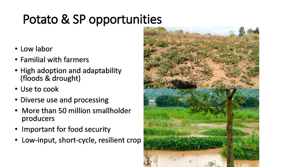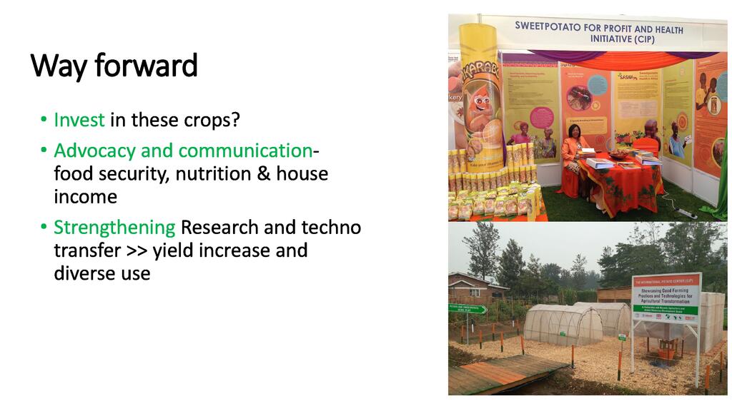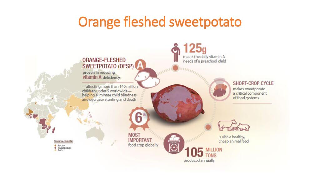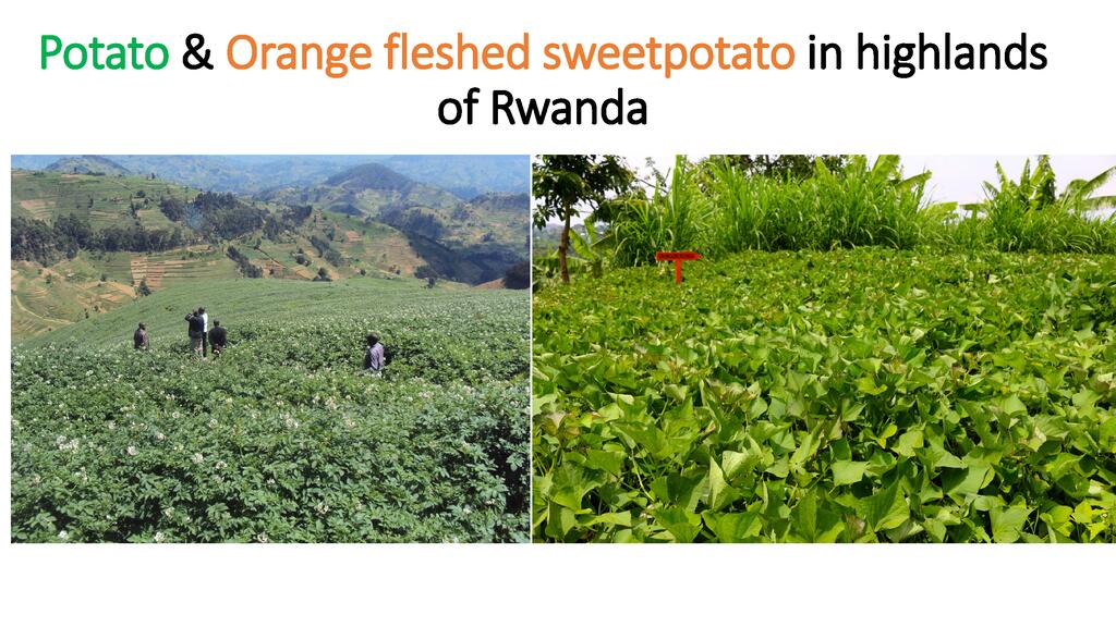 Session: Potatoes and sweet potatoes play a big role as a staple and nutritious food, as well as a source of farmer incomes in the densely populated highlands of sub-Saharan Africa. They are grown by small family farms mainly intercropped with beans and maize. Per capita, potato annual consumption is 125 kg per person which lead to the 2nd source of calorie intake after cassava. Orange-fleshed sweet potato varieties are excellent sources of vitamin A. OFSP also play a role in the elimination of malnutrition, especially hidden hunger, which is a form of malnutrition caused by deficiency in micronutrients in Rwanda.