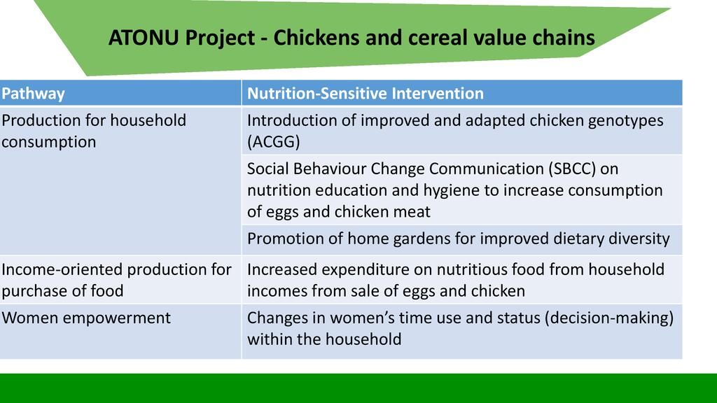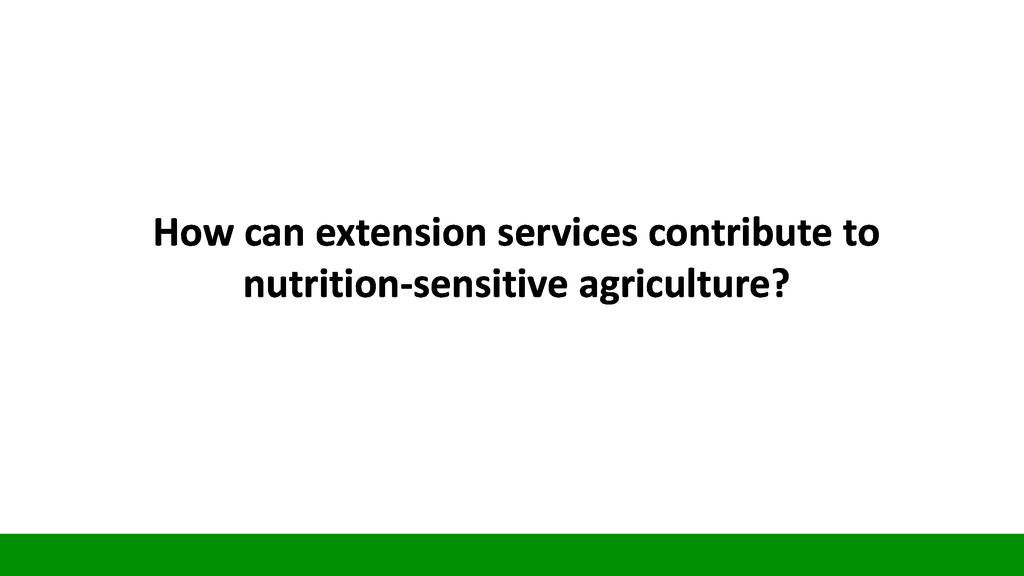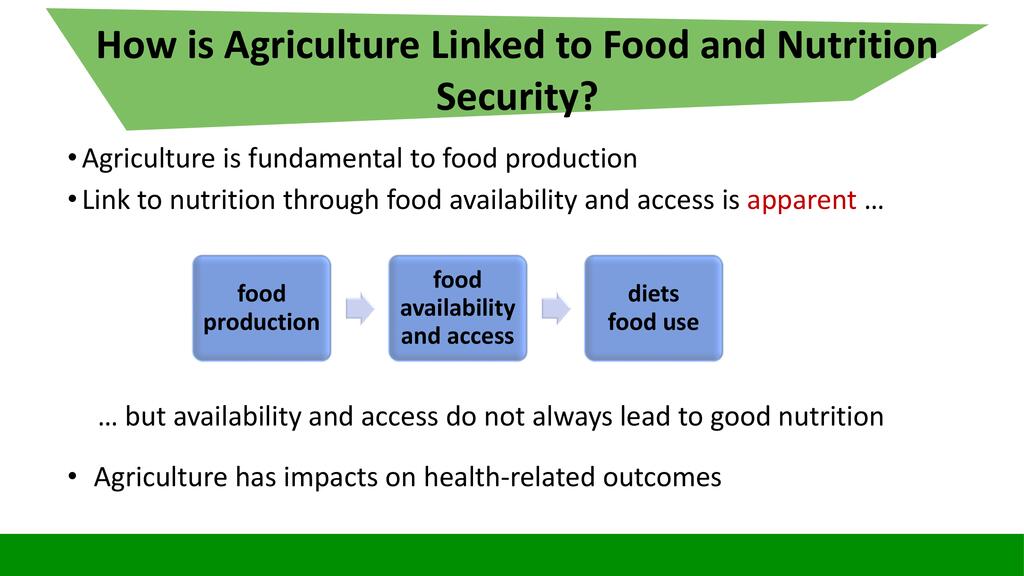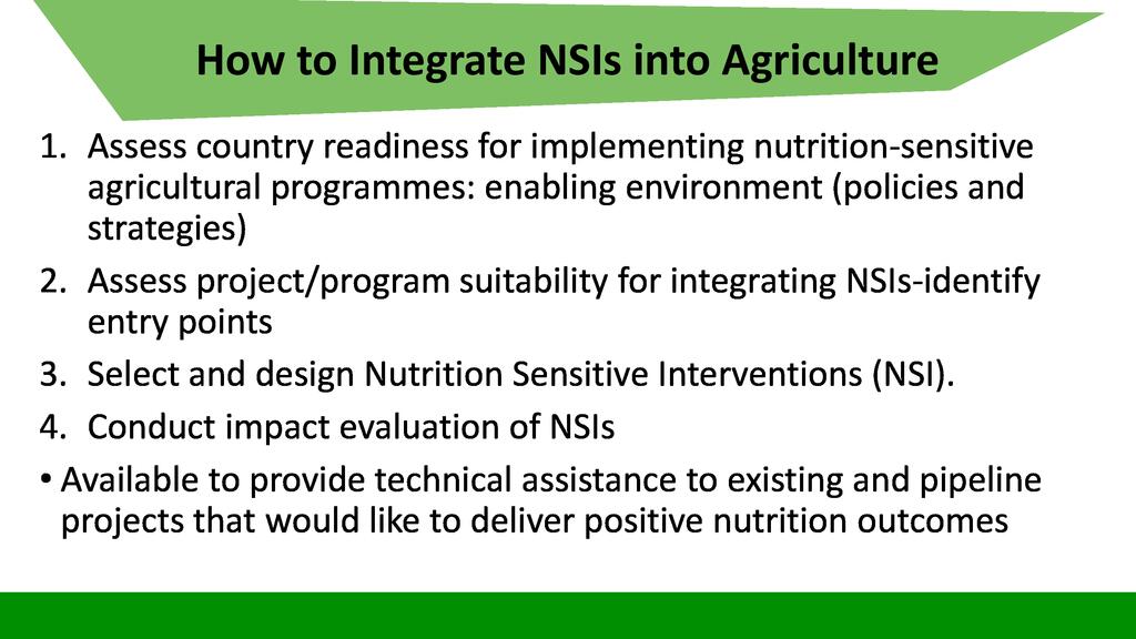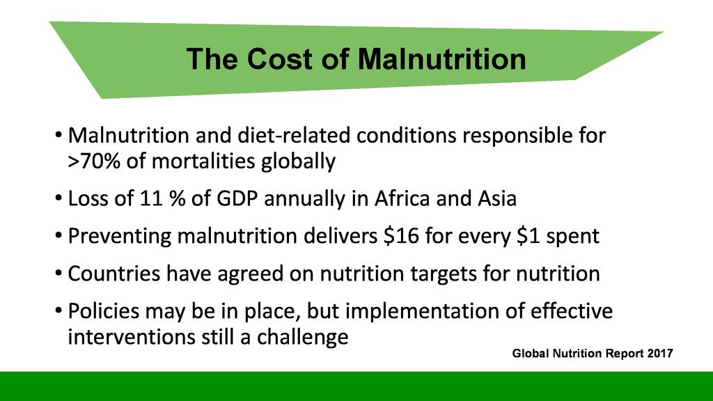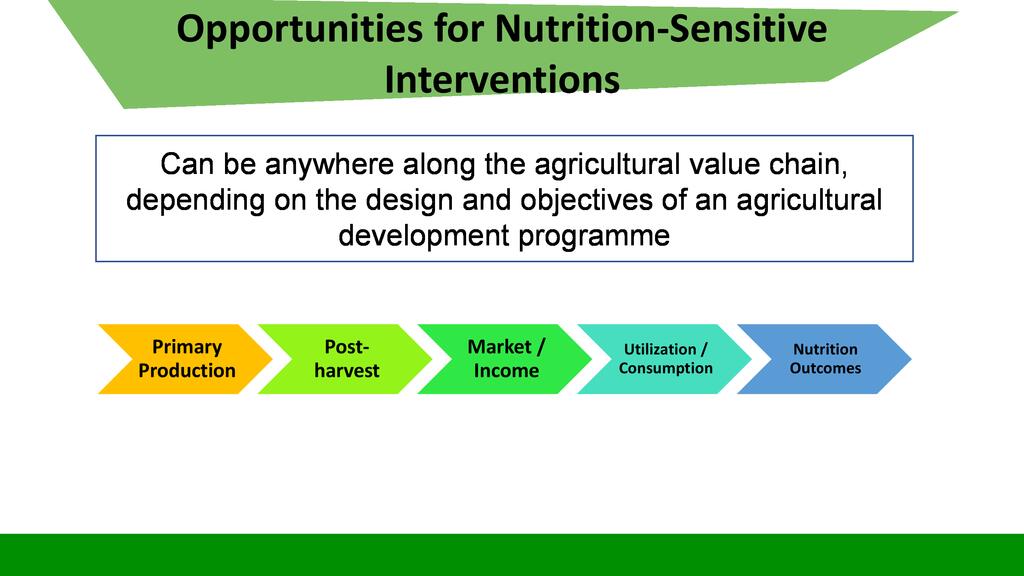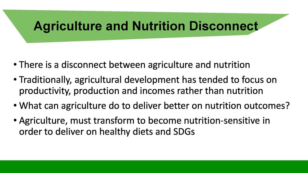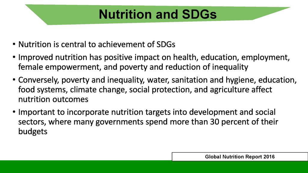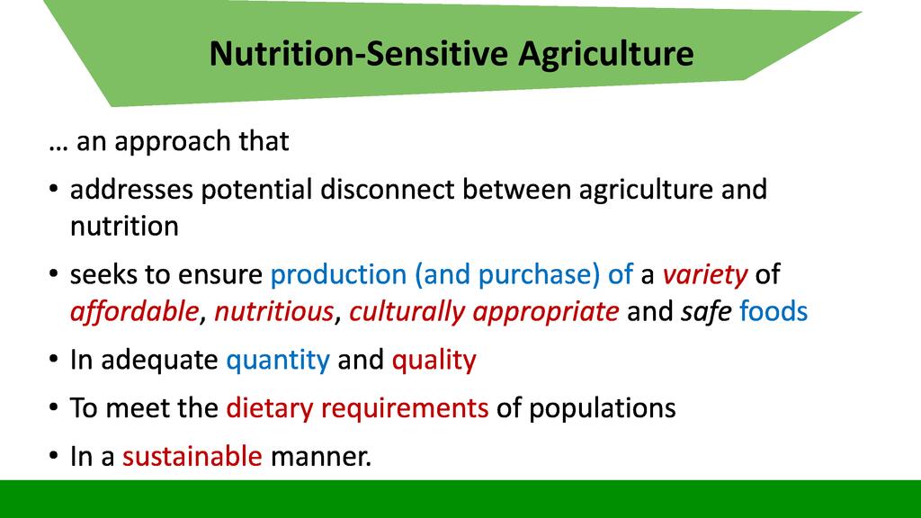 Session:  The Sustainable Development Goal number two is about Zero Hunger, achieve food security and improved nutrition and promote sustainable agriculture. To respond to this goal, stakeholders can engage themselves into activities falling into the seven targets of this goal including promotion of nutrition sensitive agriculture which is expected to reach even vulnerable individuals through increased production of nutrition dense food products.