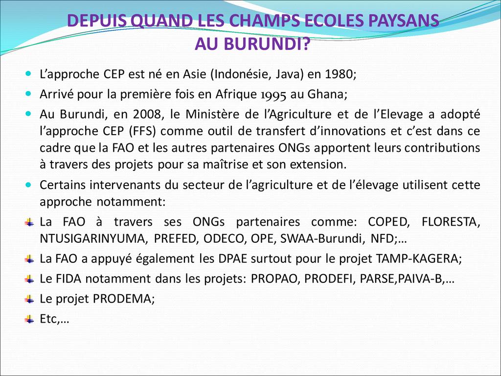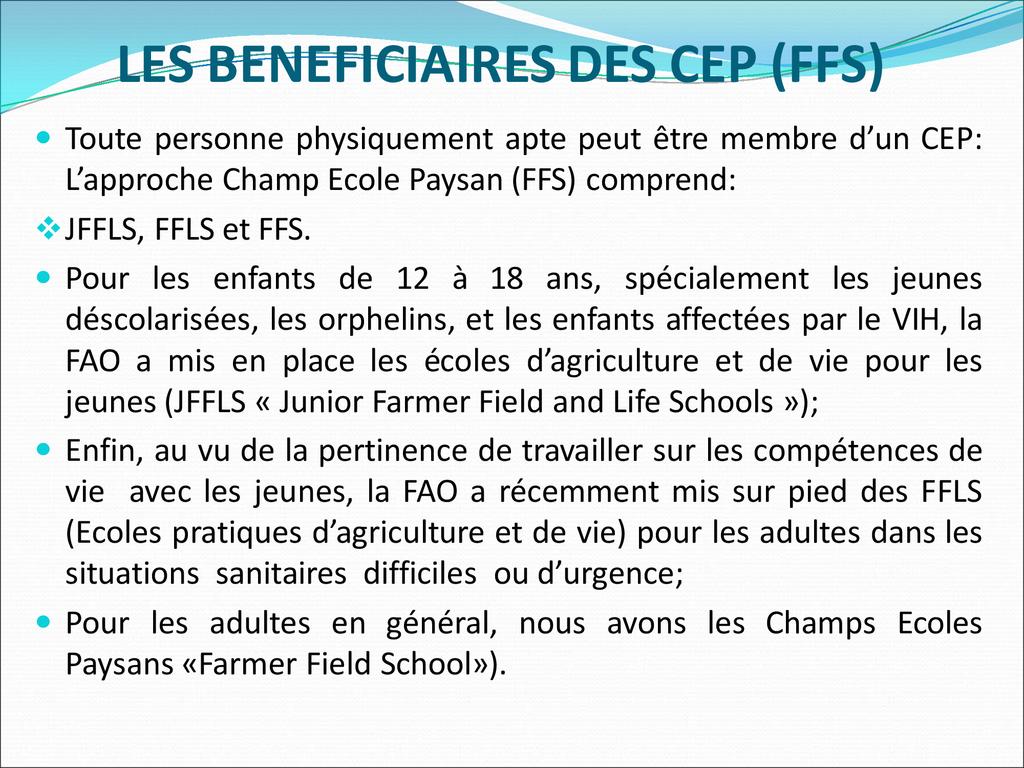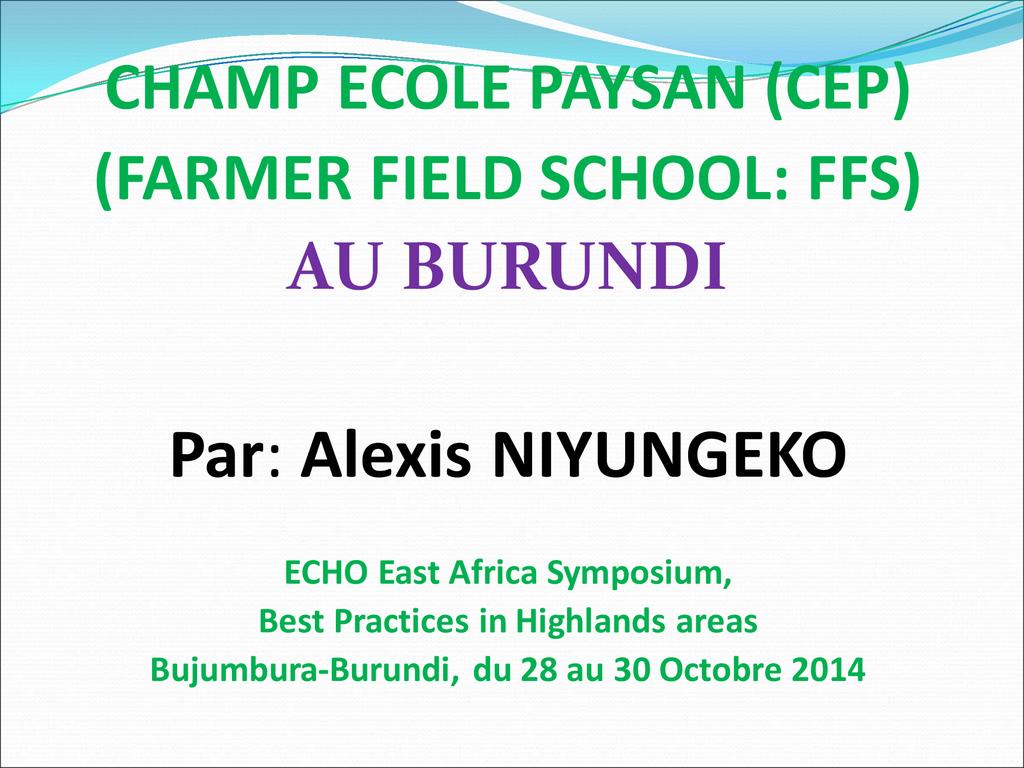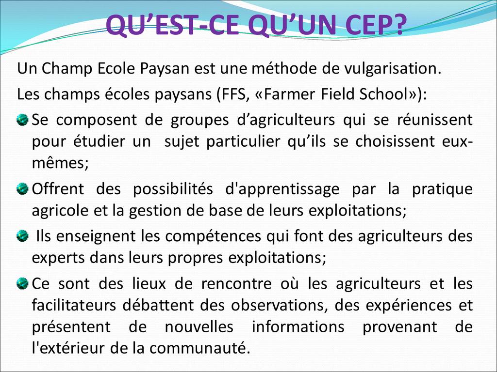 Un Champ Ecole Paysan est une méthode de vulgarisation. Les champs écoles paysans (FFS, «Farmer Field School»):