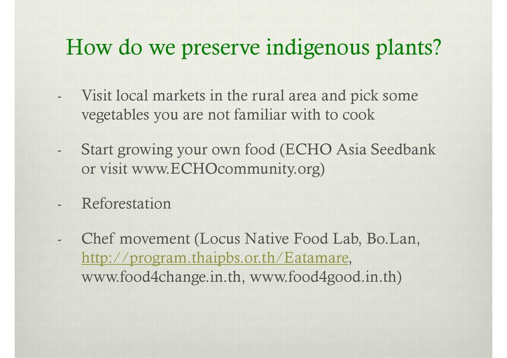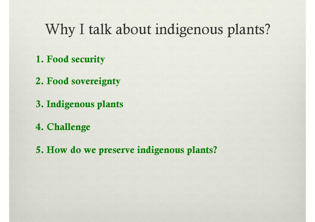 Why is local food important? We will discuss a few topics related to local food: 1) Right now, local food is a trend that includes a focus on super foods, clean food, and supplements. 2) Local food touches on food sovereignty. Do we have a choice of what we eat? 3) Indigenous plants are still being used and are important in people’s diets. 4) For all their benefits and historical uses, indigenous foods are not withouth their problems. We will discuss why indigenous plant usage is being reduced or becoming rare. 5) We will end by discussing about how do we preserve and use indigenous plants?