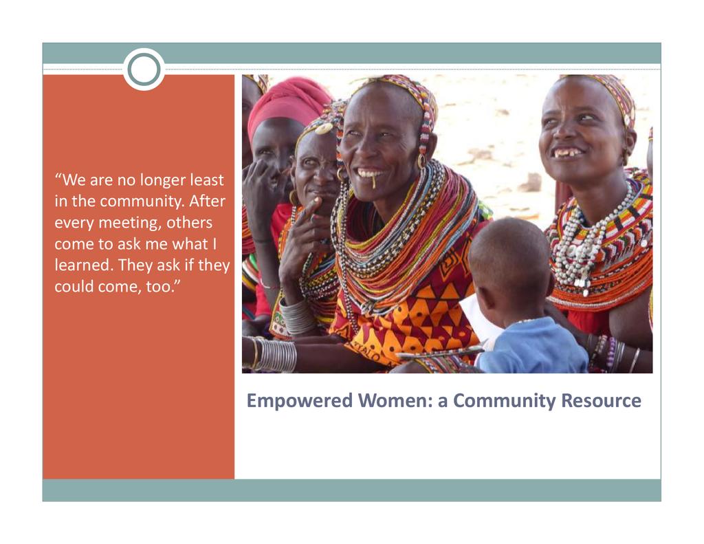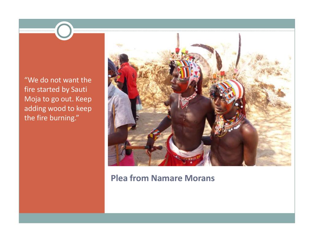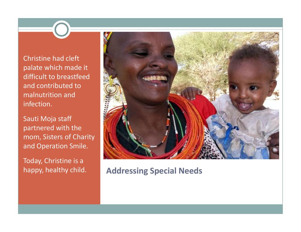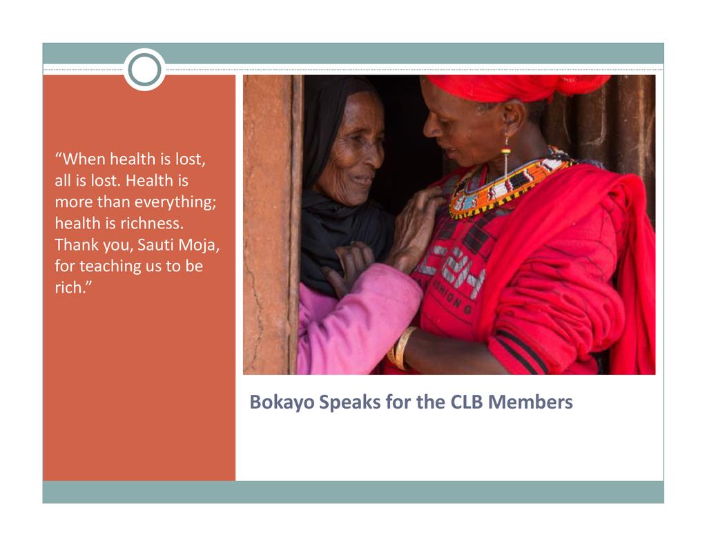 Biographical data: Fatuma Wako and Martha Bone of Marsabit, Kenya Fatuma Wako is the Family Health Coordinator of Sauti Moja Marsabit. Her training is in community health, and she has many years of health and nutrition training and monitoring in remote pastoralist communities. She provides training and health support for the vulnerable women and children in the 20+ community livestock banks that have been established as well as to rural young men and girls who have not attended school. Martha Bone is a founder of the Child Mother Program of Sauti Moja Marsabit which targets school girls who have been ostracized and unable to continue their education due to pregnancy. She was trained in community health and social work, and has many years of experience in school and community health. Her passion is vulnerable young girls and women whom she trains and mentors. (In addition, she is Program Coordinator of the 1000 Widows Initiative.)