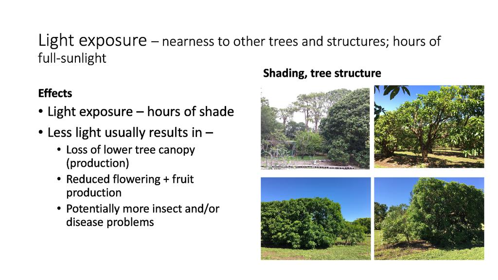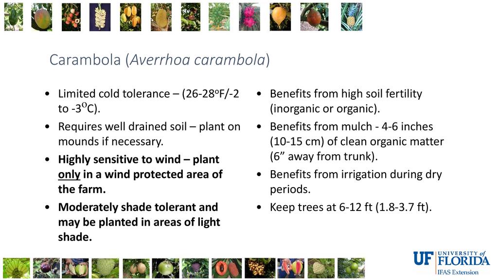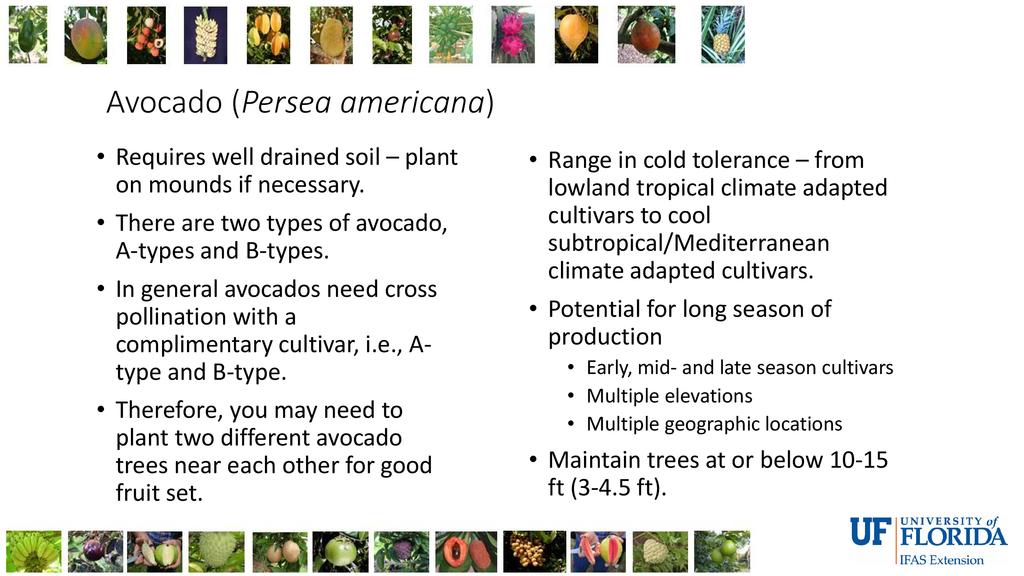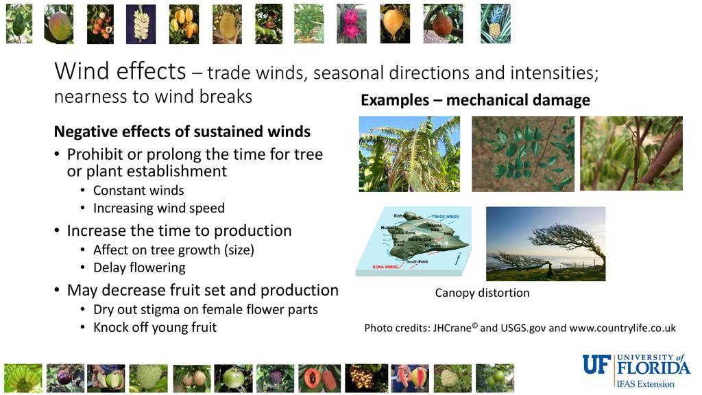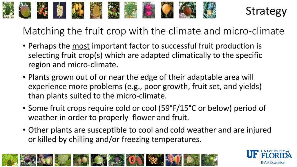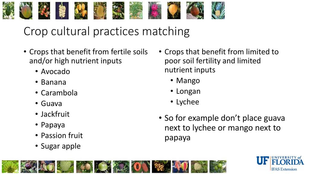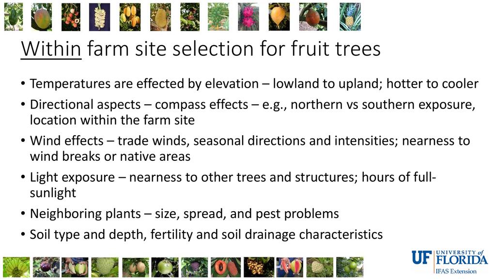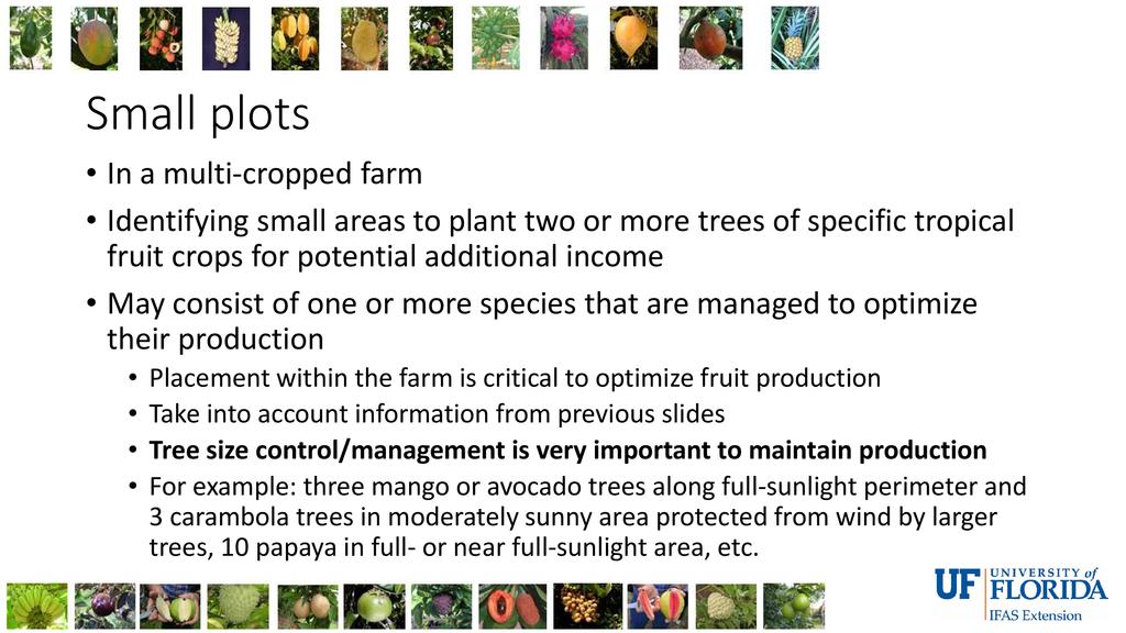 Topics to be presented include, matching the tropical and subtropical fruit crops to local environmental conditions as well as plant space and size management and low-input cultural practices for small holdings (nutrient, water, and pruning). Simple tactics for potential off-season cropping will also be discussed.