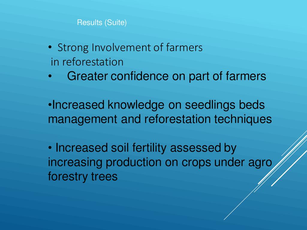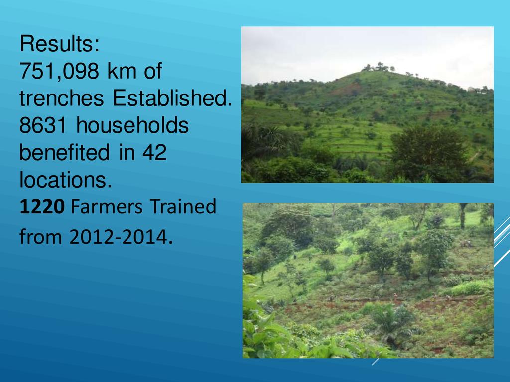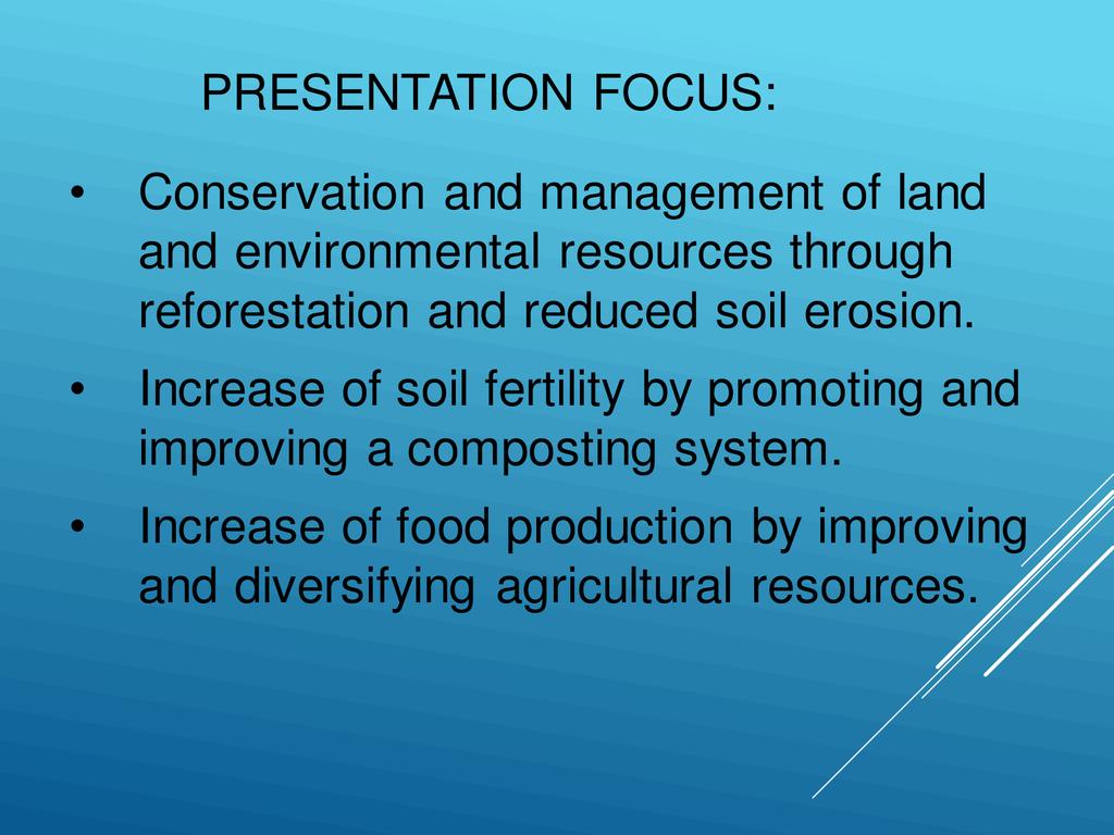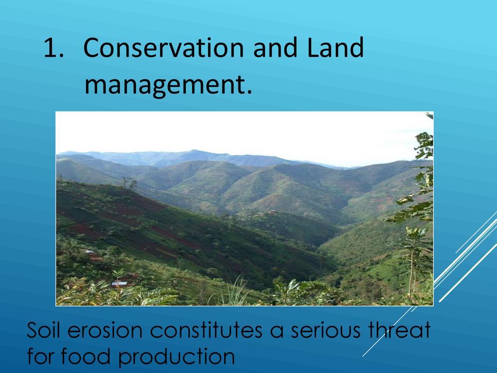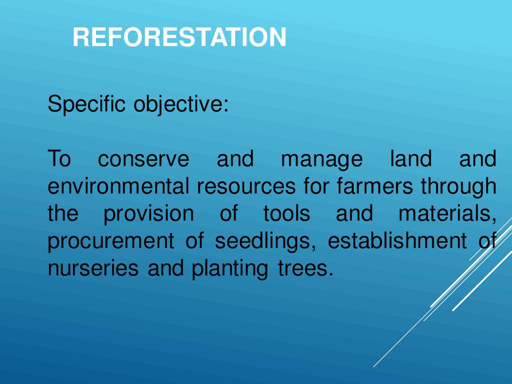 • Conservation and management of land and environmental resources through reforestation and reduced soil erosion.