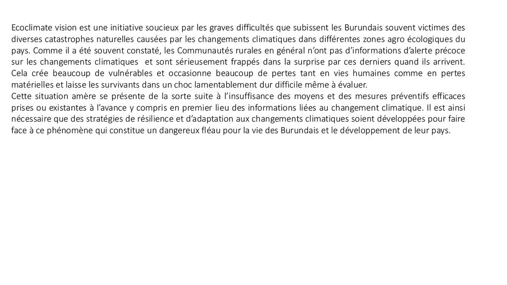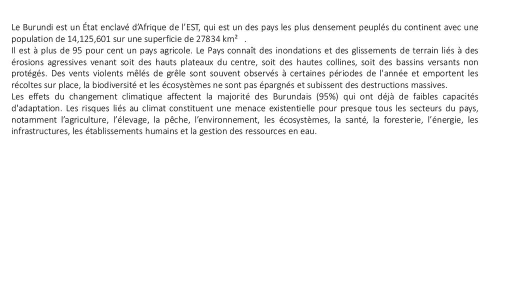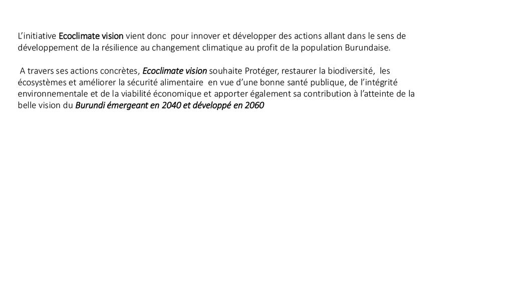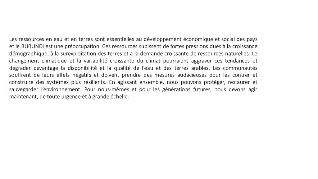 Les ressources en eau et en terres sont essentielles au développement économique et social des pays et le BURUNDI est une préoccupation. Ces ressources subissent de fortes pressions dues à la croissance démographique, à la surexploitation des terres et à la demande croissante de ressources naturelles. Le changement climatique et la variabilité croissante du climat pourraient aggraver ces tendances et dégrader davantage la disponibilité et la qualité de l’eau et des terres arables. Les communautés souffrent de leurs effets négatifs et doivent prendre des mesures audacieuses pour les contrer et construire des systèmes plus résilients. En agissant ensemble, nous pouvons protéger, restaurer et sauvegarder l’environnement. Pour nous-mêmes et pour les générations futures, nous devons agir maintenant, de toute urgence et à grande échelle.