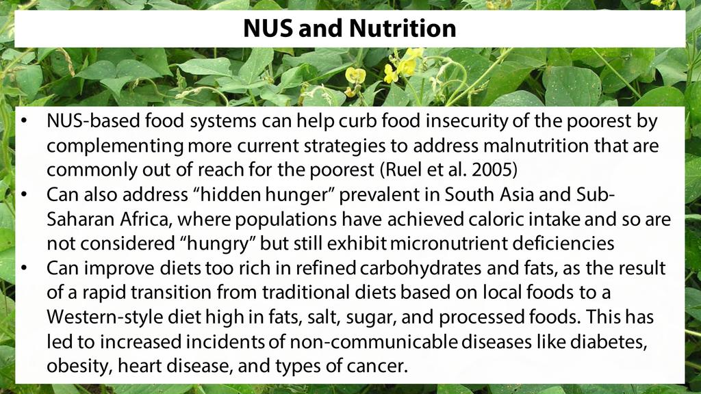 This topic discusses neglected and underutilized plant species further, particularly as they relate to agriculture, gender, biodiversity, and nutrition and how they can be utilized by communities and farmers.