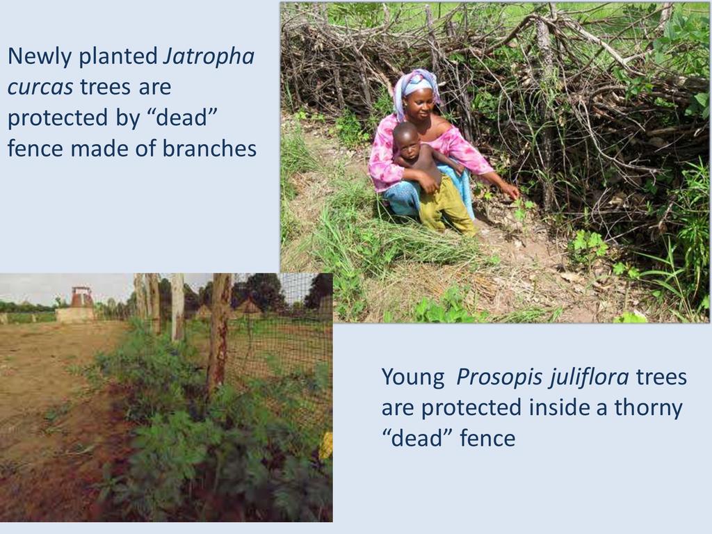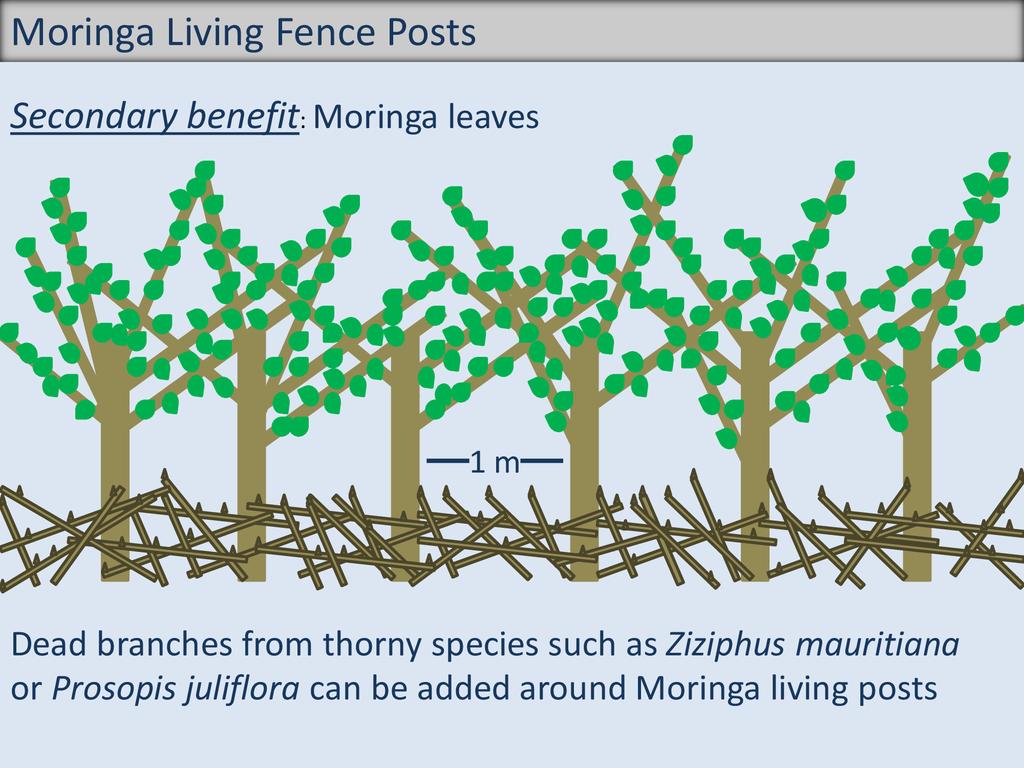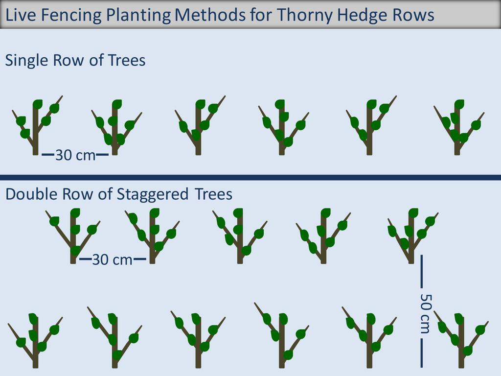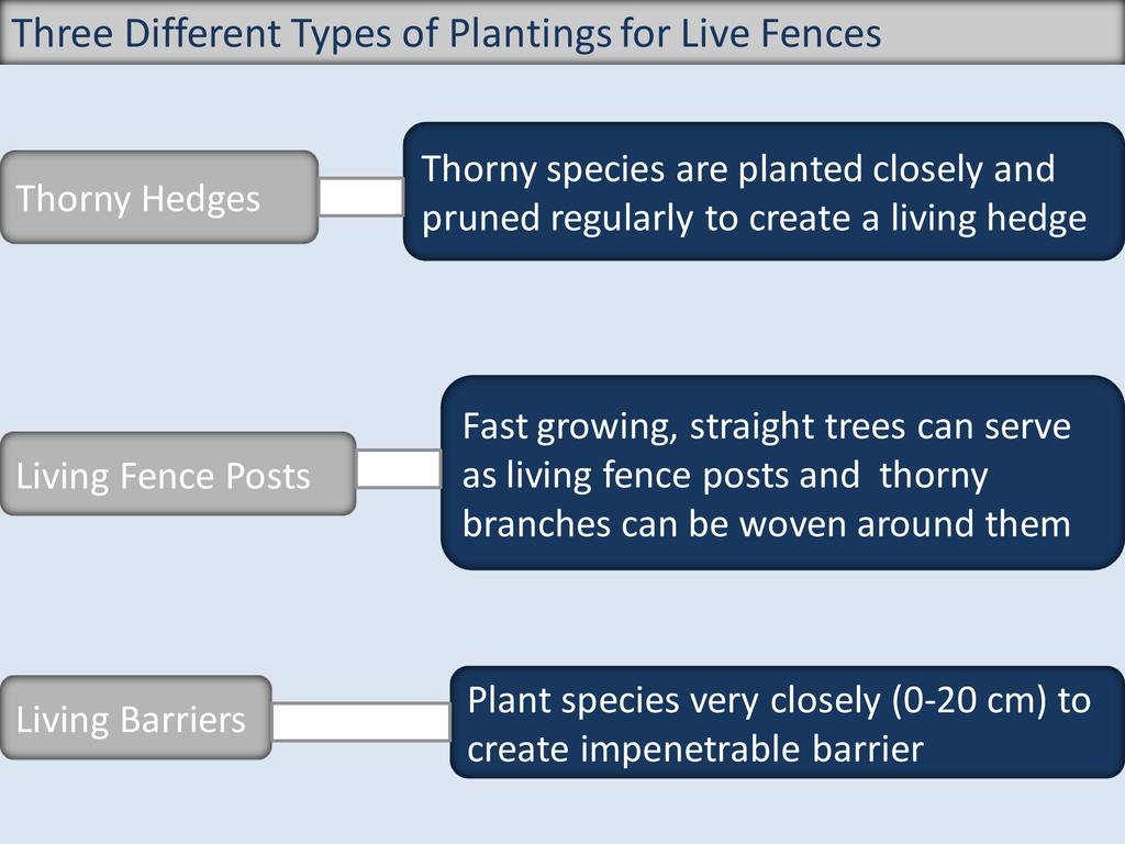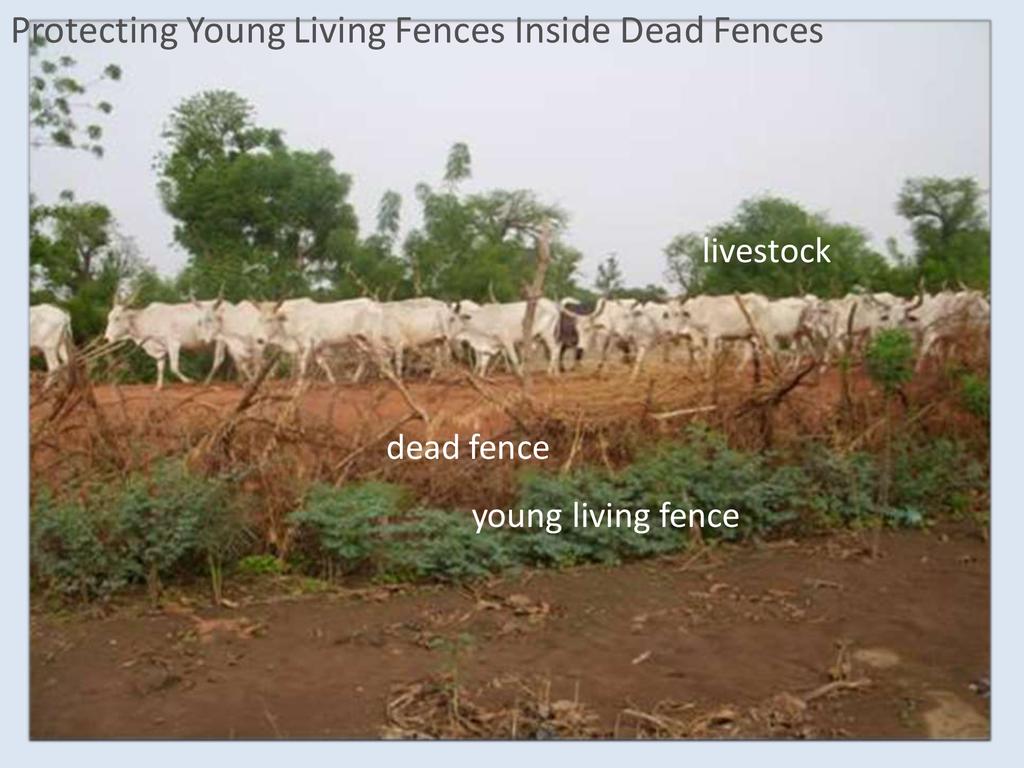 Successfully developing and maintaining live fences can be both challenging and beneficial. Densely-planted native or well-adapted thorny shrubs can be planted around fields to keep out livestock. Some species also have secondary benefits including fruit fodder production. These fences also protect soil from erosion.