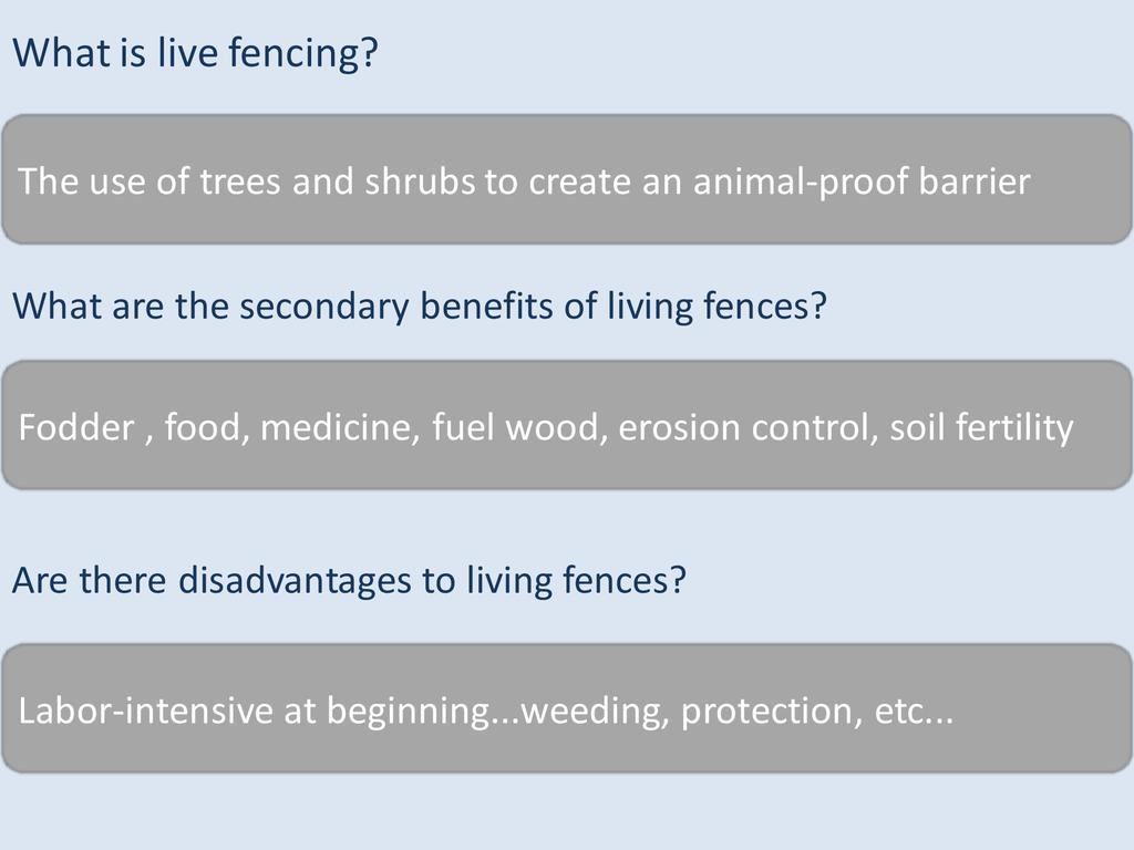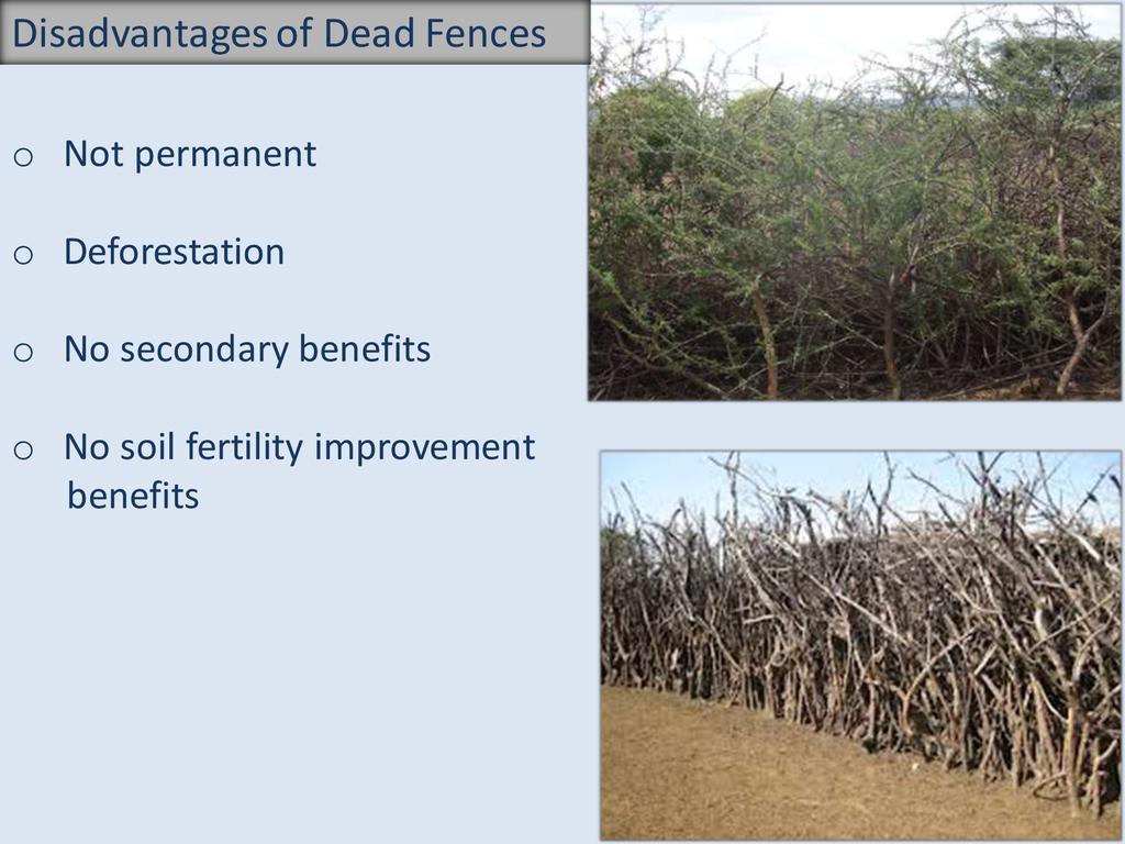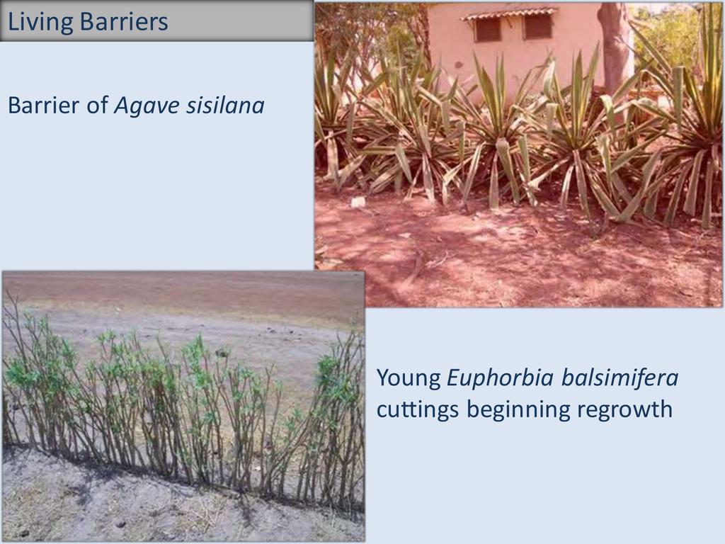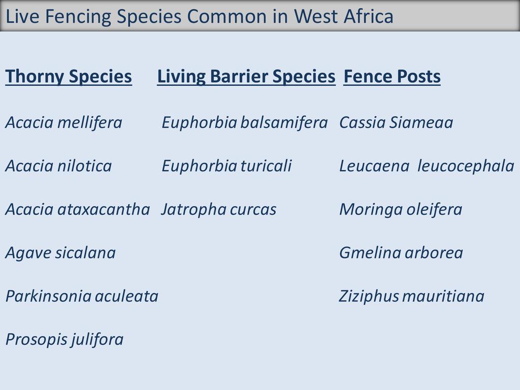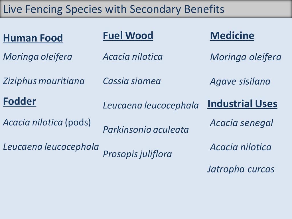 Successfully developing and maintaining live fences can be both challenging and beneficial. Densely-planted native or well-adapted thorny shrubs can be planted around fields to keep out livestock. Some species also have secondary benefits including fruit fodder production. These fences also protect soil from erosion.