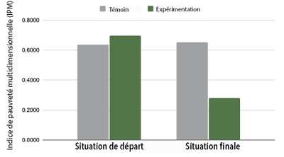 Figure 15. Résultats de l’analyse DiD du programme Plant With Purpose en RDC. Les diagrammes à barres montrent l’évolution de l’Indice de Pauvreté Multidimensionnelle (IPM) entre la situation de départ et la situation finale, pour un bassin versant d’expérimentation et un bassin versant témoin.